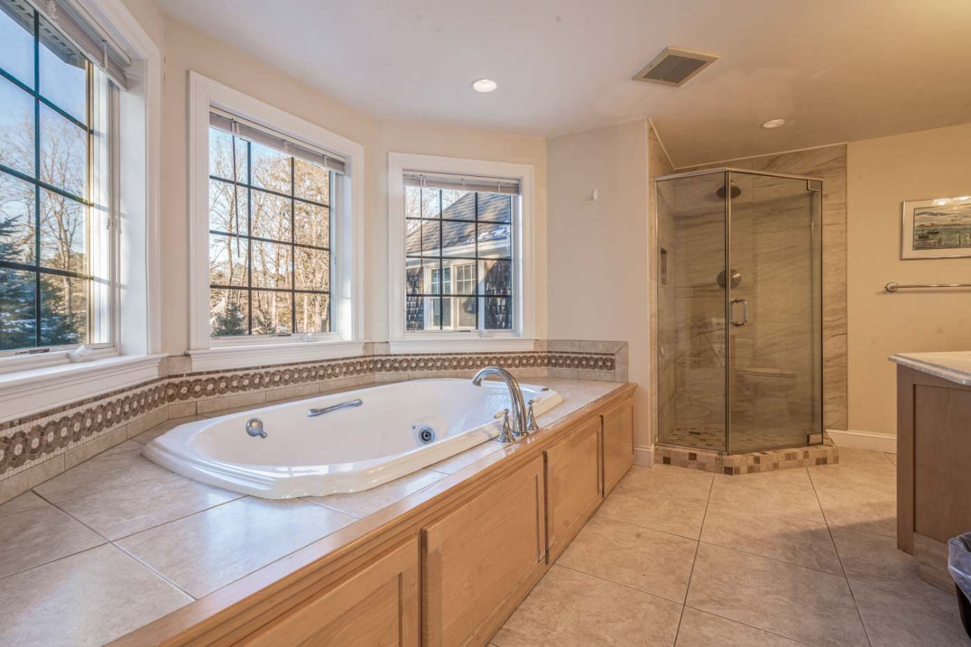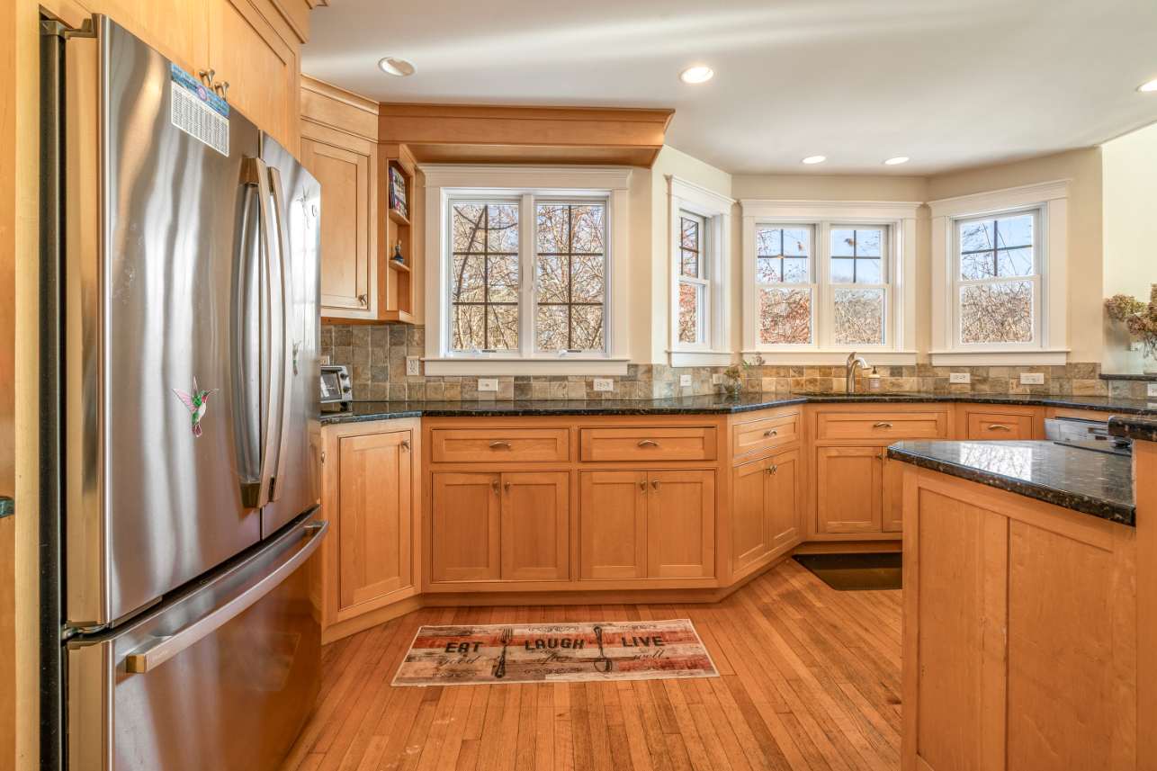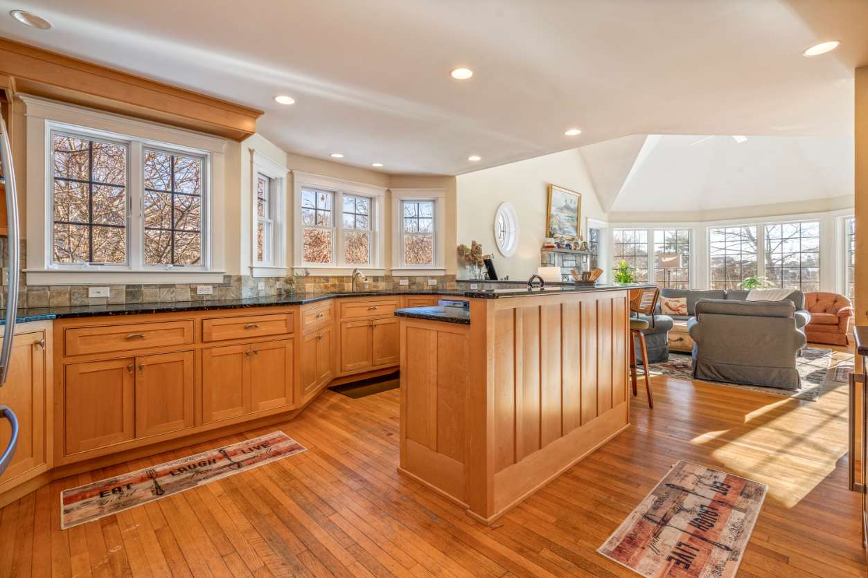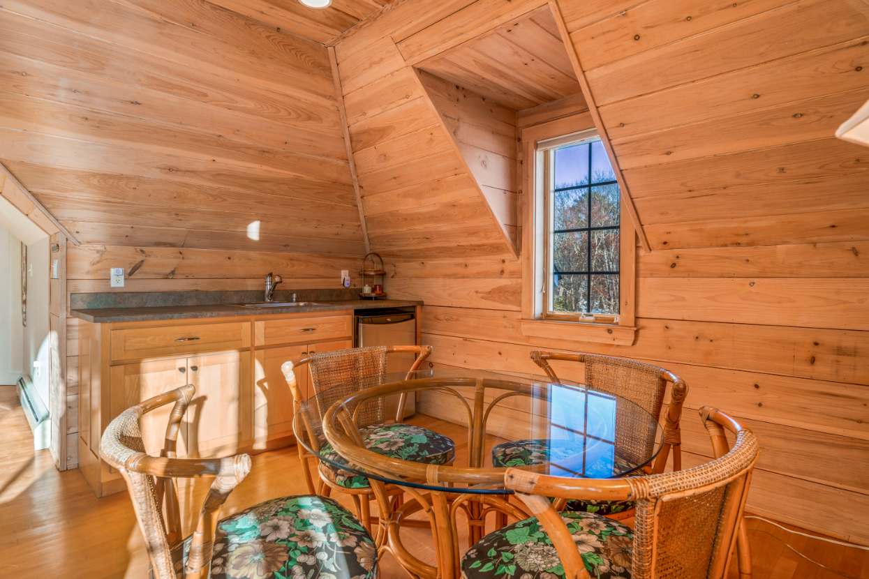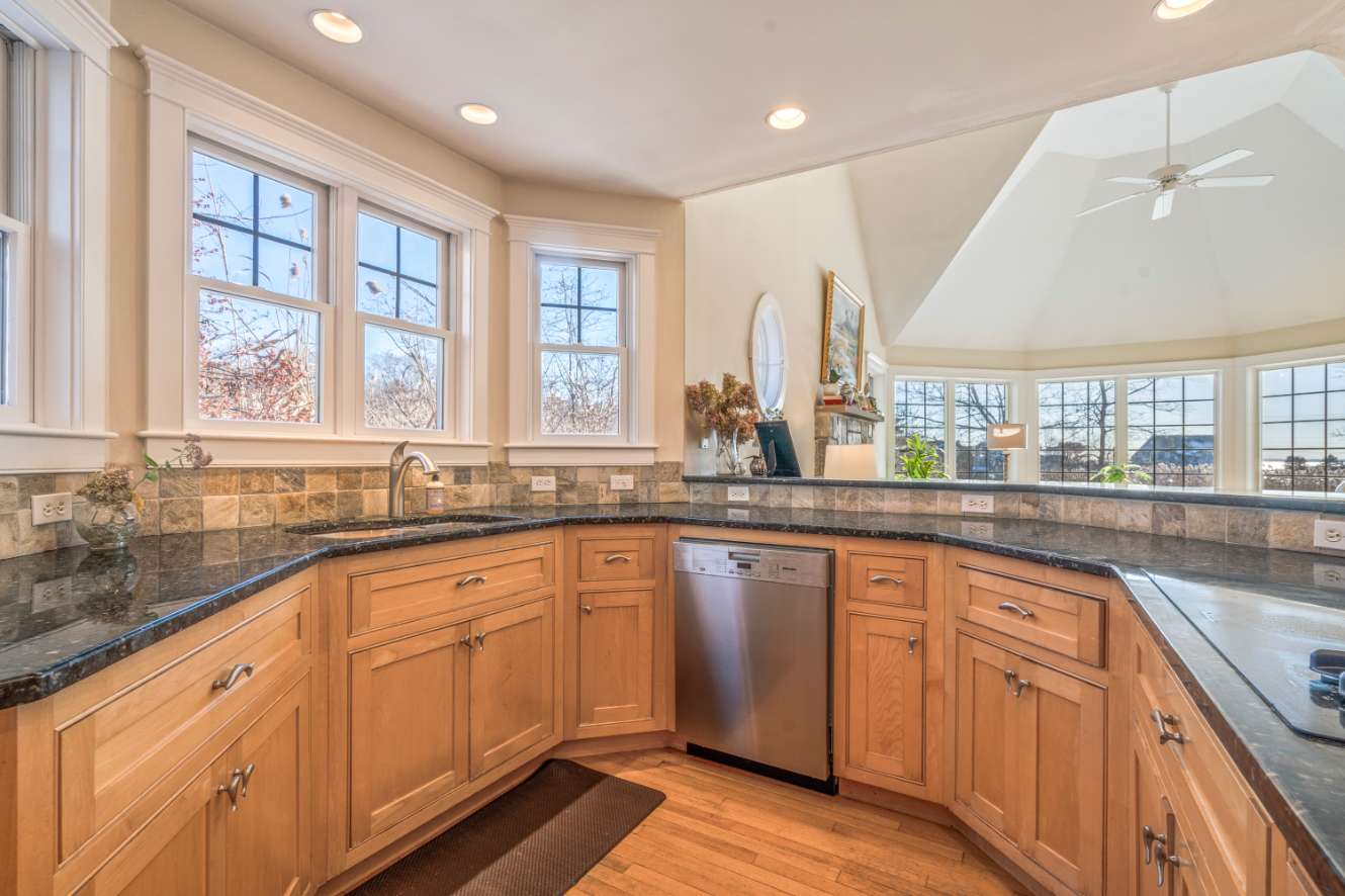 The warm, spacious kitchen invites you to cook and gather, featuring stainless steel appliances, expansive countertops, and a generous spread of windows that frame the daylight. Brew Nespresso (bring your own pods!) or drip coffee, pull up a stool at the counter seating for three, or share meals at the dining table for eight—ideal for family meals or lively dinner parties.