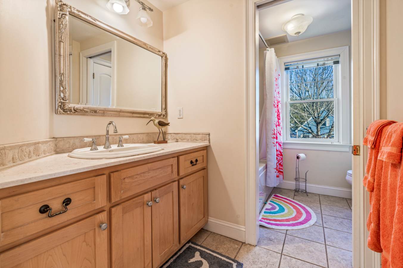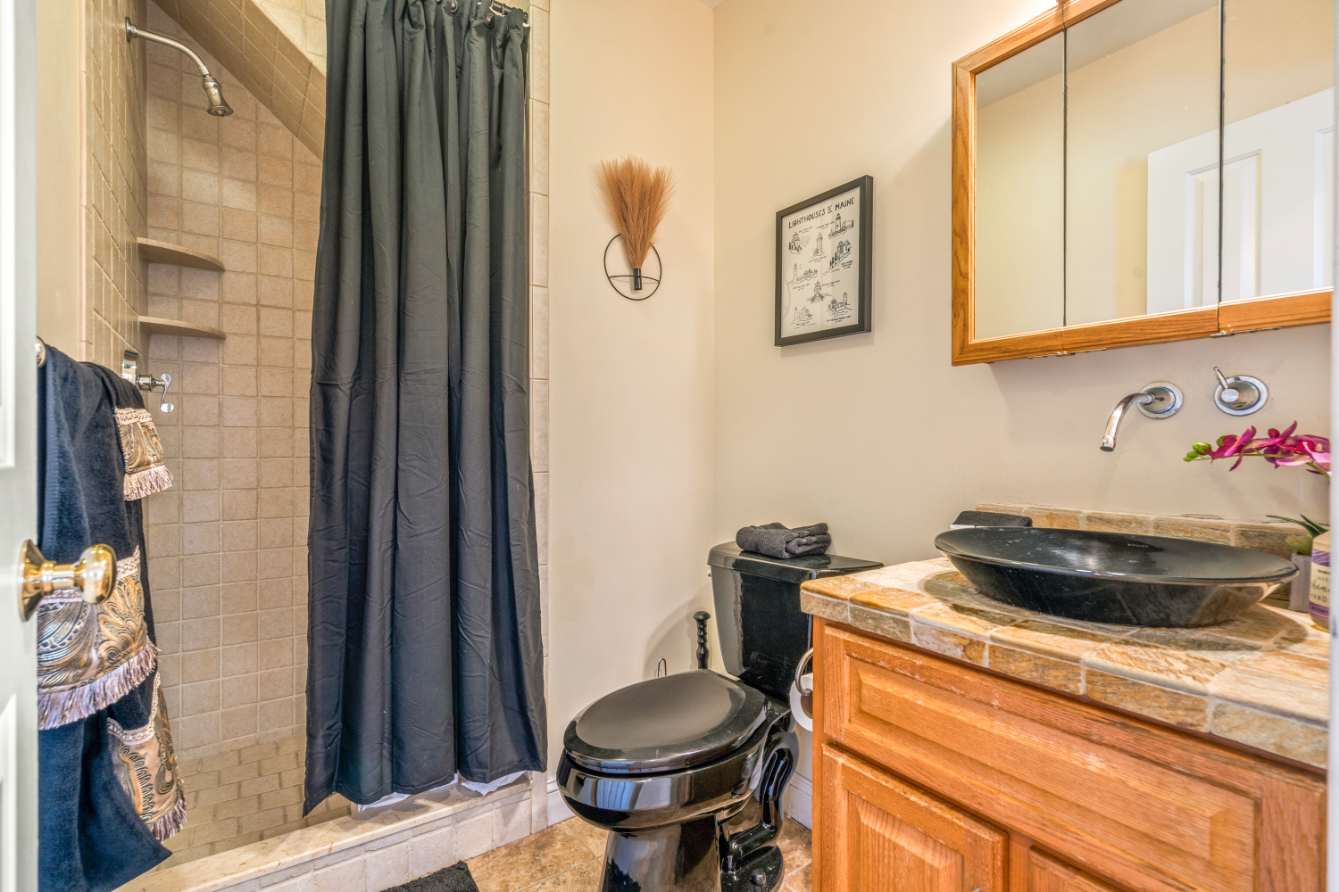 The home also includes 2 full guest bathrooms; one with a single vanity and a walk-in shower, another with a single vanity and a shower/tub combo.