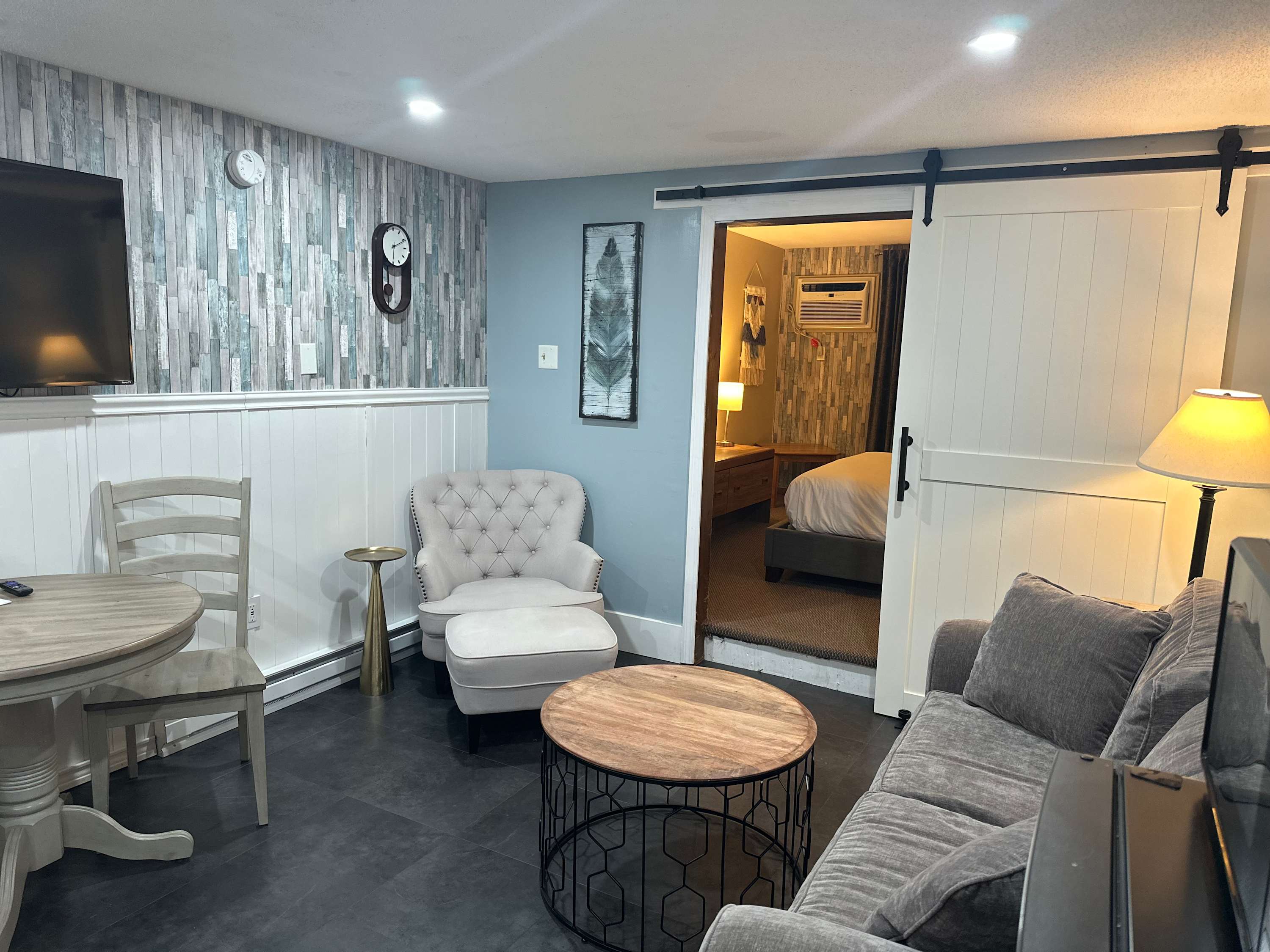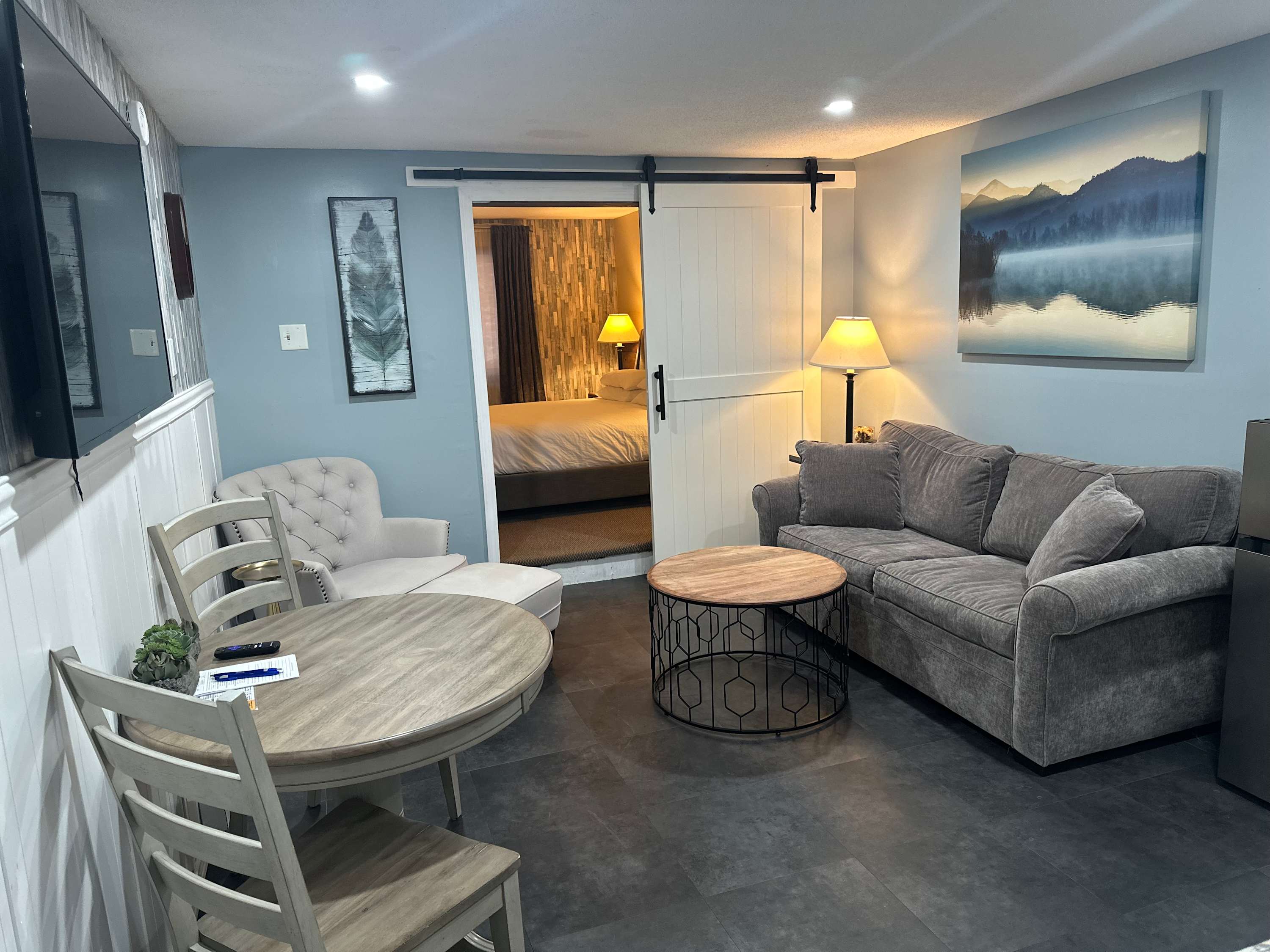 Inside, White Mountain Forest Retreat offers a peaceful and practical space designed for both downtime and exploration. A small kitchenette comes stocked with the essentials for snacks, simple meals, or morning coffee, while the adjacent bistro-style dining table provides a cozy spot to eat, work, or plan the day. The living area includes a comfy sofa and smart TV for evening unwinding. In a thoughtful, hotel-inspired layout, the vanity sits outside the shower room, providing extra space to spread out while getting ready.