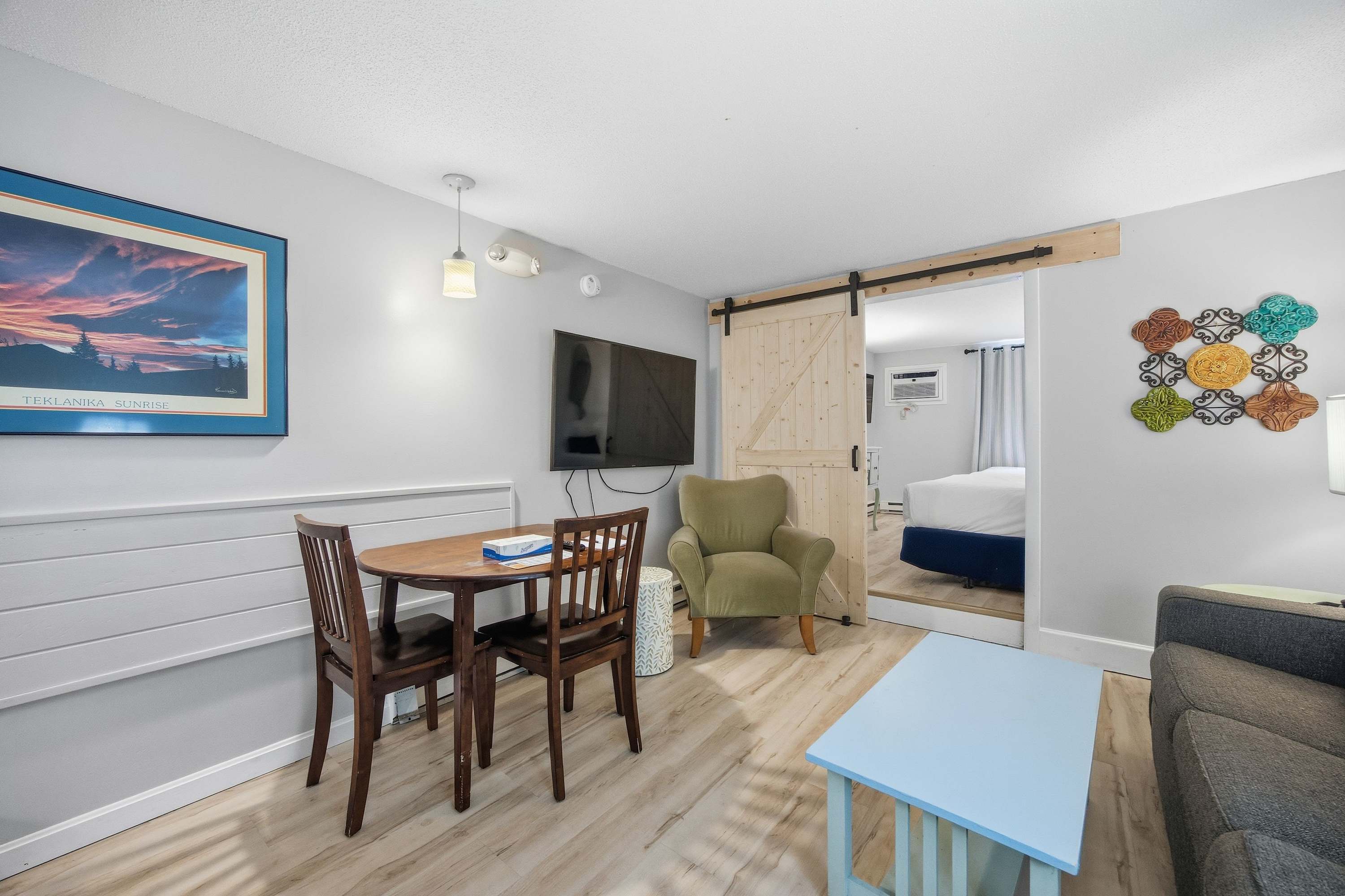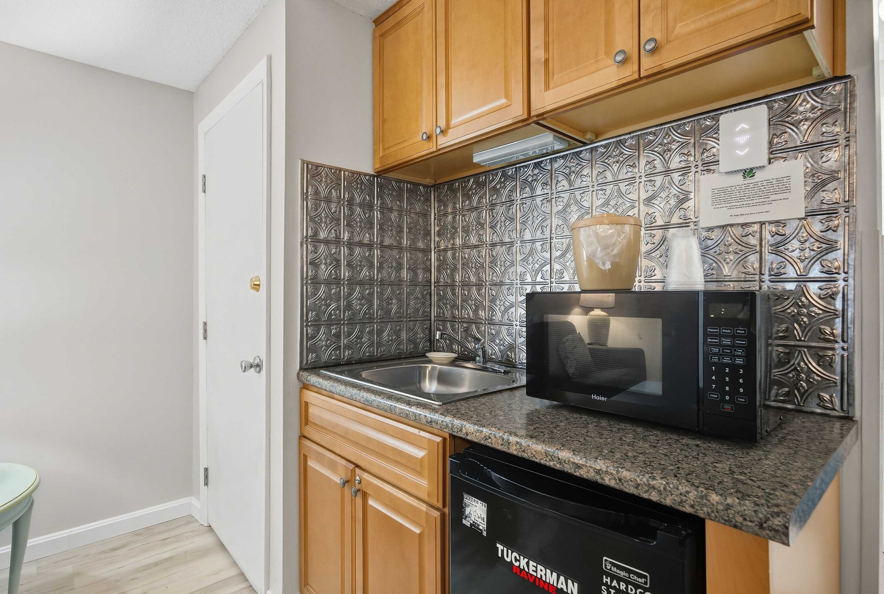 When you stay at Peaked Mountain Escape, you’ll embrace a calm and cozy atmosphere, ideal for both adventure-filled getaways and relaxing retreats. The open layout flows together seamlessly, with a small dining area and kitchenette—equipped with a microwave, coffee maker, mini-fridge, and some dinnerware essentials—and an inviting living area with a comfortable couch and a smart TV to access your favorite shows as you unwind after a day of exploring. This modern, hotel-style setting hosts the bathroom sink in the hall area, offering extra space and easy access for getting ready.