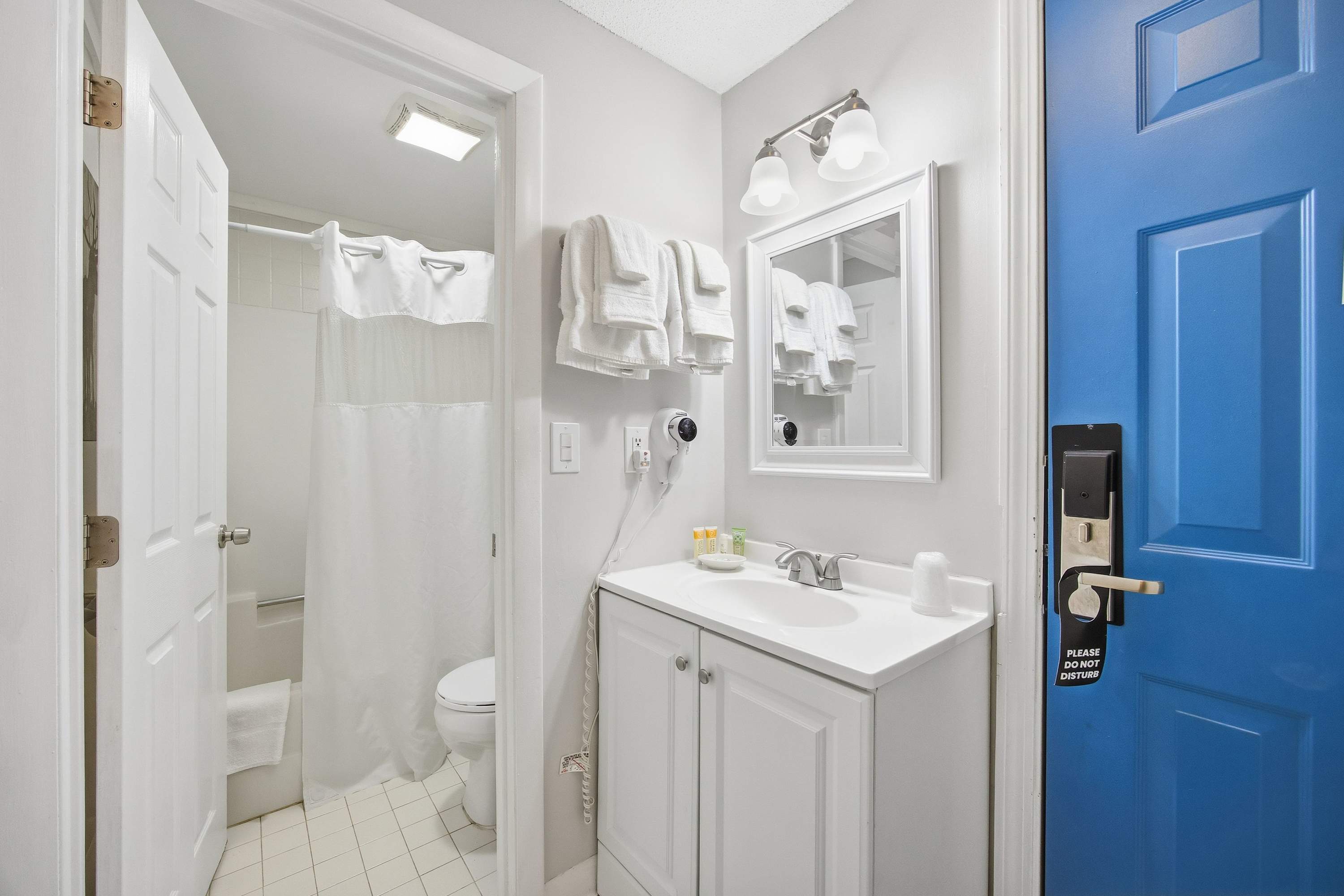 This unit also includes a full guest bathroom with a single vanity and a shower/tub combo.