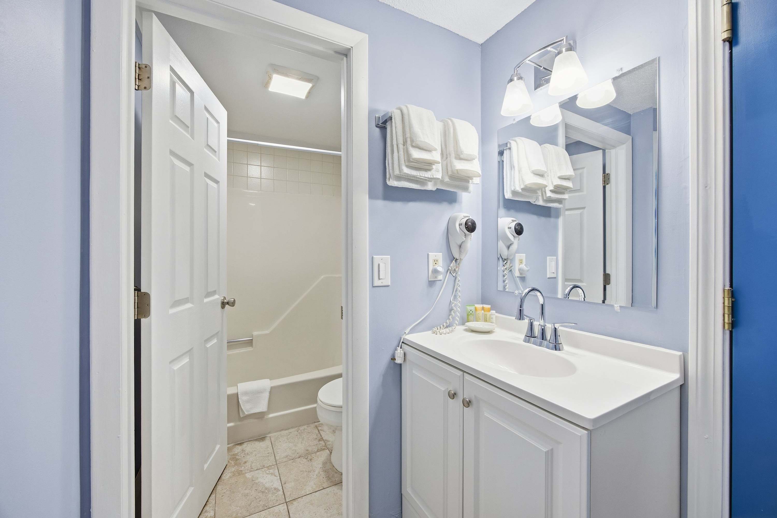This unit also includes a full guest bathroom with a single vanity and a shower/tub combo.