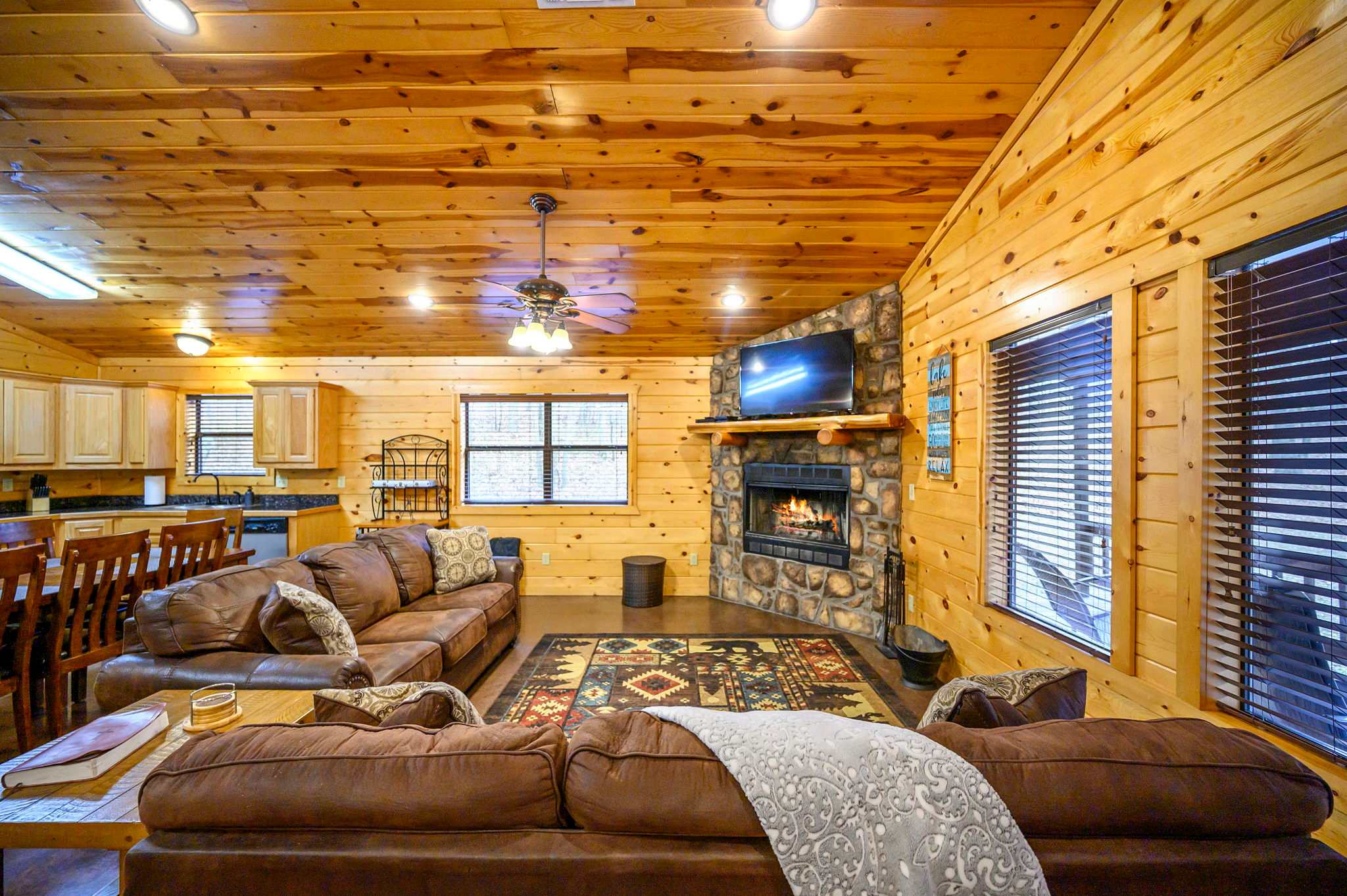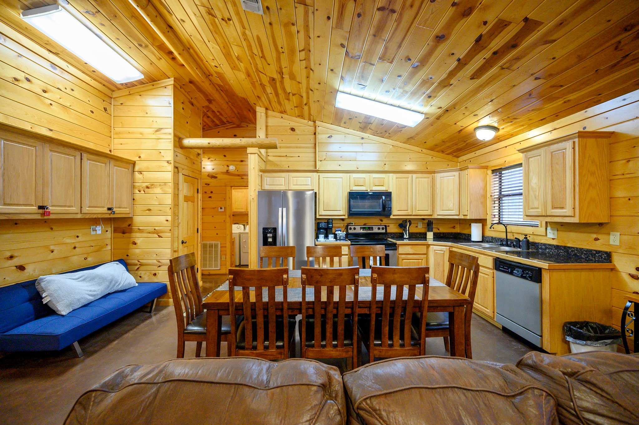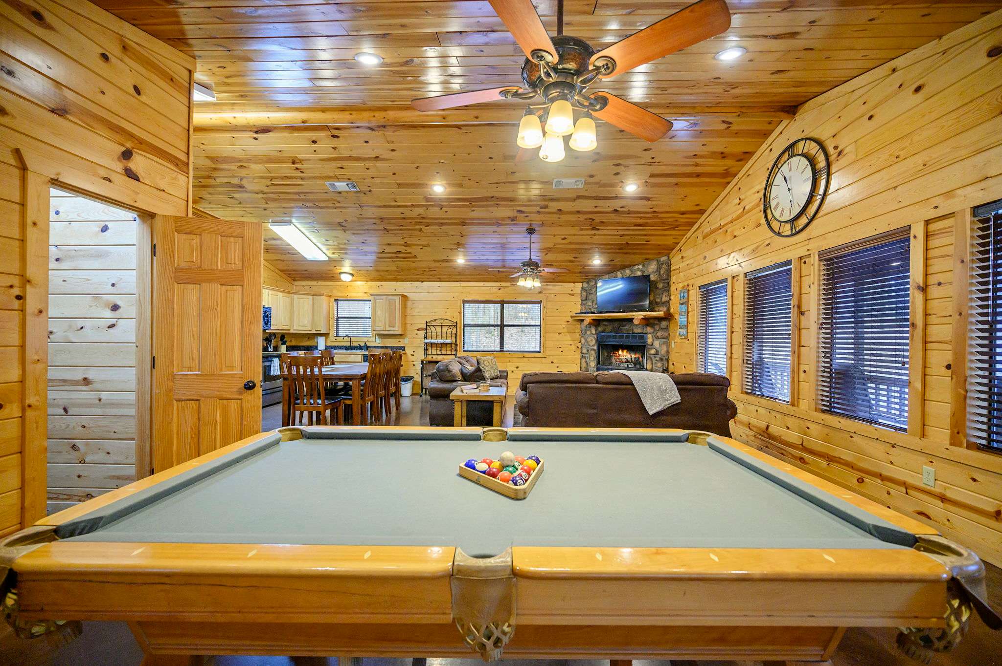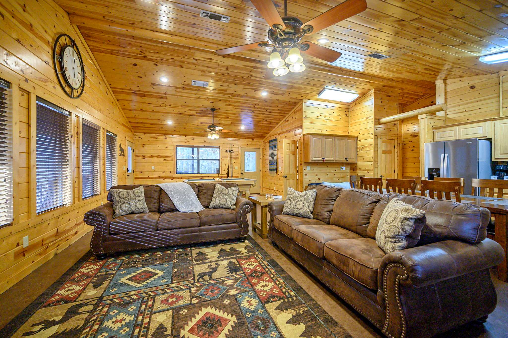 Step inside to a warm and rustic living space that feels both cozy and welcoming. Large windows fill the room with natural light, framing views of the trees while two oversized sofas invite you to settle in beside the wood-burning fireplace. A pool table near the entry and a selection of board games add to the carefree cabin atmosphere. The fully equipped kitchen features warm oak cabinetry, a Keurig/traditional combo coffee maker, and everything needed for family meals, which can be enjoyed at the dining table for eight.