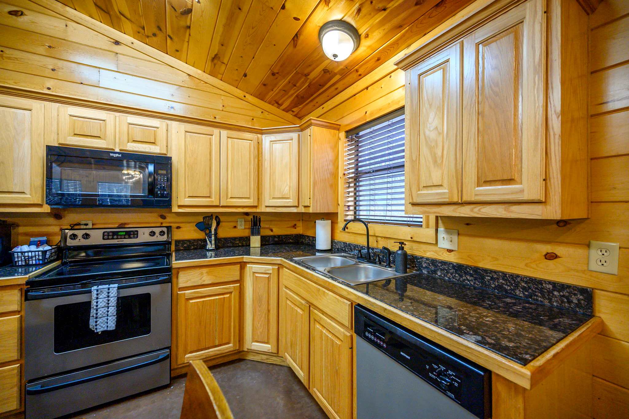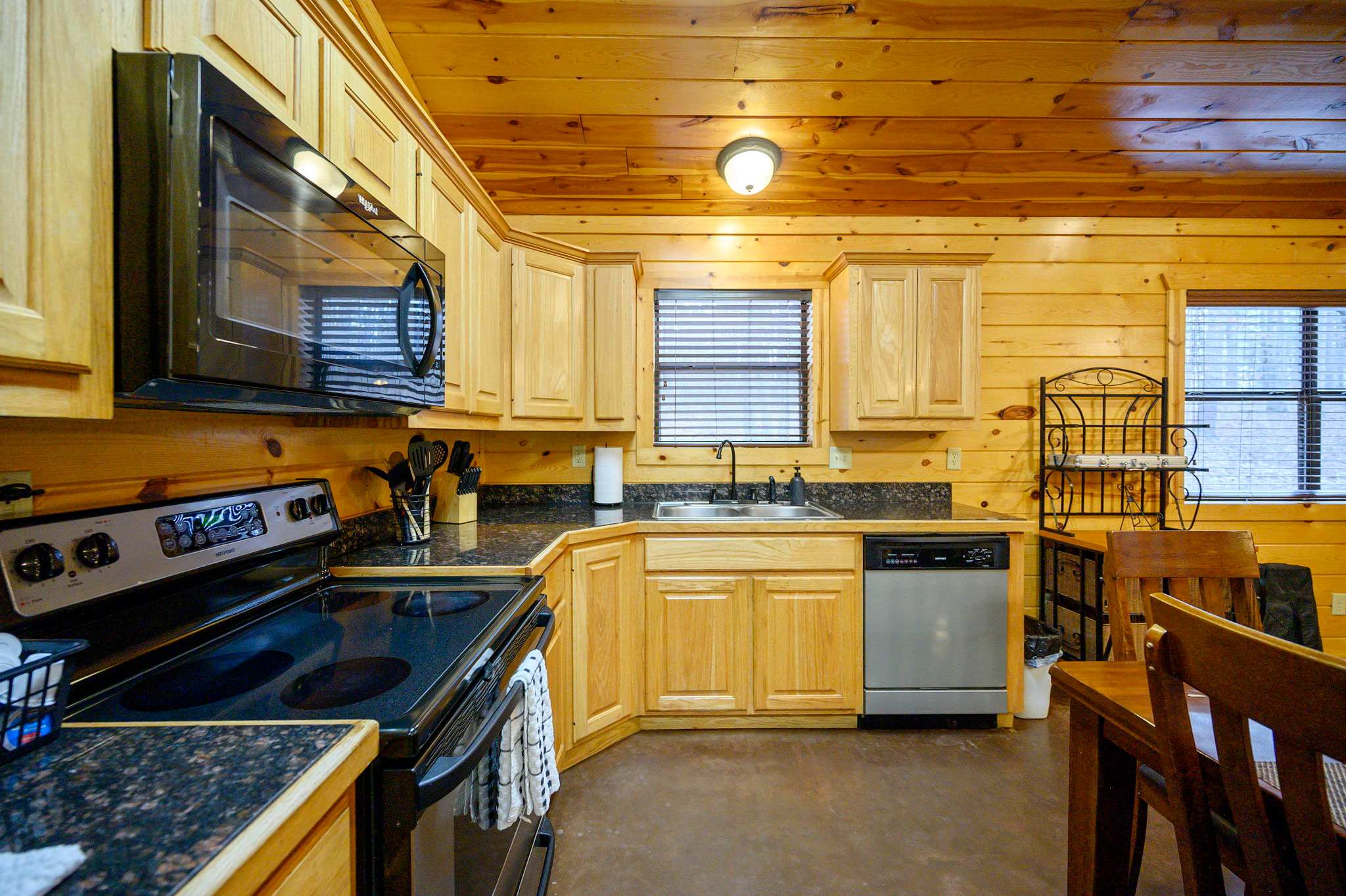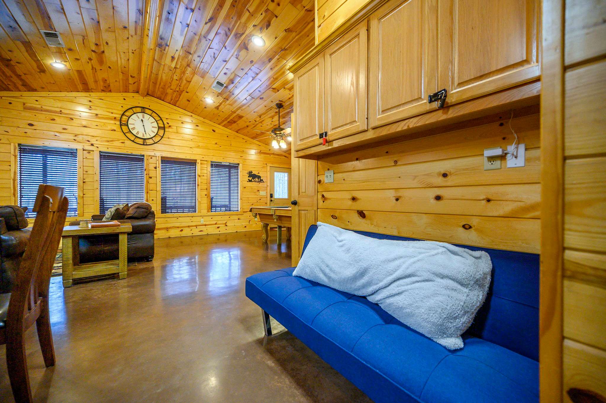 Step inside to a warm and rustic living space that feels both cozy and welcoming. Large windows fill the room with natural light, framing views of the trees while two oversized sofas invite you to settle in beside the wood-burning fireplace. A pool table near the entry and a selection of board games add to the carefree cabin atmosphere. The fully equipped kitchen features warm oak cabinetry, a Keurig/traditional combo coffee maker, and everything needed for family meals, which can be enjoyed at the dining table for eight.
