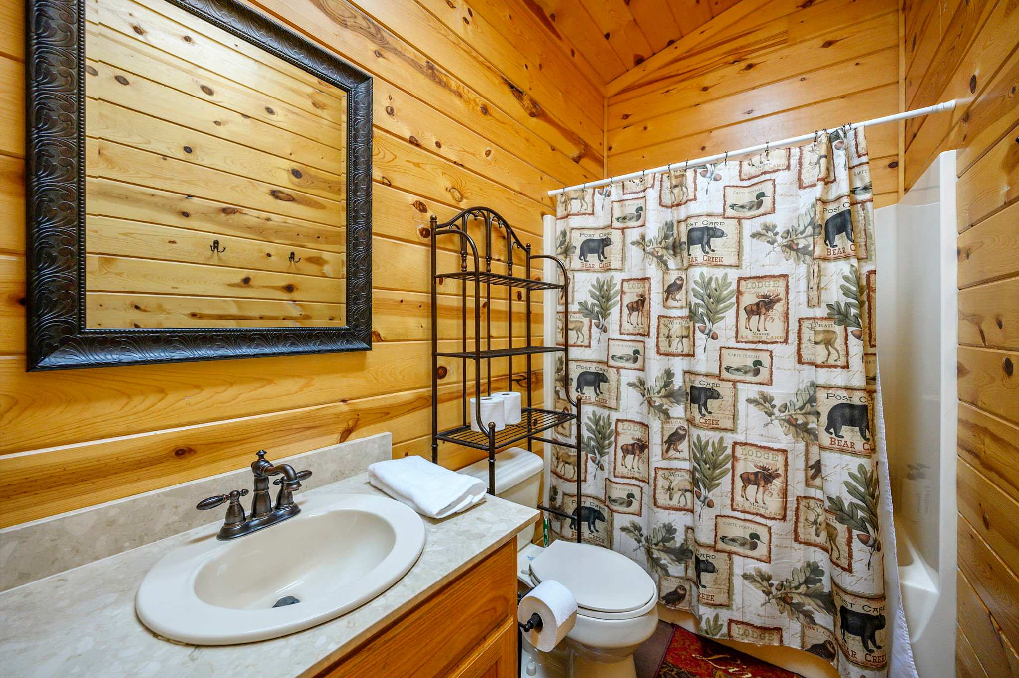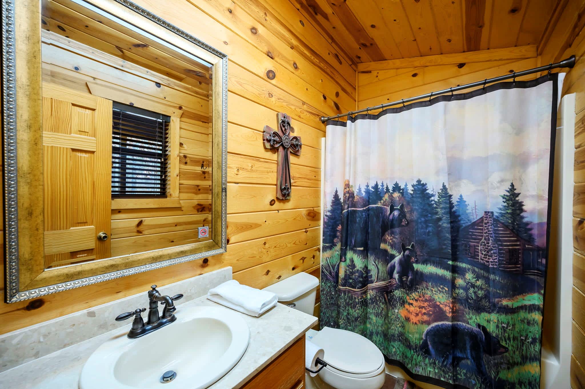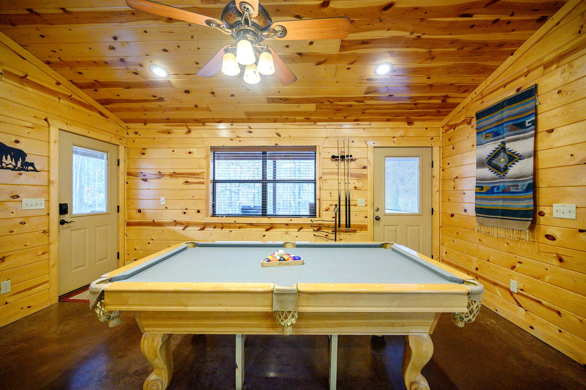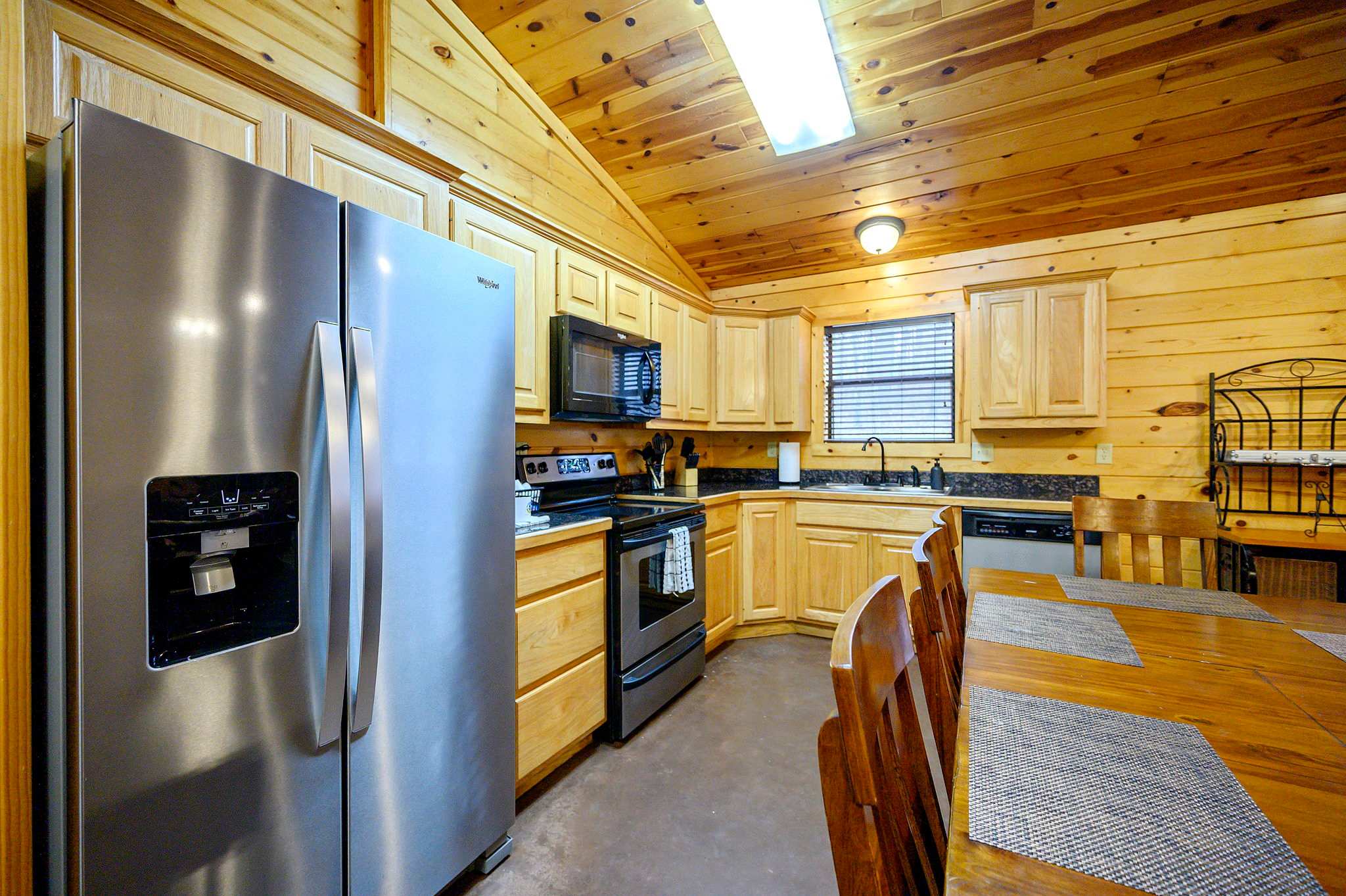 Step inside to a warm and rustic living space that feels both cozy and welcoming. Large windows fill the room with natural light, framing views of the trees while two oversized sofas invite you to settle in beside the wood-burning fireplace. A pool table near the entry and a selection of board games add to the carefree cabin atmosphere. The fully equipped kitchen features warm oak cabinetry, a Keurig/traditional combo coffee maker, and everything needed for family meals, which can be enjoyed at the dining table for eight.