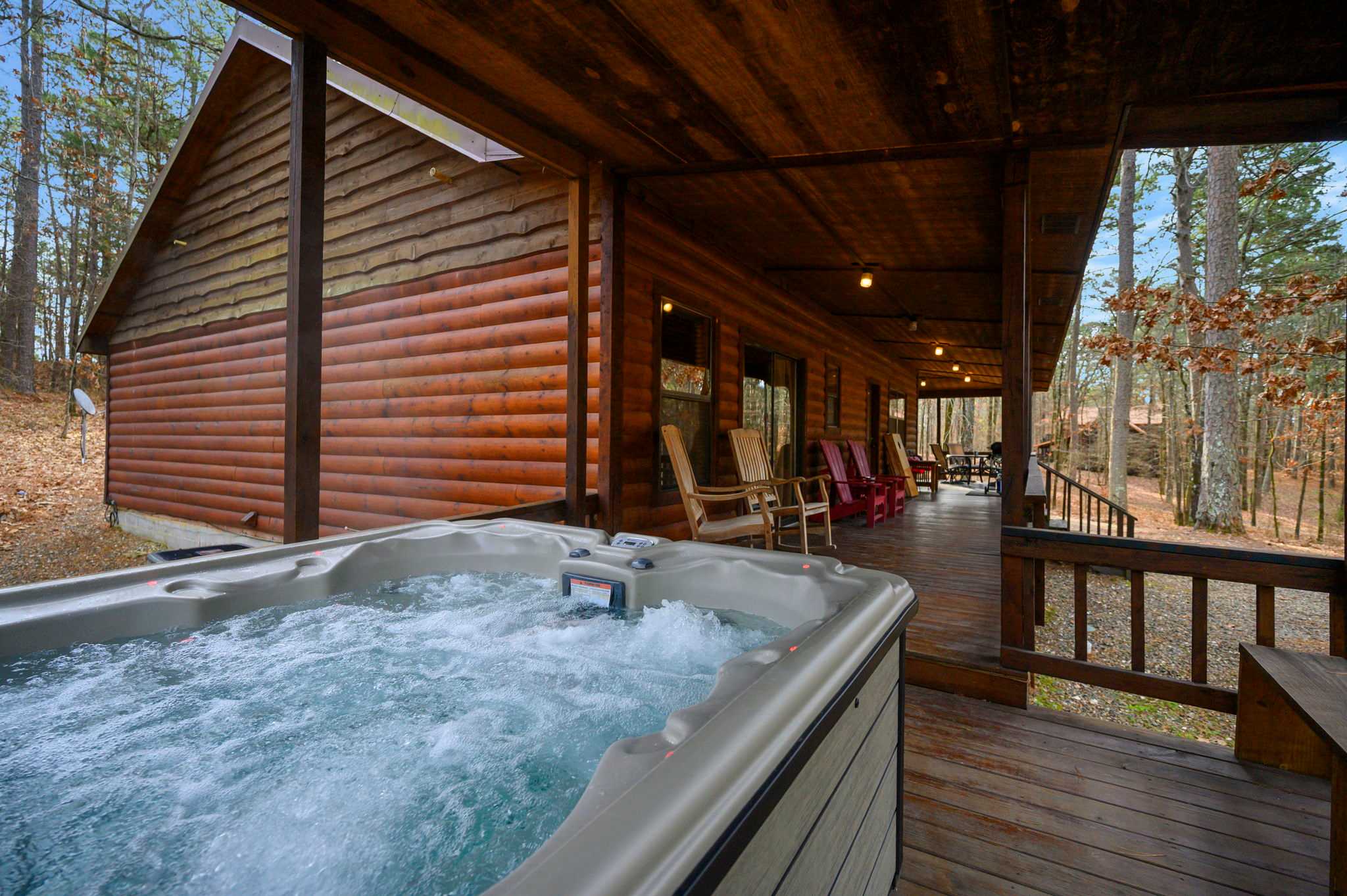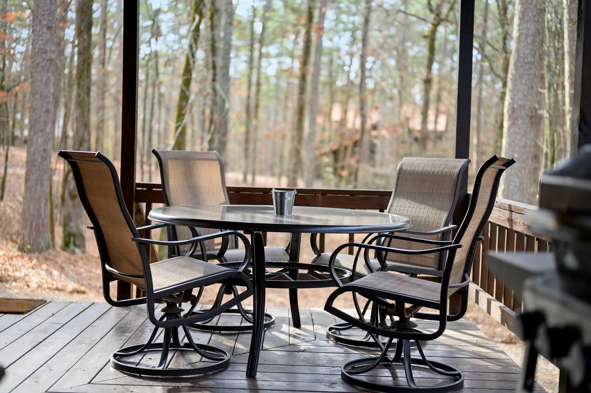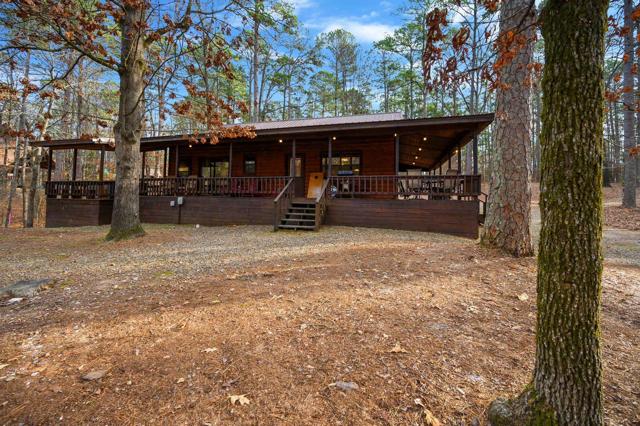Outdoors, a wraparound porch expands the living space and gives you room to truly unwind in the fresh mountain air. A covered deck includes a hot tub, grill, comfy seating, and a table for four — perfect for morning coffee, afternoon lounging, or dinner al fresco. Just beyond, the yard offers a fire pit with seating next to a picnic table, creating a memorable spot for s’mores, storytelling, and slow nights under the Oklahoma sky.
