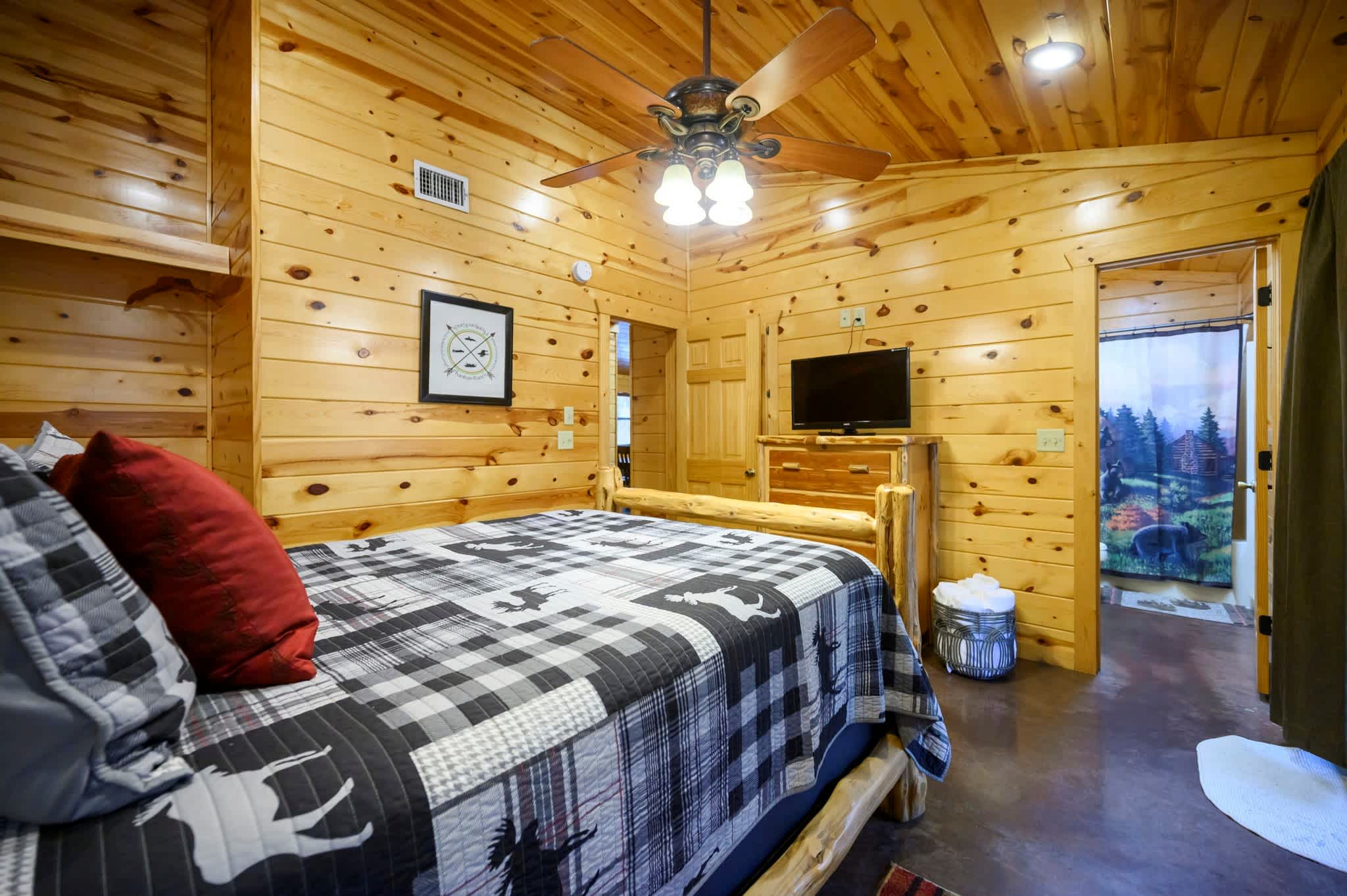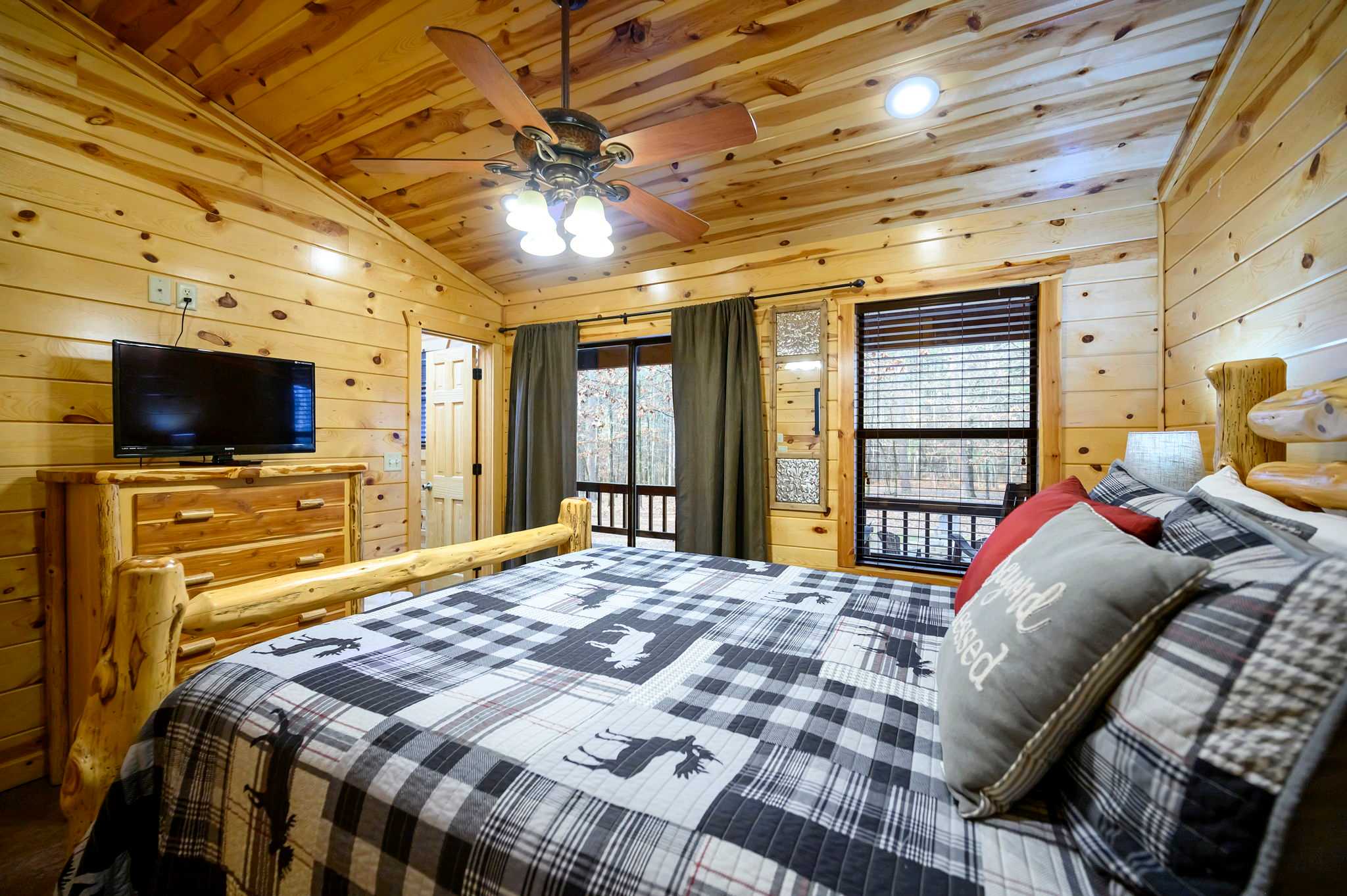 Bedroom #1 includes a queen size bed, a smart TV, deck access, and an ensuite bathroom with a single vanity and a shower/tub combo.