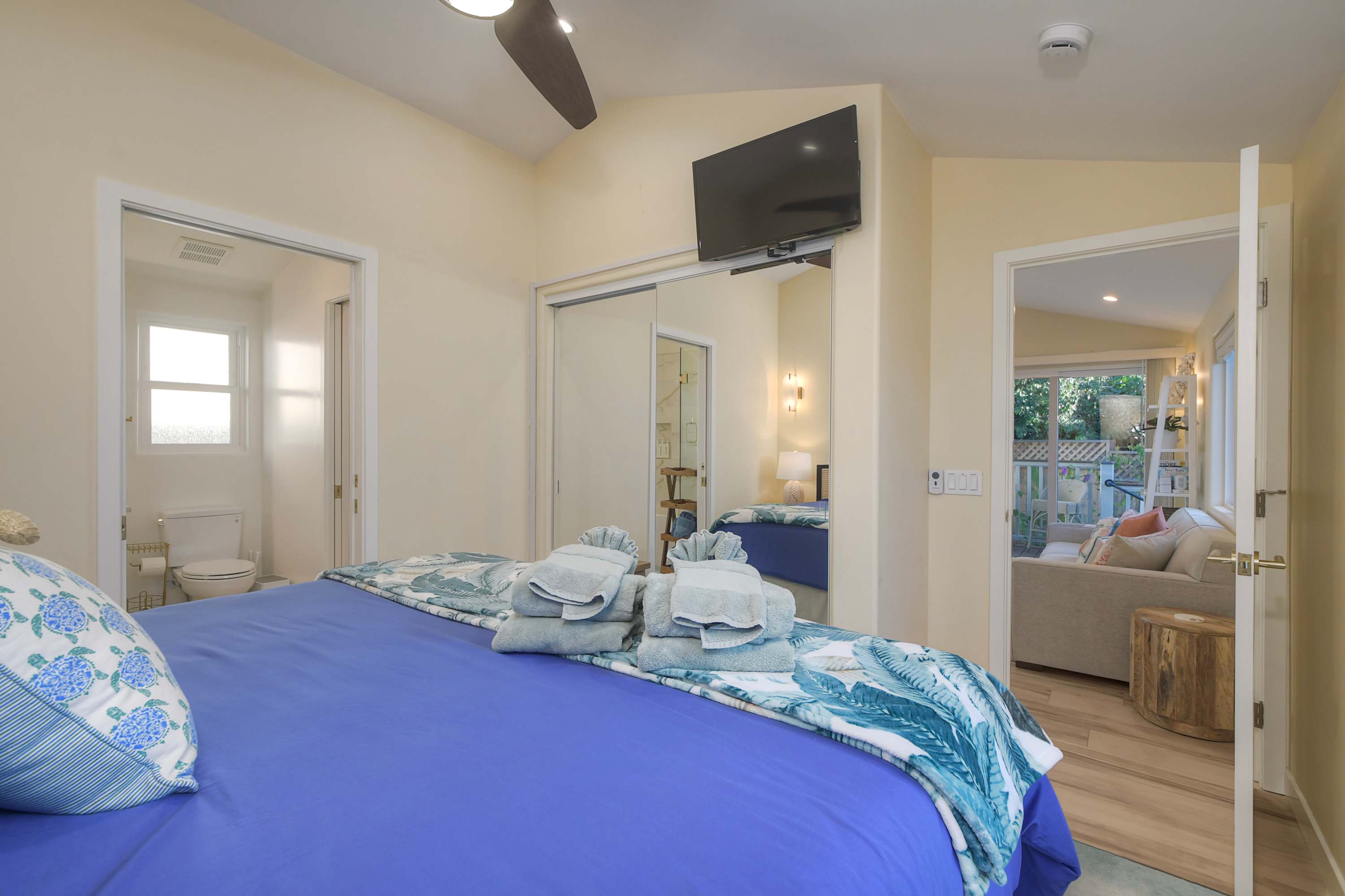 The bedroom includes a king size bed, a smart TV, patio access, and an ensuite bathroom with a single vanity and a shower/tub combo.