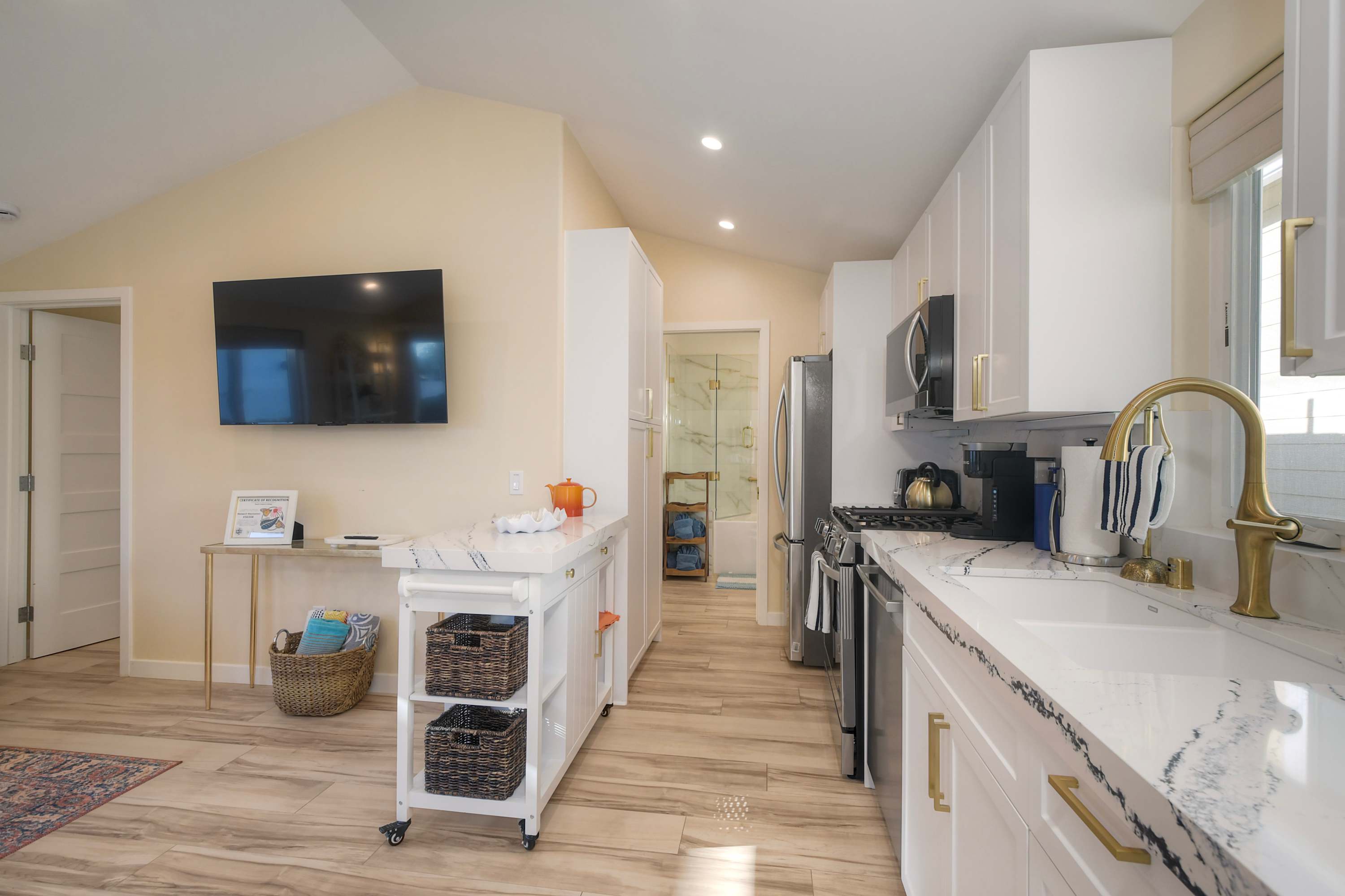 Inside, this unit offers a comfortable and modern space designed for effortless relaxation. The living room features a cozy couch and Smart TV for movie nights or unwinding between beach outings. A compact yet well-equipped kitchen makes mornings a delight with both a Keurig and a French press for coffee lovers, plus a dining table for two that doubles as an ideal spot for planning your day’s adventures.