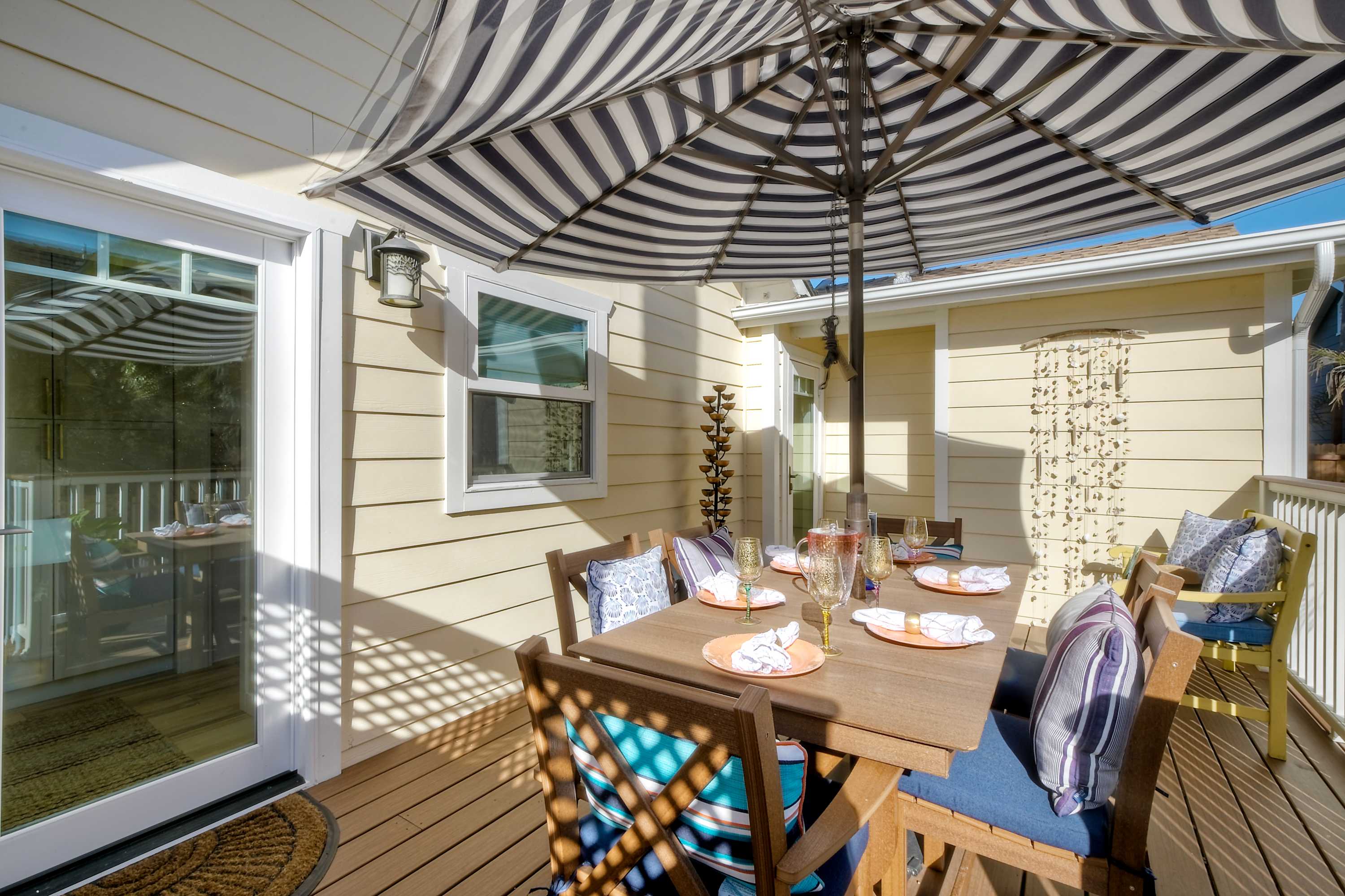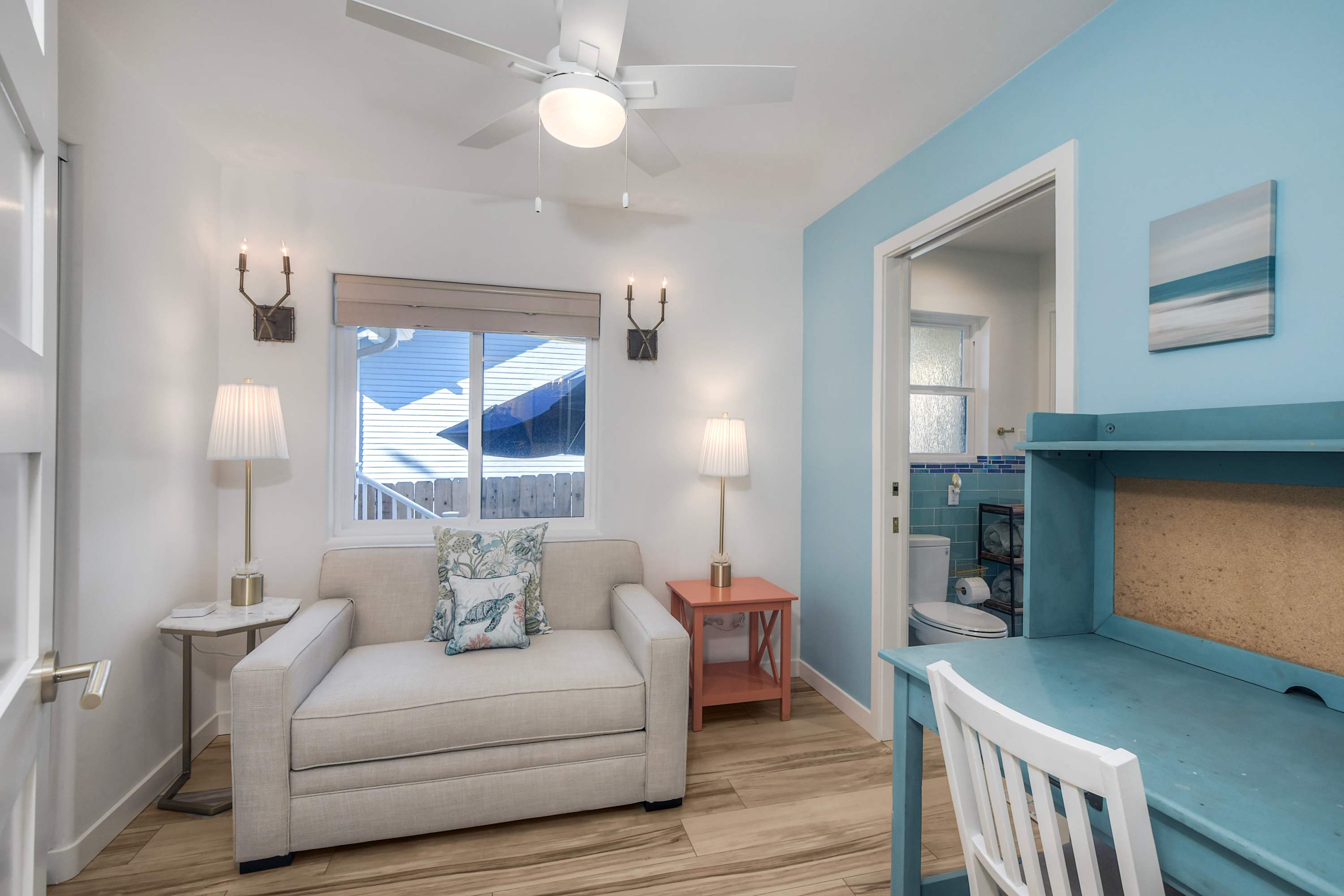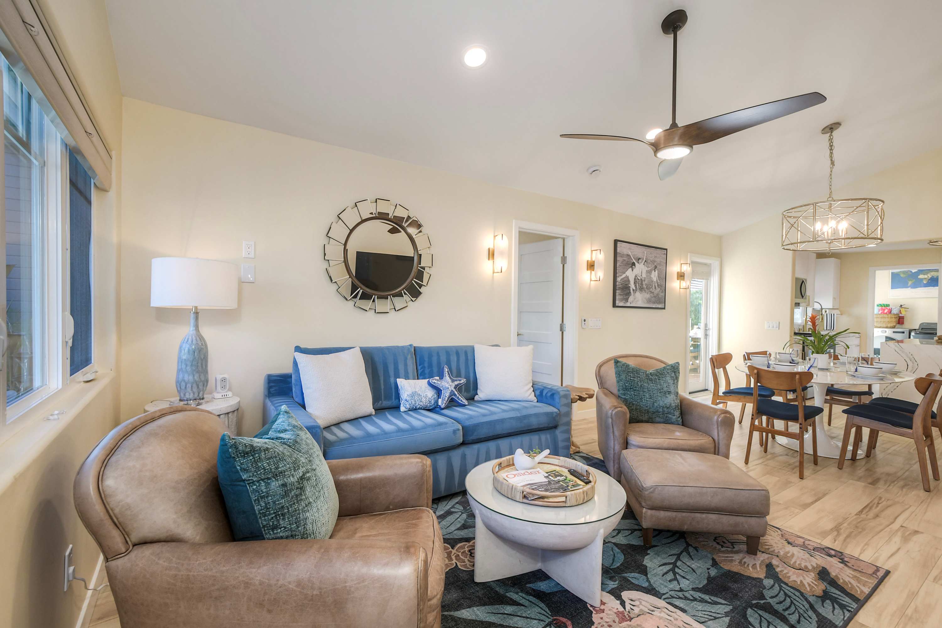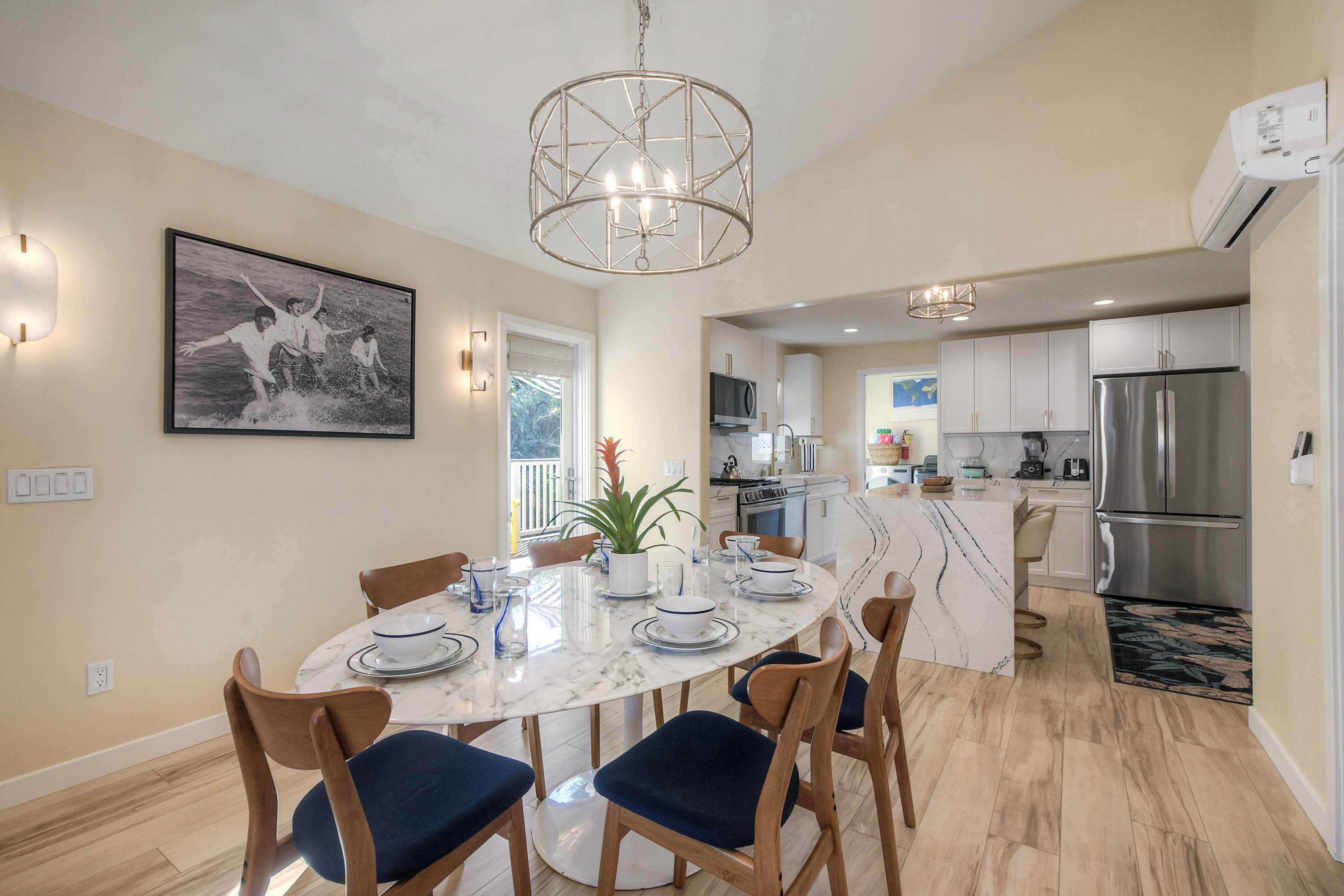 Inside, Unit A offers a comfortable and thoughtfully arranged living space perfect for beach days and relaxed evenings. The living room welcomes you with a smart TV, plush couch, and two additional chairs for lounging or movie nights. The kitchen blends convenience and style with stainless steel appliances, both a Keurig and French press for coffee lovers, and counter seating for two. A full dining table for six makes sit-down meals easy, whether you’re cooking in or bringing back local favorites. Or gather outside on the private deck to share your meals al fresco at the table for six while enjoying the coastal breeze