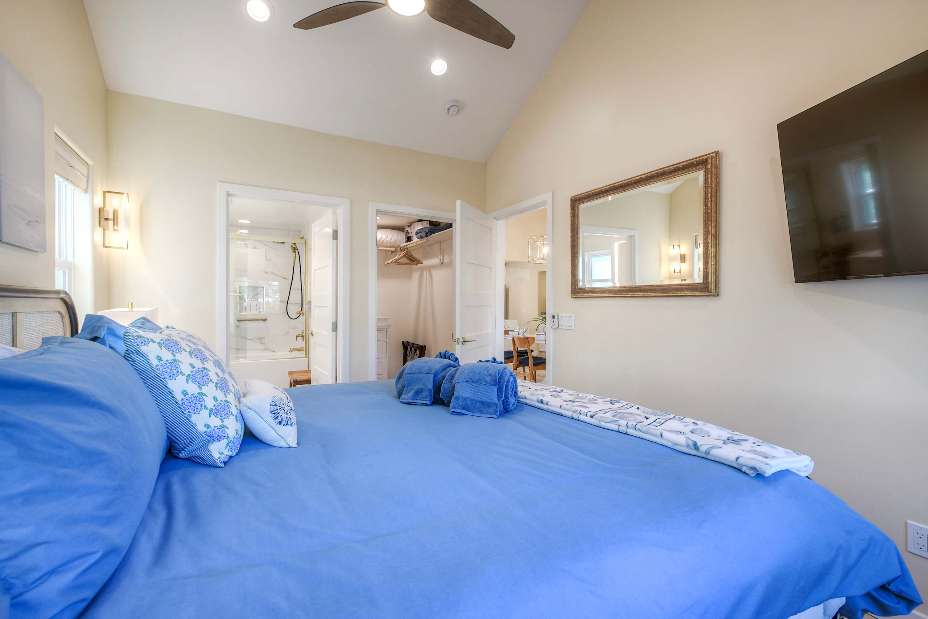 Bedroom #1 includes a king size bed and an ensuite bathroom with a single vanity and a shower/tub combo.