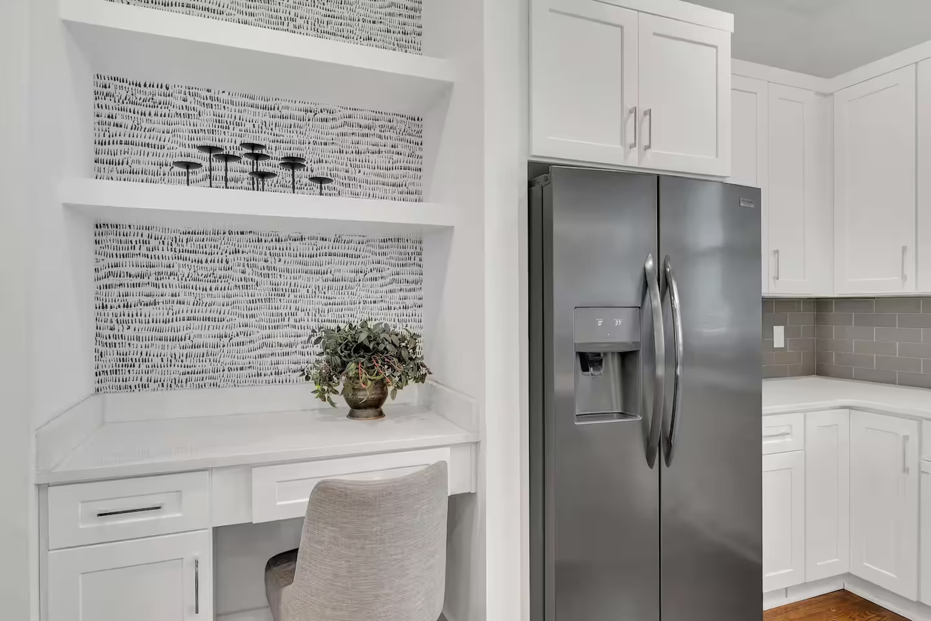 • Bedroom 1 (1st Floor): Queen bed, desk, walk-in closet + en-suite bathroom (shower/tub combo)