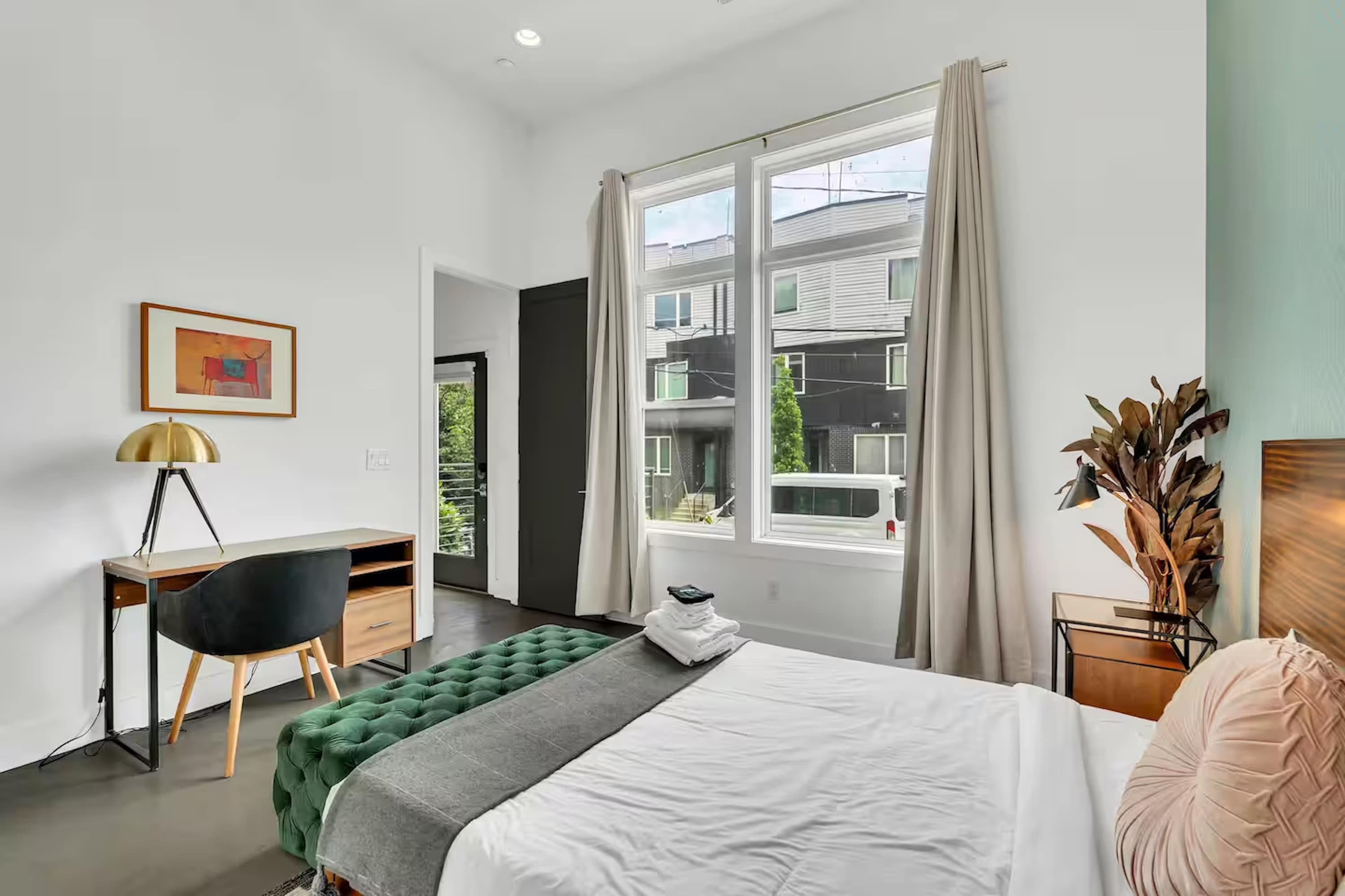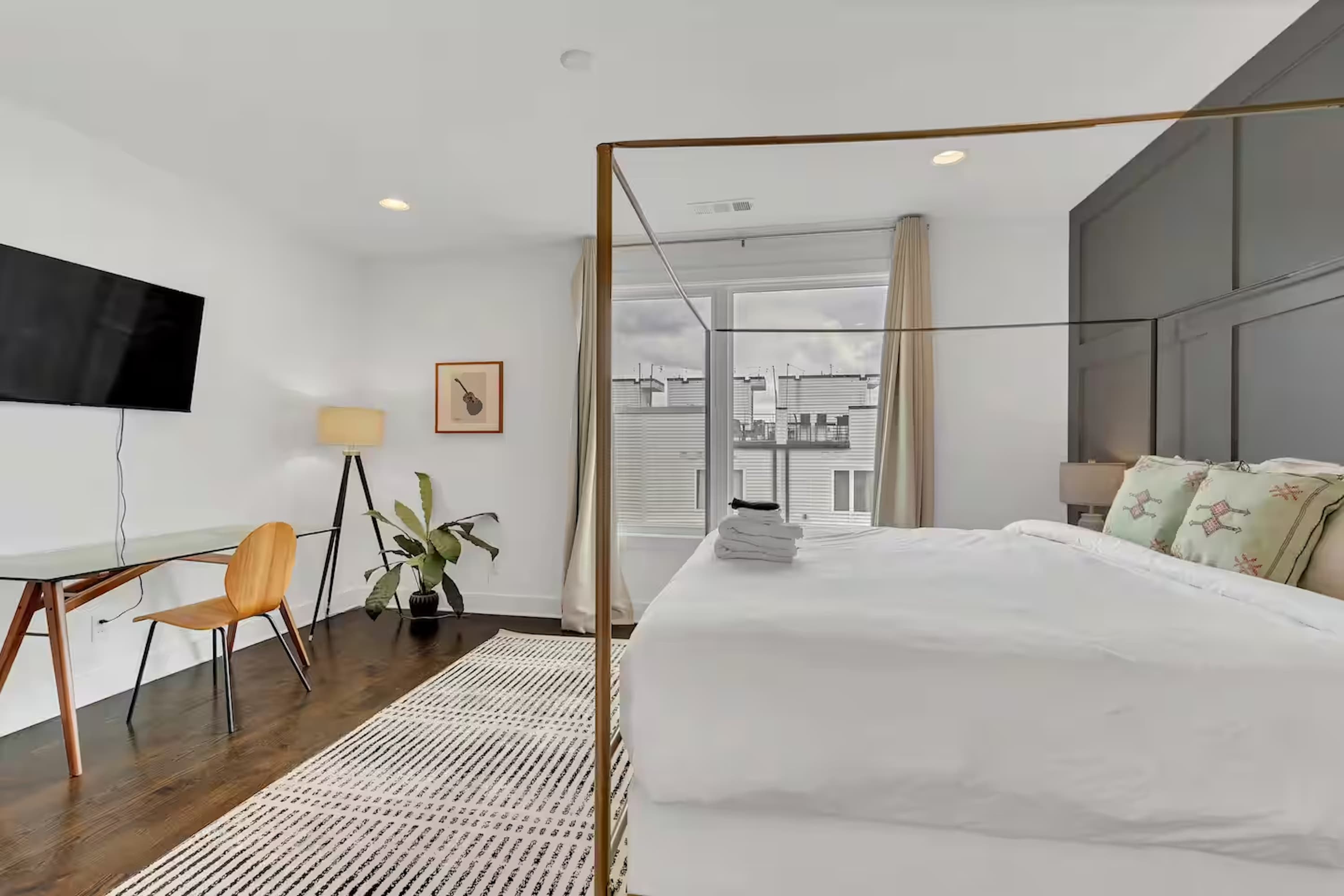 • Bedroom 3 – Primary (3rd Floor): King bed, smart TV, desk, walk-in closet + en-suite bathroom (dual vanities, walk-in shower)