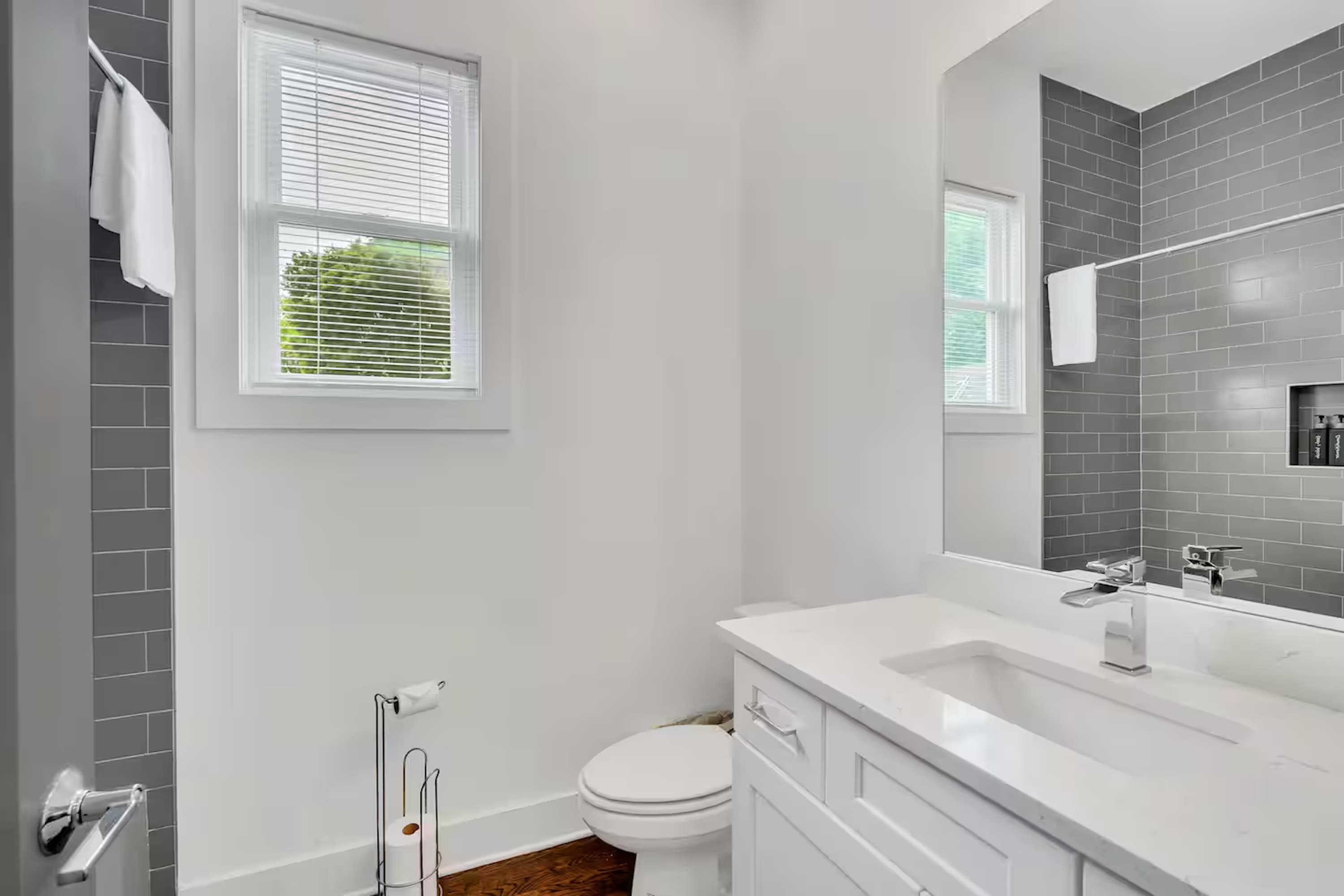• Additional guest bathroom 1 (2nd Floor): Single vanity, shower/tub combo off living room + kitchen