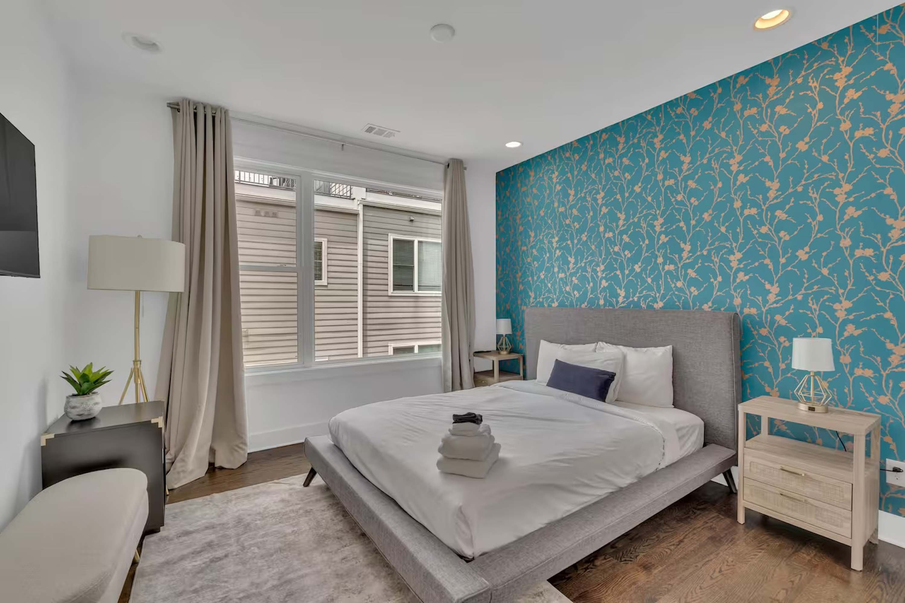 • Bedroom 3 – Primary (3rd Floor): King bed, smart TV, desk, walk-in closet + en-suite (dual vanities, walk-in shower)