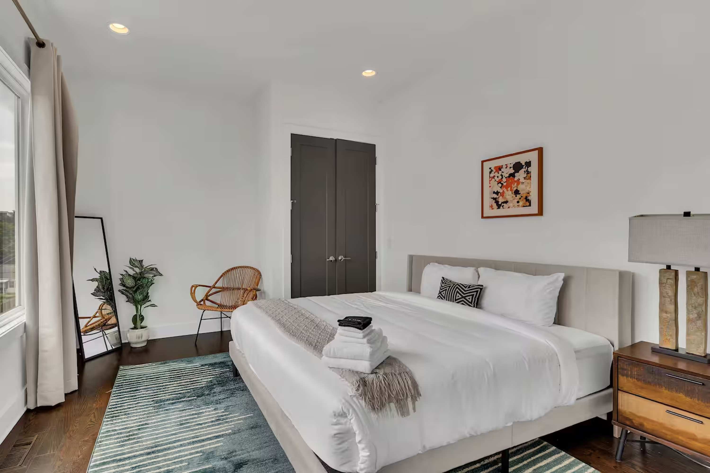 • Bedroom 1 (1st Floor): Queen bed, desk, walk-in closet + en-suite bathroom (shower/tub combo)