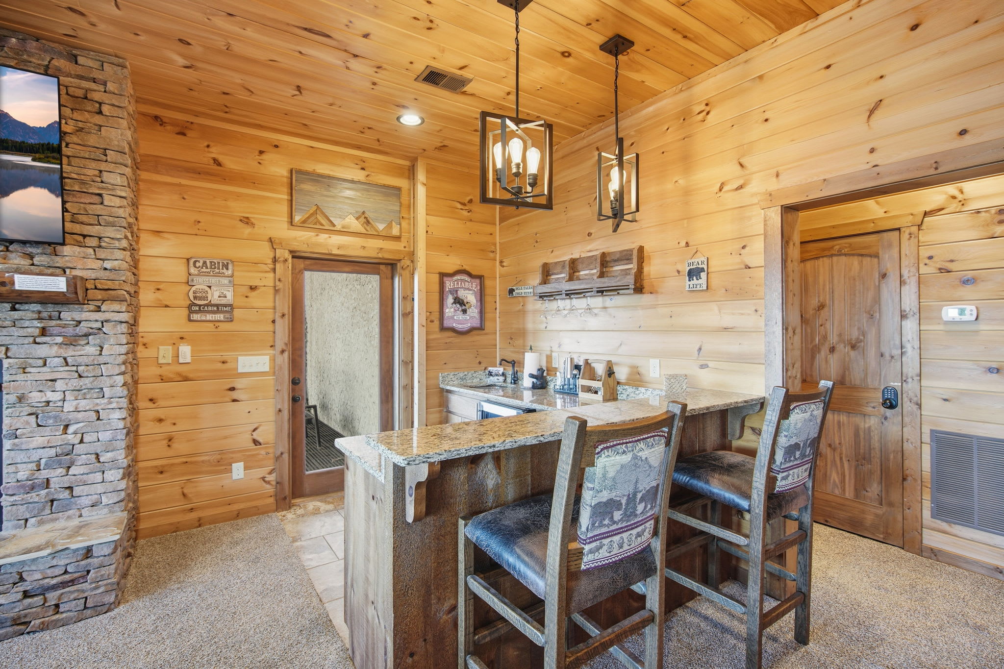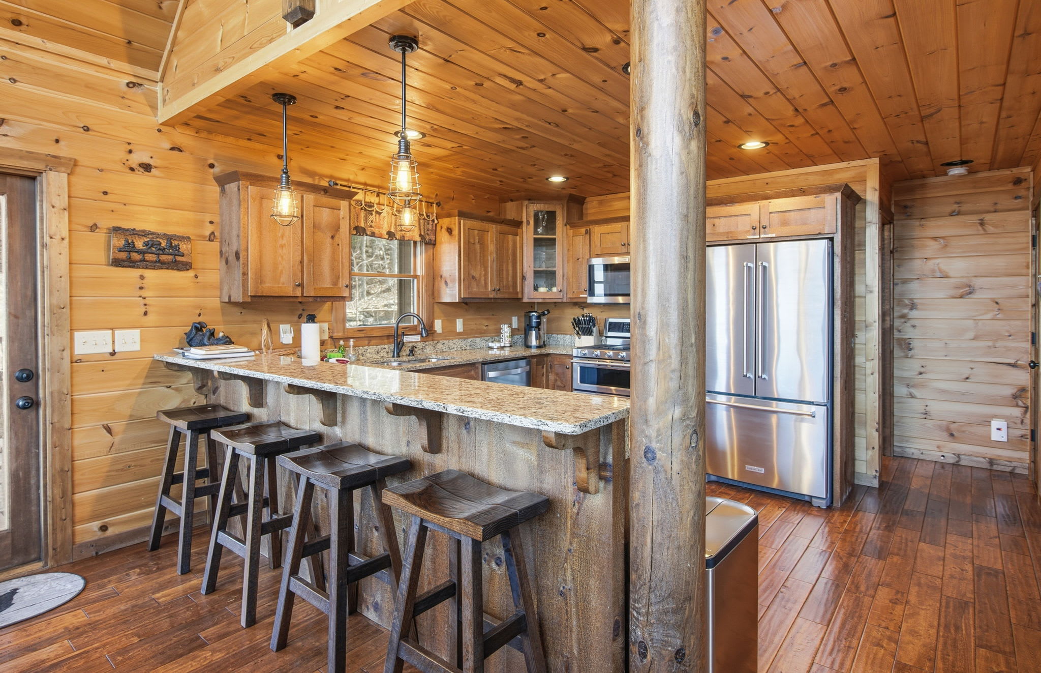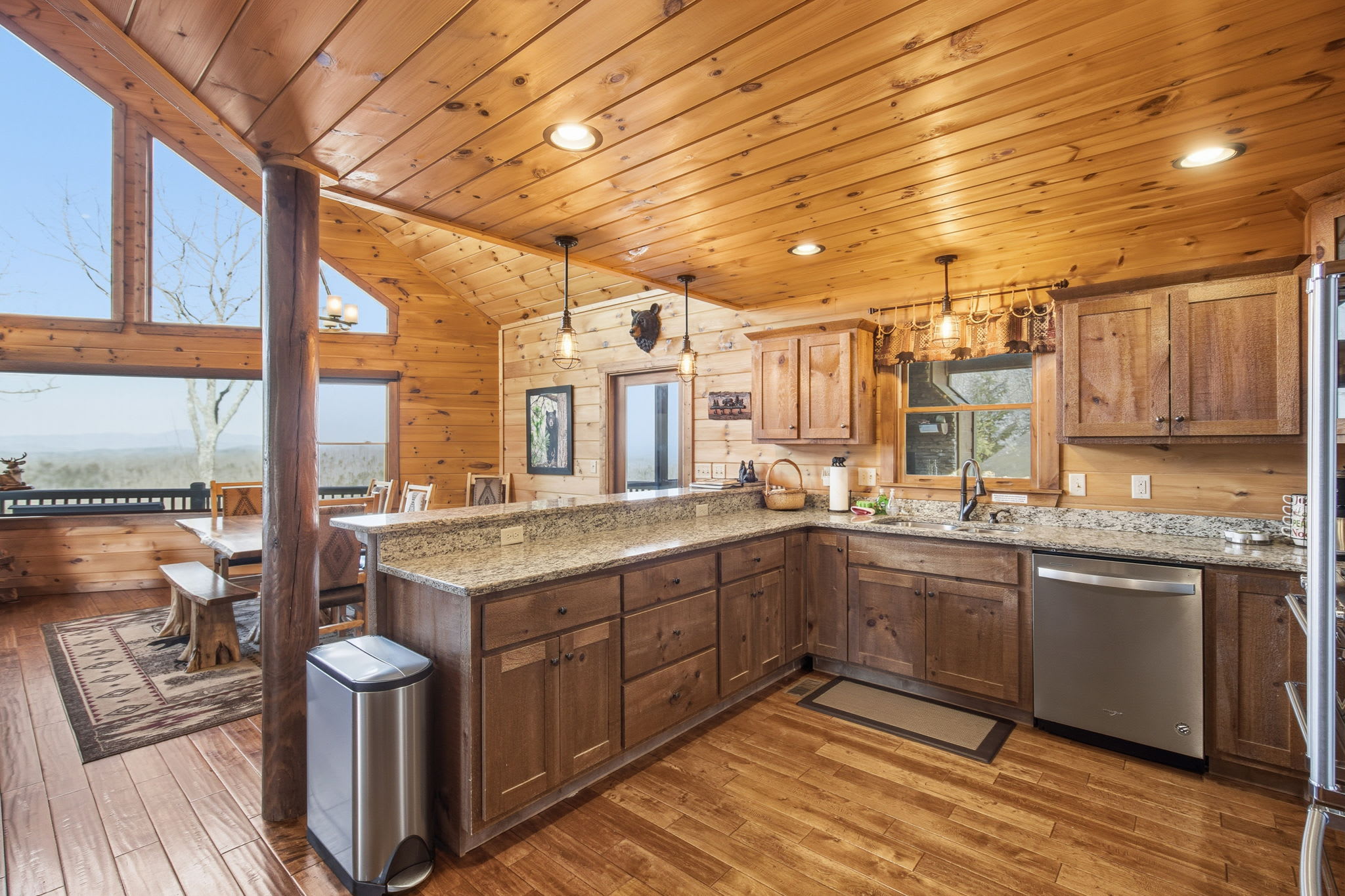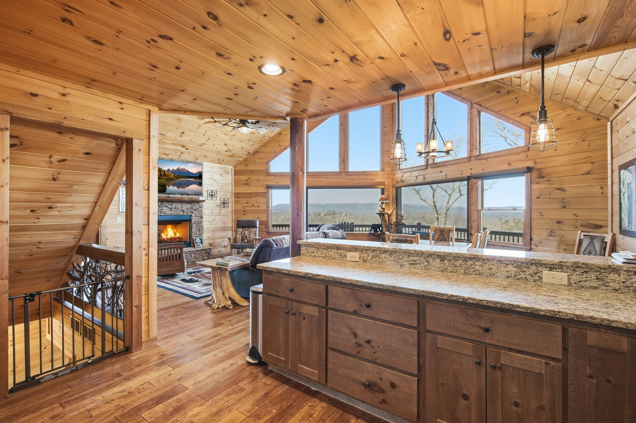 Warm, welcoming, and richly detailed with its all-wood interior and exterior, this stunning three-story cabin accommodates up to eight guests with plenty of space. The main level features a fully equipped kitchen with granite countertops, stainless steel appliances, a crockpot, island seating for four, and all the essentials for cooking at home. Gather for meals in the dining space that seats eight, then relax in the great room—complete with a gas stone fireplace, flat-screen TV, and towering windows framing evening mountain sunsets.