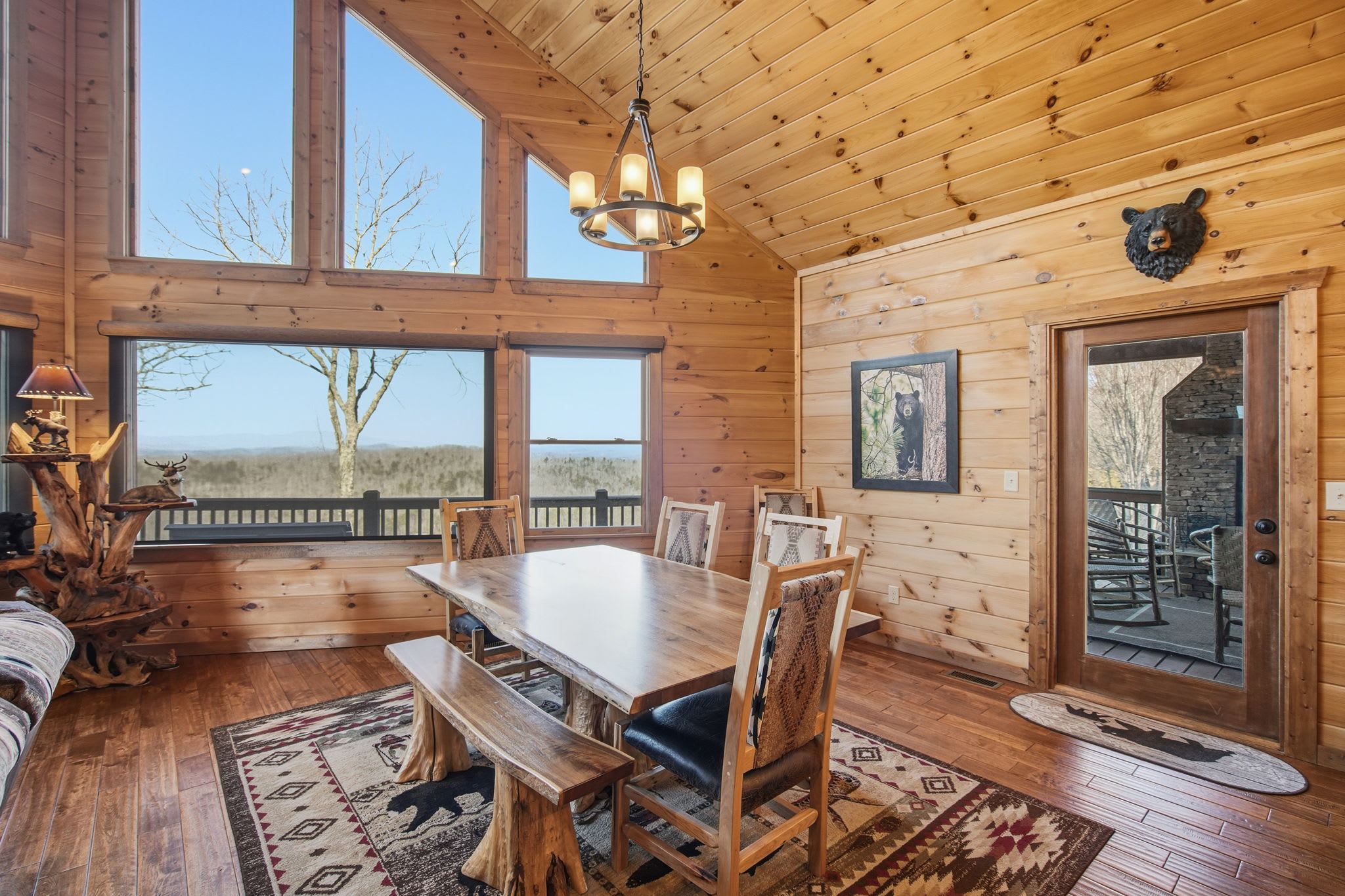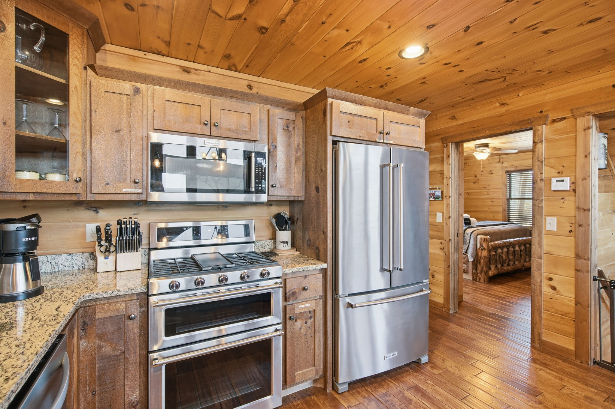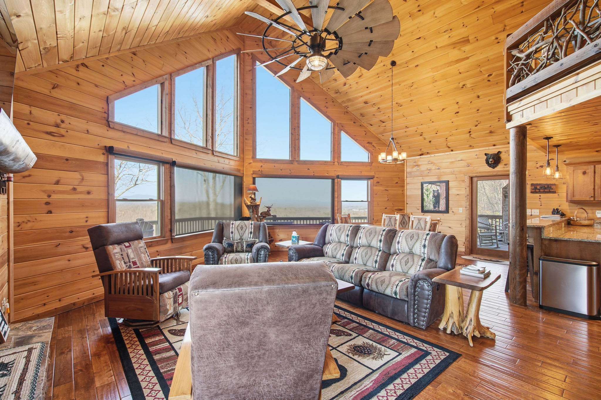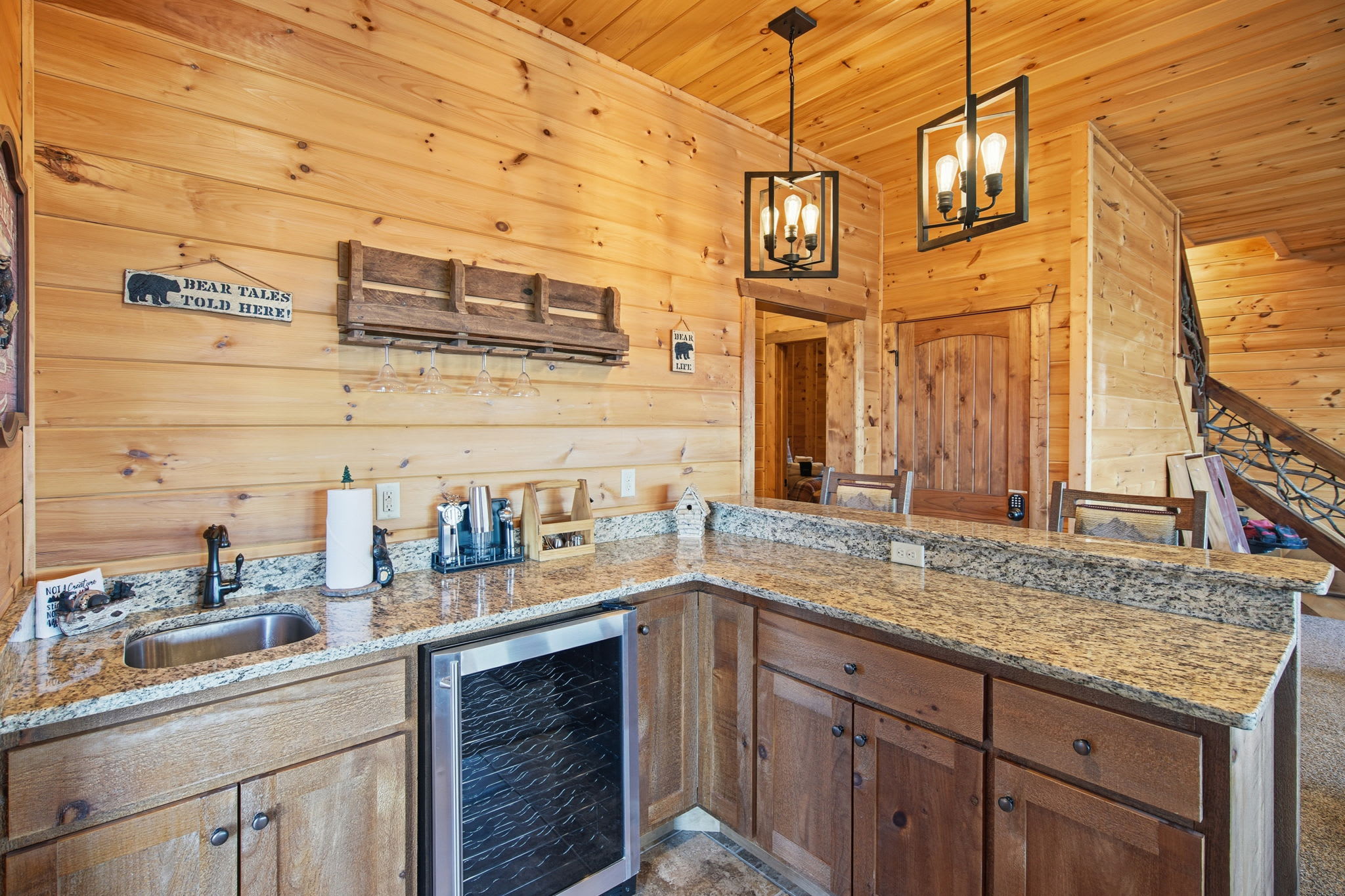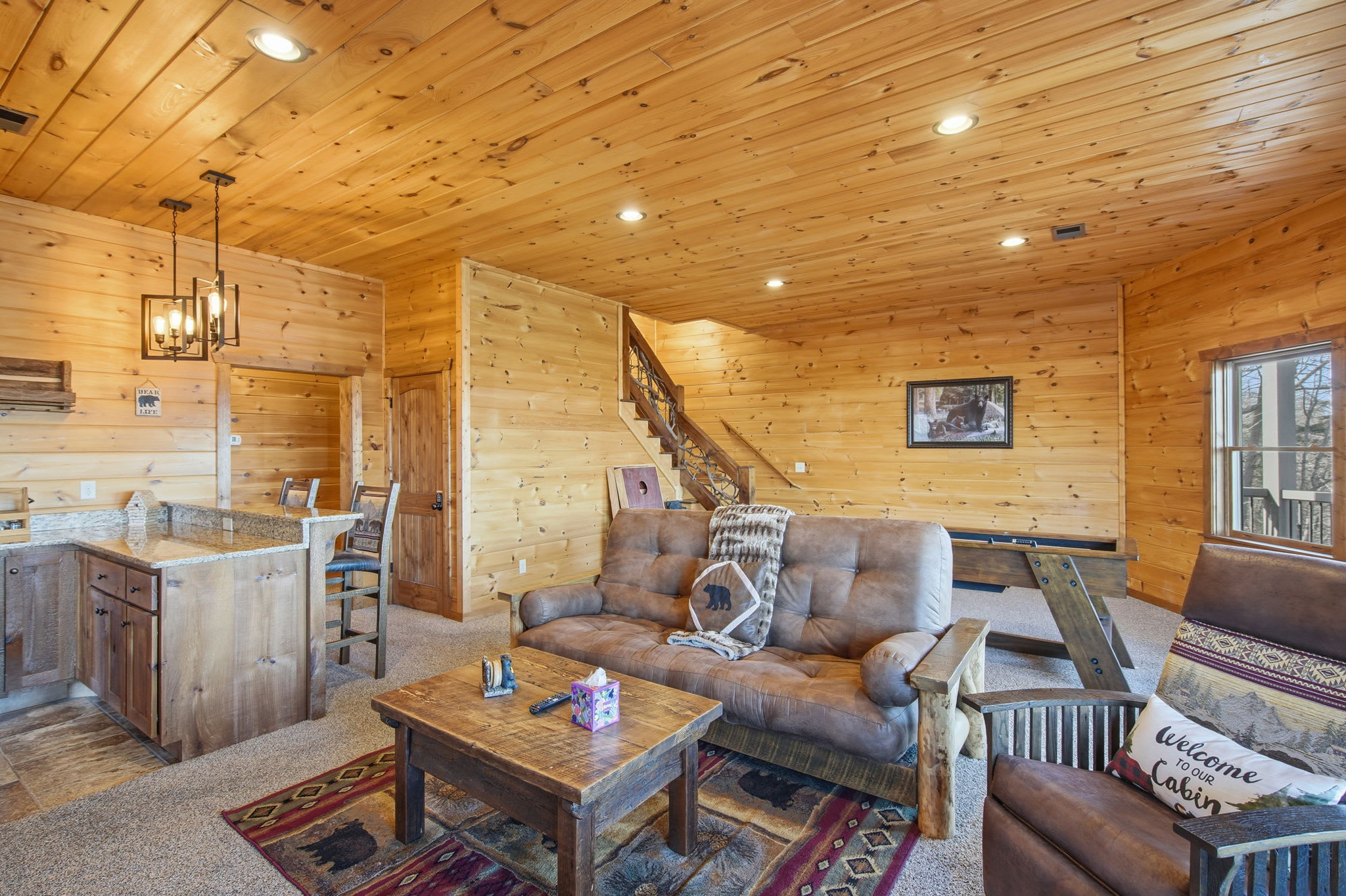 Warm, welcoming, and richly detailed with its all-wood interior and exterior, this stunning three-story cabin accommodates up to eight guests with plenty of space. The main level features a fully equipped kitchen with granite countertops, stainless steel appliances, a crockpot, island seating for four, and all the essentials for cooking at home. Gather for meals in the dining space that seats eight, then relax in the great room—complete with a gas stone fireplace, flat-screen TV, and towering windows framing evening mountain sunsets.