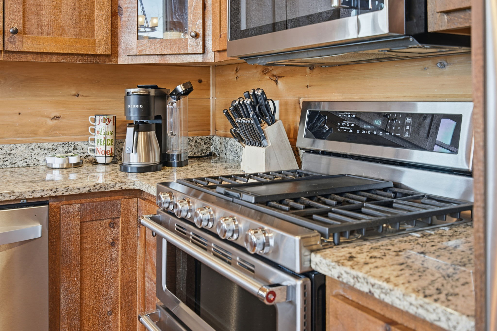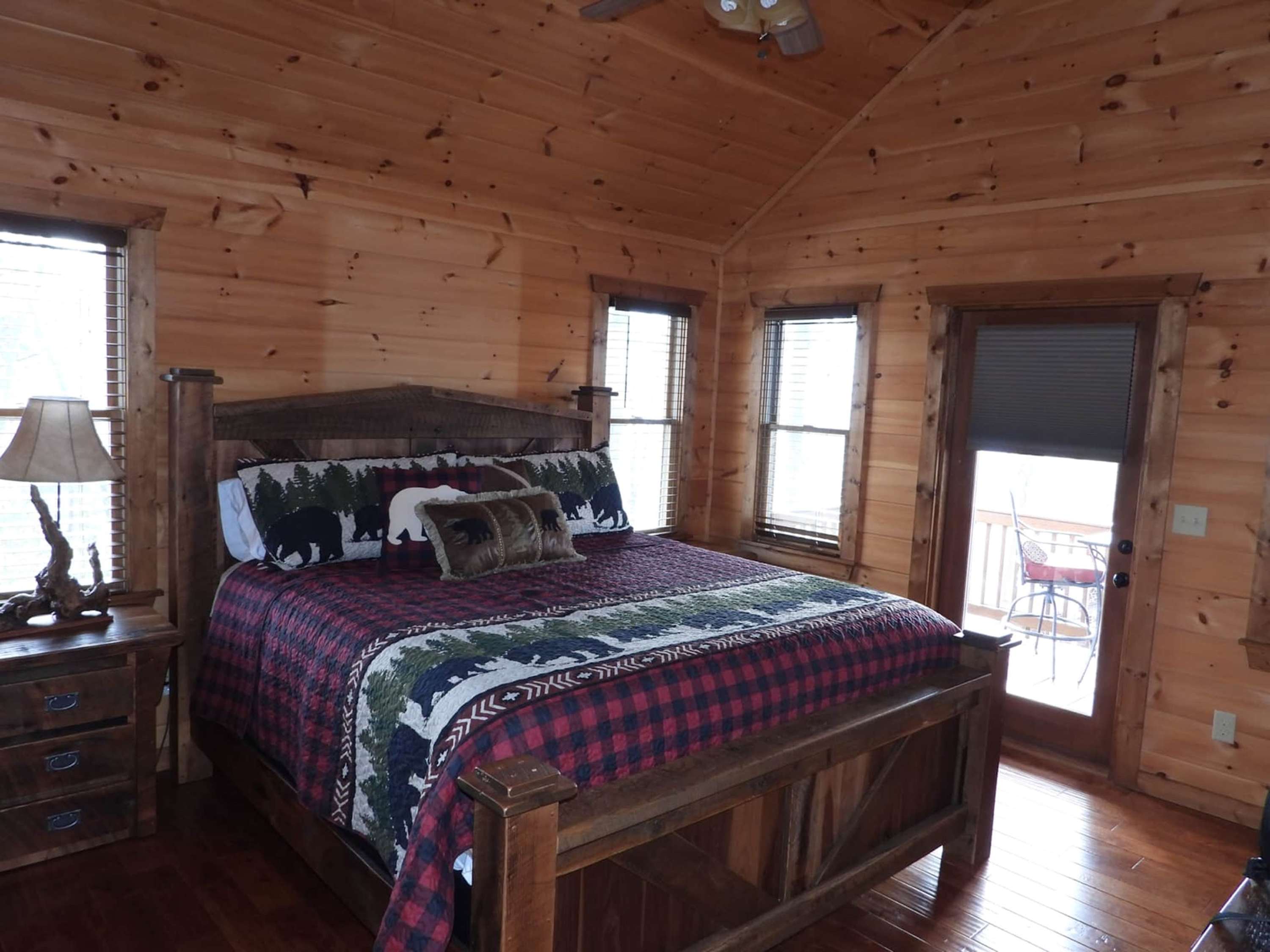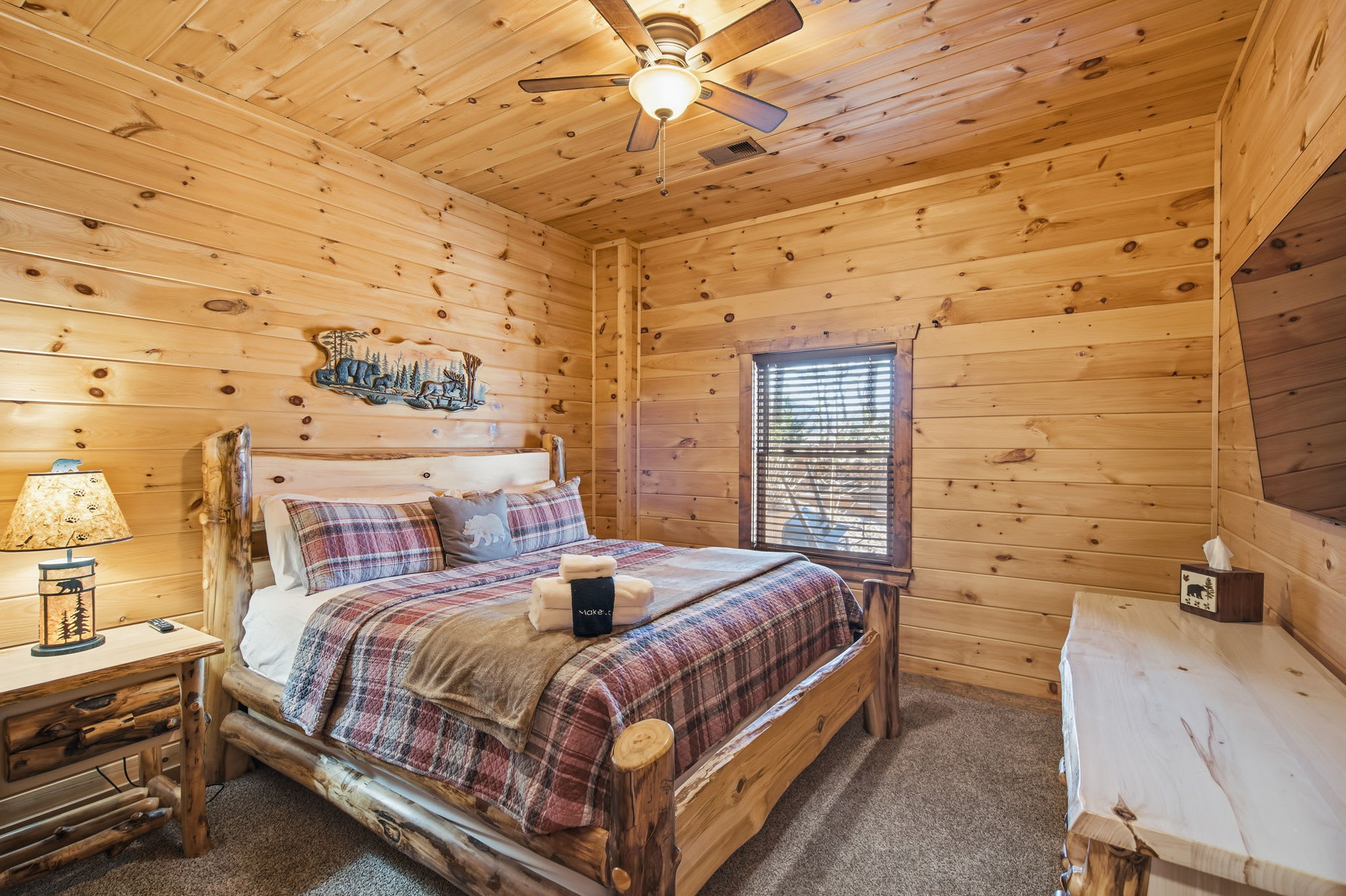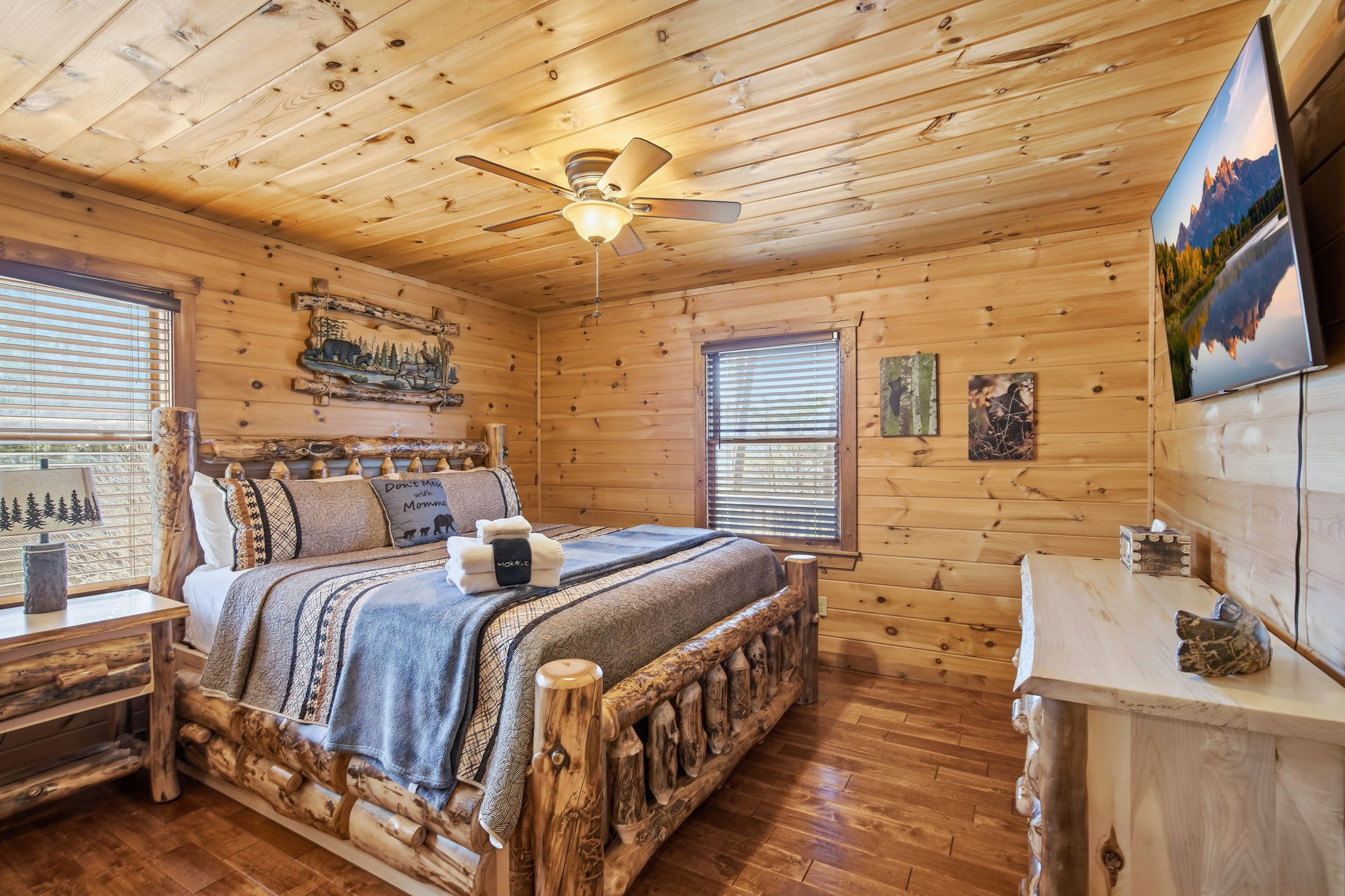 Warm, welcoming, and richly detailed with its all-wood interior and exterior, this stunning three-story cabin accommodates up to eight guests with plenty of space. The main level features a fully equipped kitchen with granite countertops, stainless steel appliances, a crockpot, island seating for four, and all the essentials for cooking at home. Gather for meals in the dining space that seats eight, then relax in the great room—complete with a gas stone fireplace, flat-screen TV, and towering windows framing evening mountain sunsets.