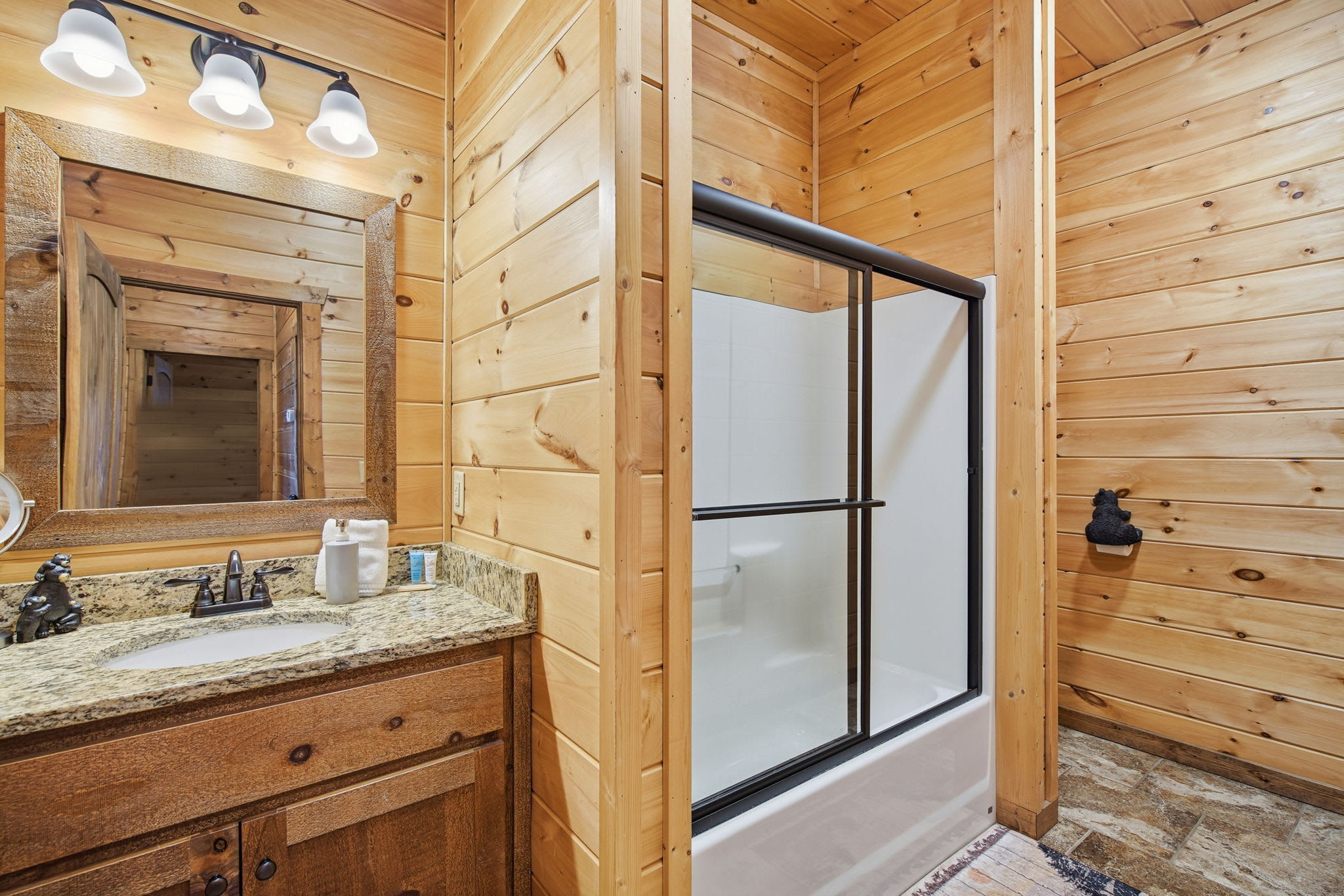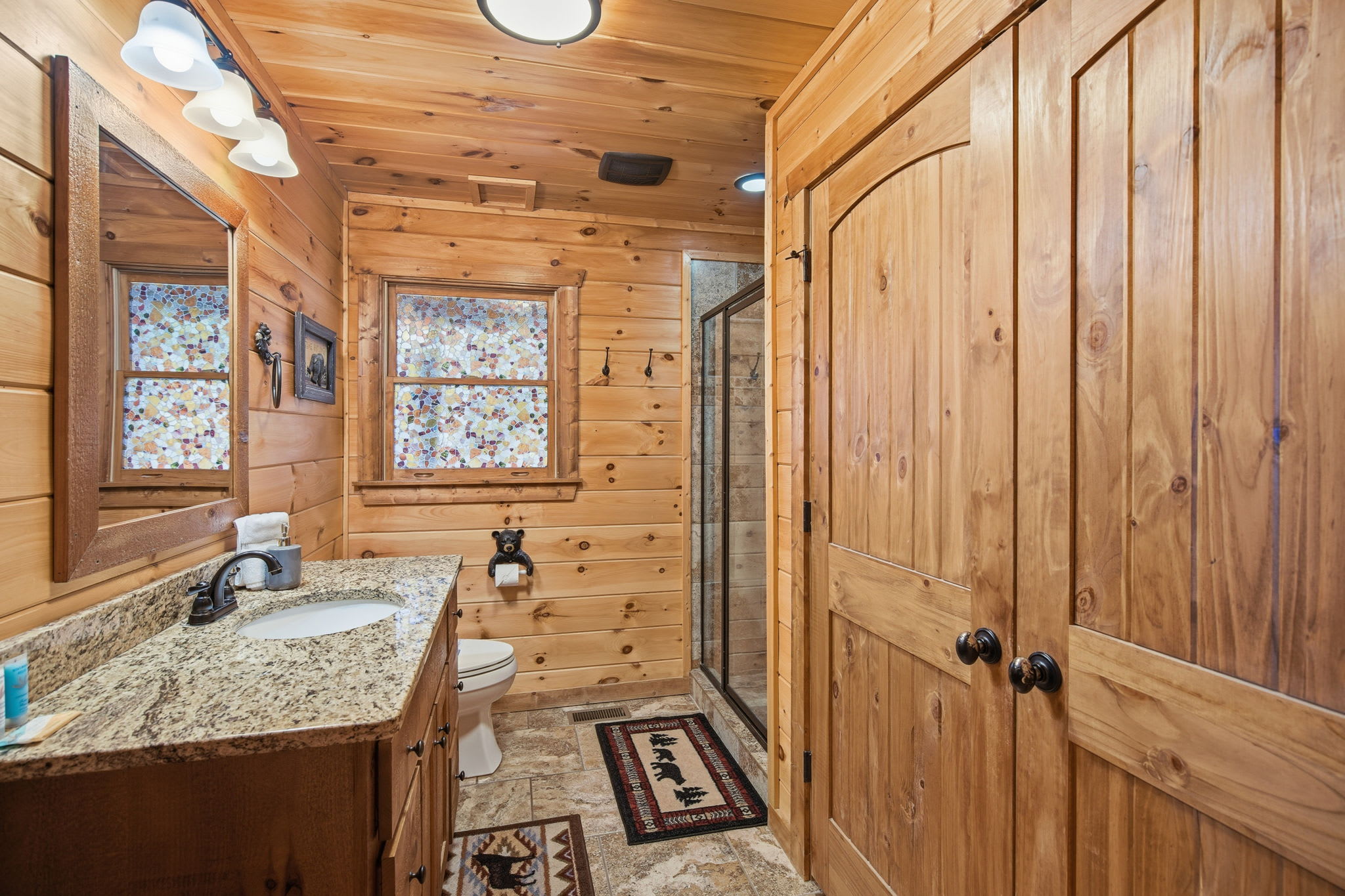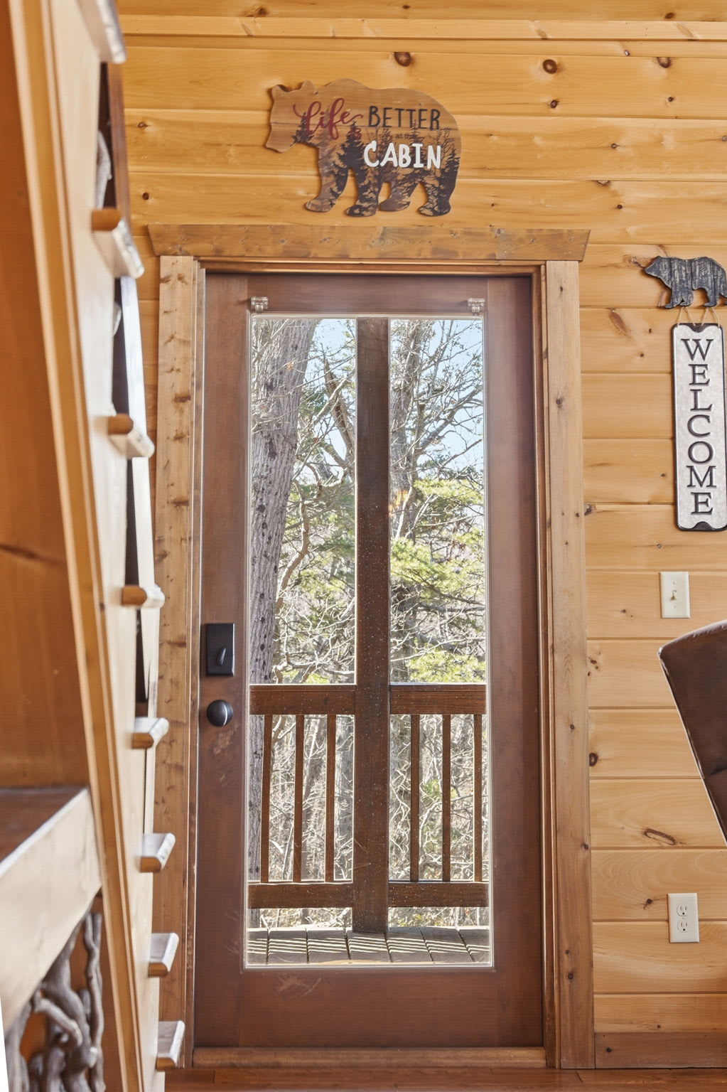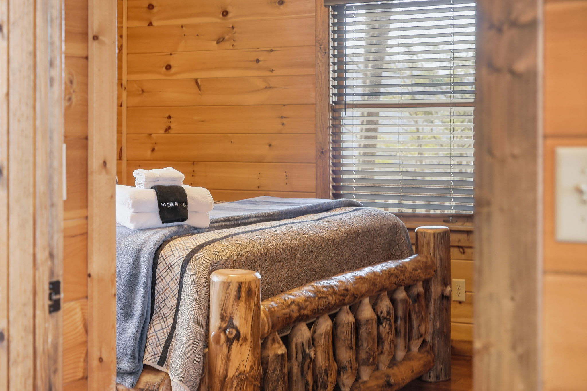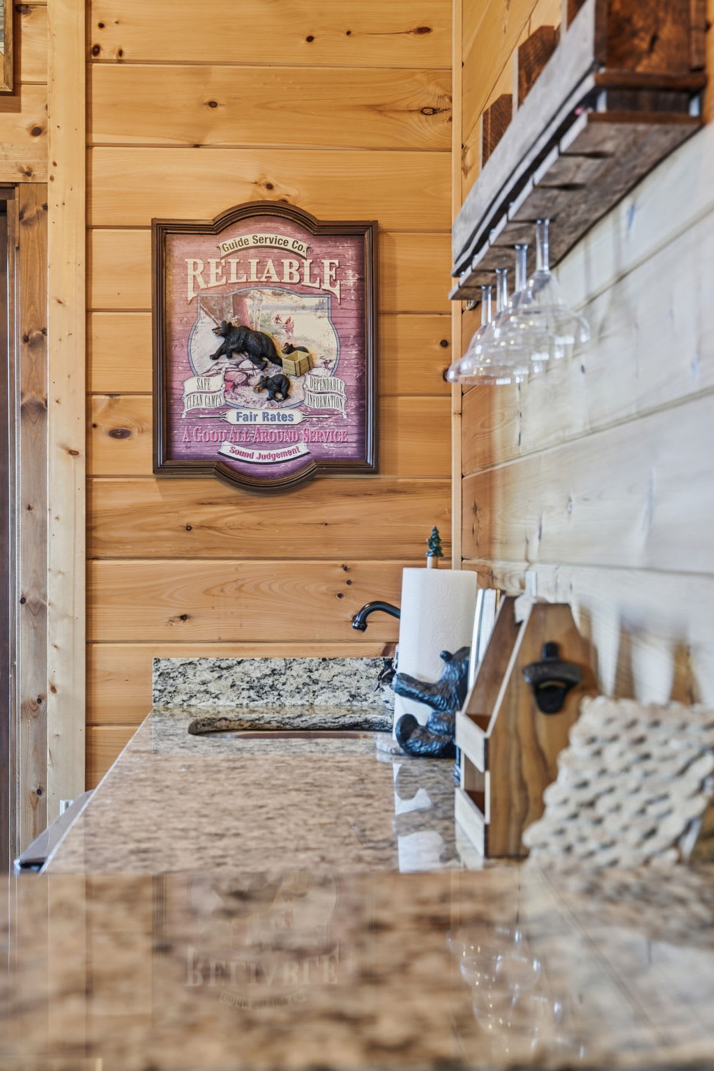 Warm, welcoming, and richly detailed with its all-wood interior and exterior, this stunning three-story cabin accommodates up to eight guests with plenty of space. The main level features a fully equipped kitchen with granite countertops, stainless steel appliances, a crockpot, island seating for four, and all the essentials for cooking at home. Gather for meals in the dining space that seats eight, then relax in the great room—complete with a gas stone fireplace, flat-screen TV, and towering windows framing evening mountain sunsets.