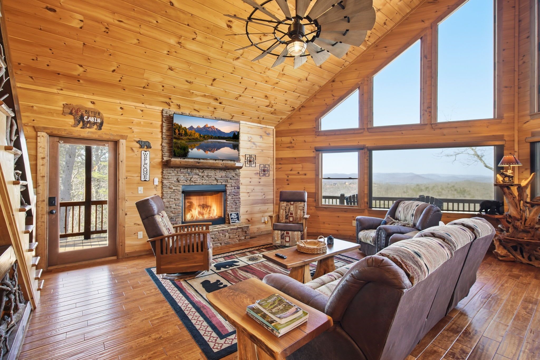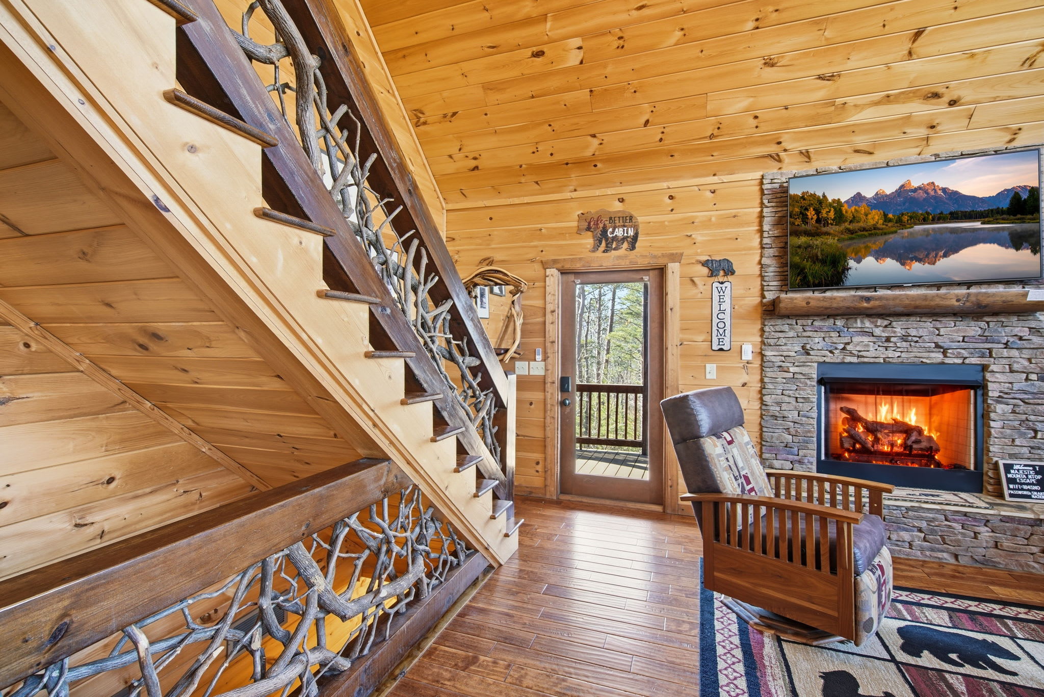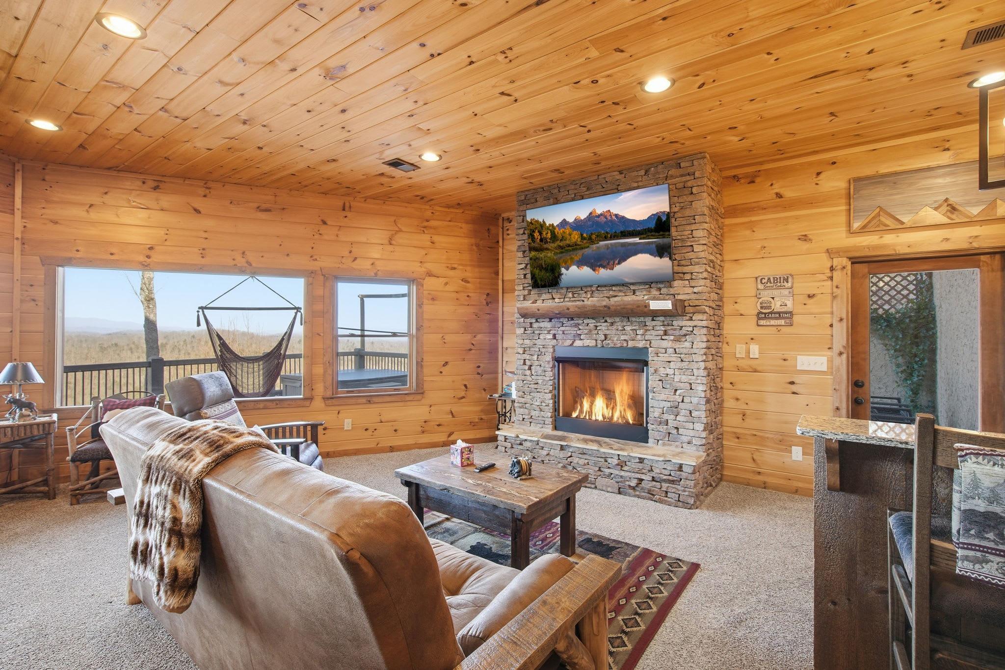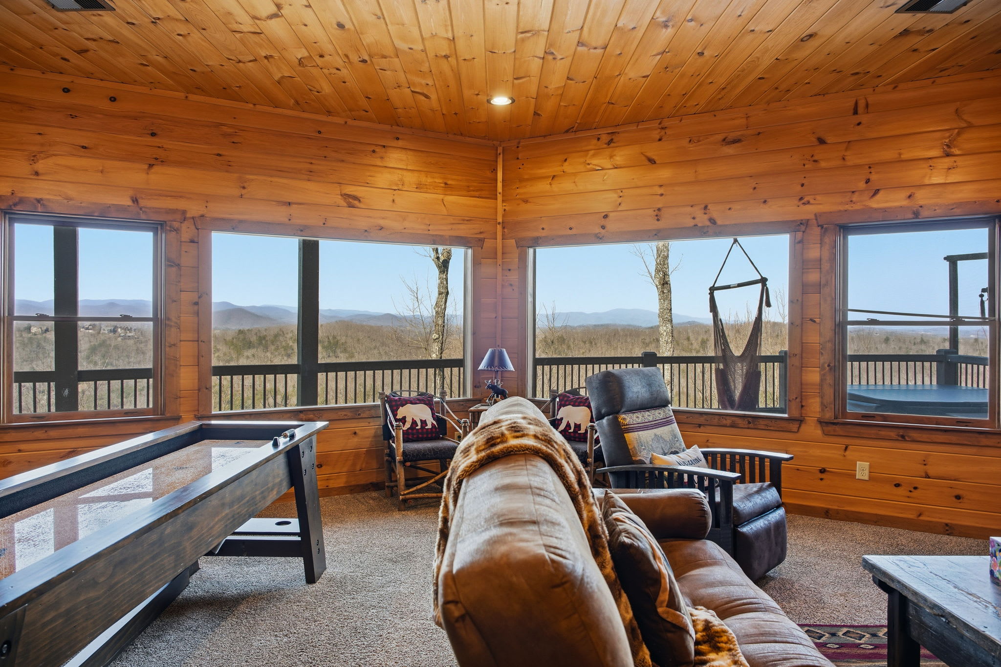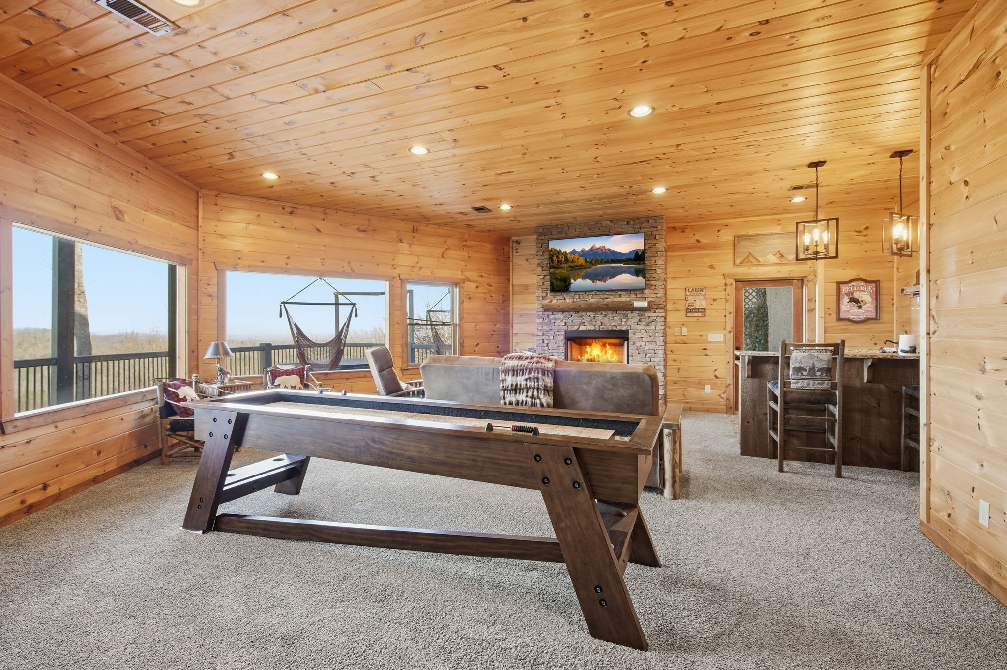 Step onto the expansive wraparound porch, where both screened and open-air sections offer year-round enjoyment. Cozy up beside one of the wood-burning stone fireplaces, enjoy al fresco drinks from plentiful seating areas, or simply soak in the 360° mountain ambience. Upstairs, a loft workspace invites you to catch up on emails between adventures. On the lower level, a large game room offers board games, shuffleboard, cozy seating, and a second flat-screen TV beneath another charming fireplace. A wet bar with an 18-bottle wine fridge and seating for three makes it easy to entertain and unwind.