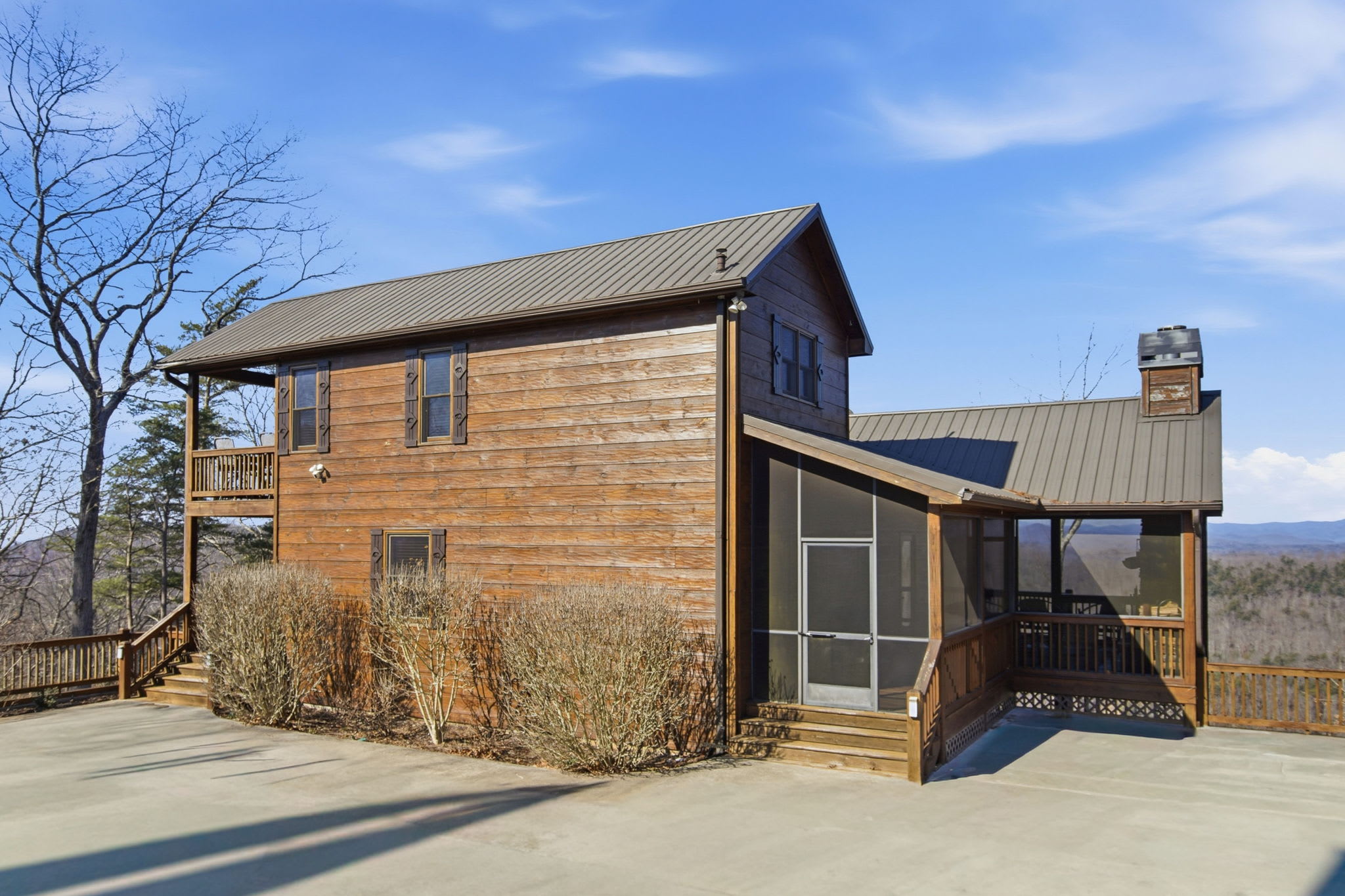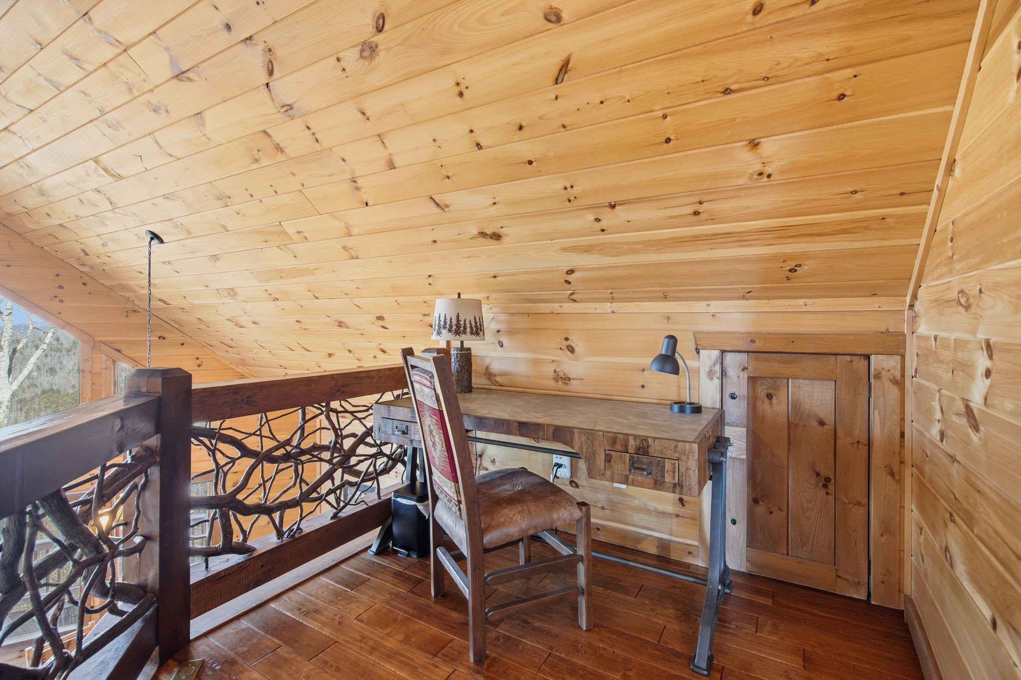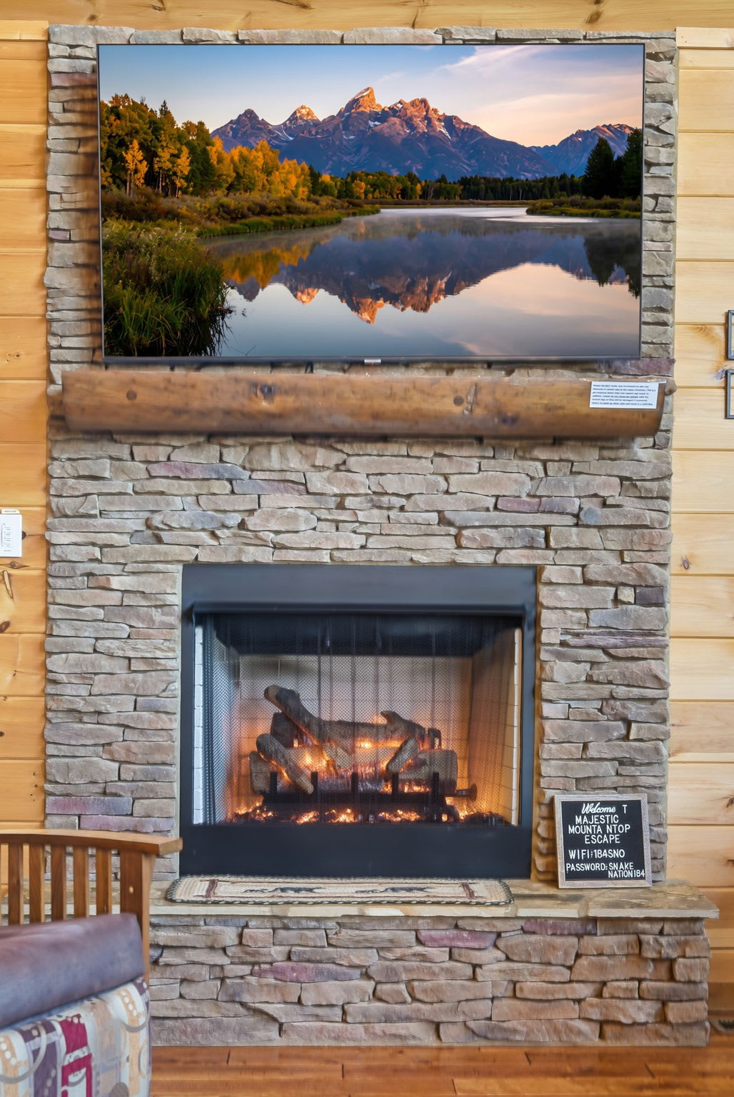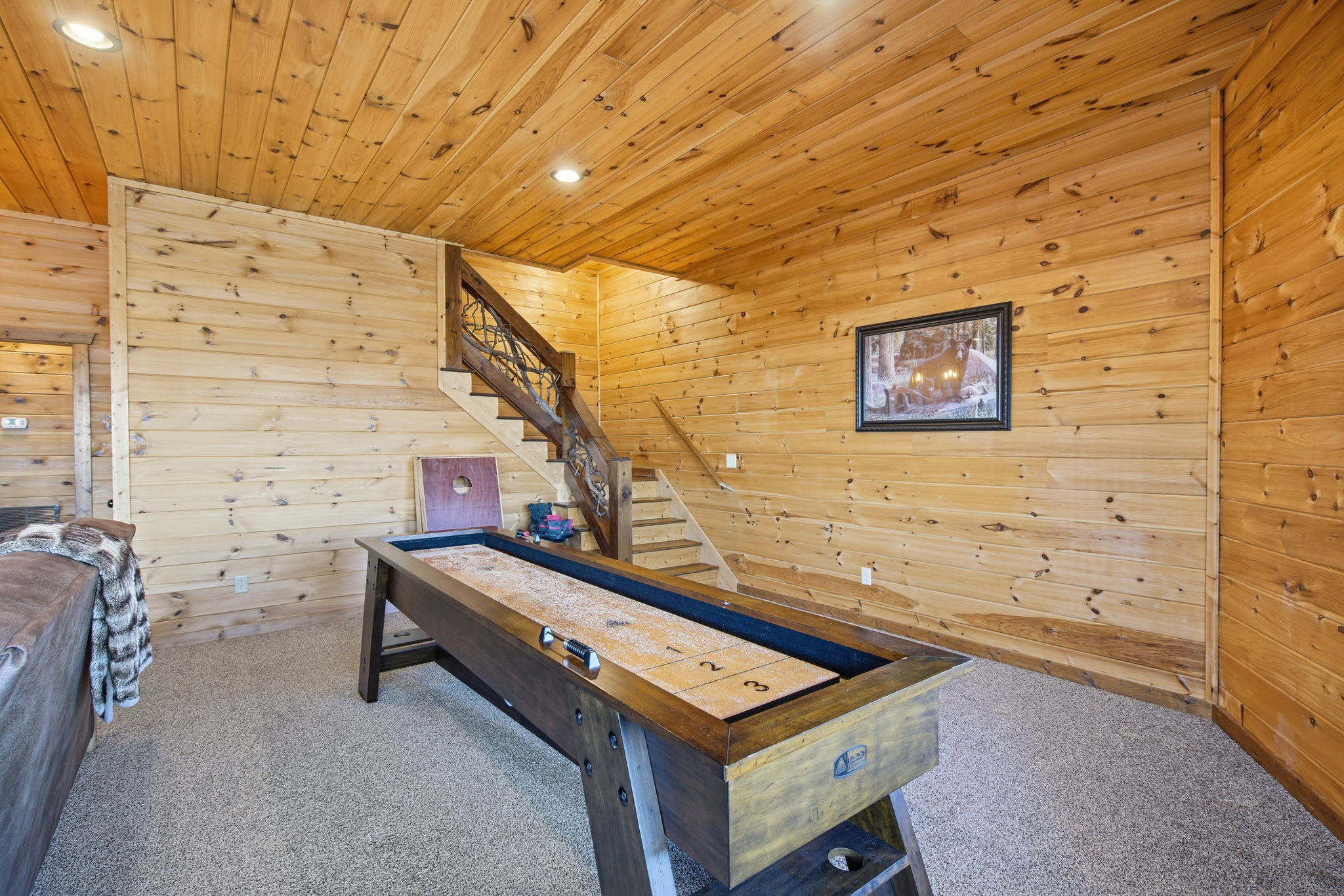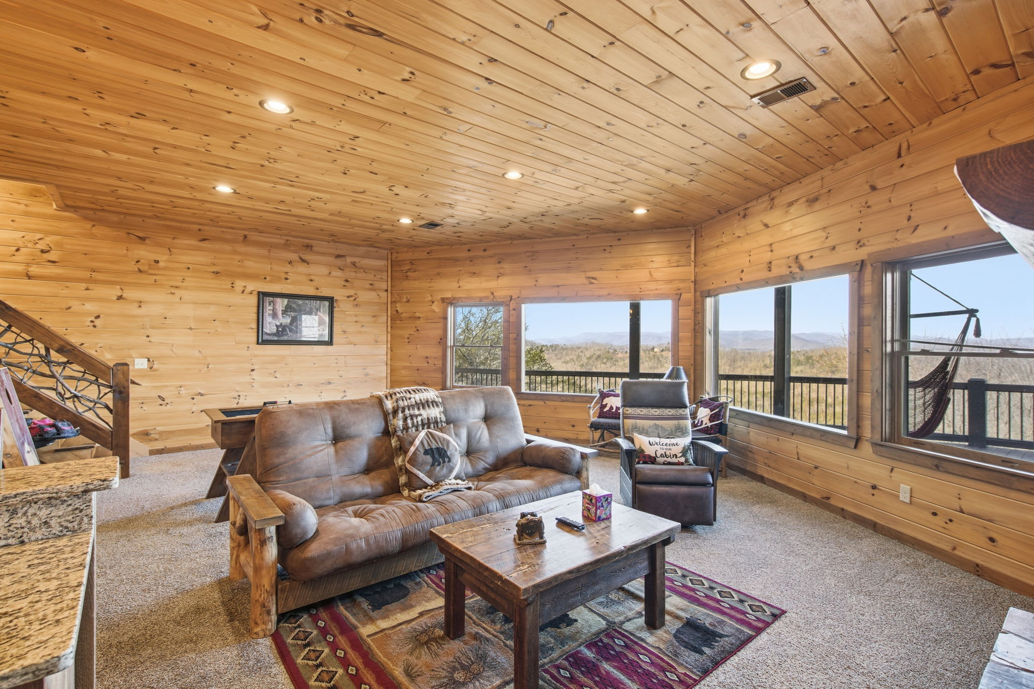 Step onto the expansive wraparound porch, where both screened and open-air sections offer year-round enjoyment. Cozy up beside one of the wood-burning stone fireplaces, enjoy al fresco drinks from plentiful seating areas, or simply soak in the 360° mountain ambience. Upstairs, a loft workspace invites you to catch up on emails between adventures. On the lower level, a large game room offers board games, shuffleboard, cozy seating, and a second flat-screen TV beneath another charming fireplace. A wet bar with an 18-bottle wine fridge and seating for three makes it easy to entertain and unwind.
