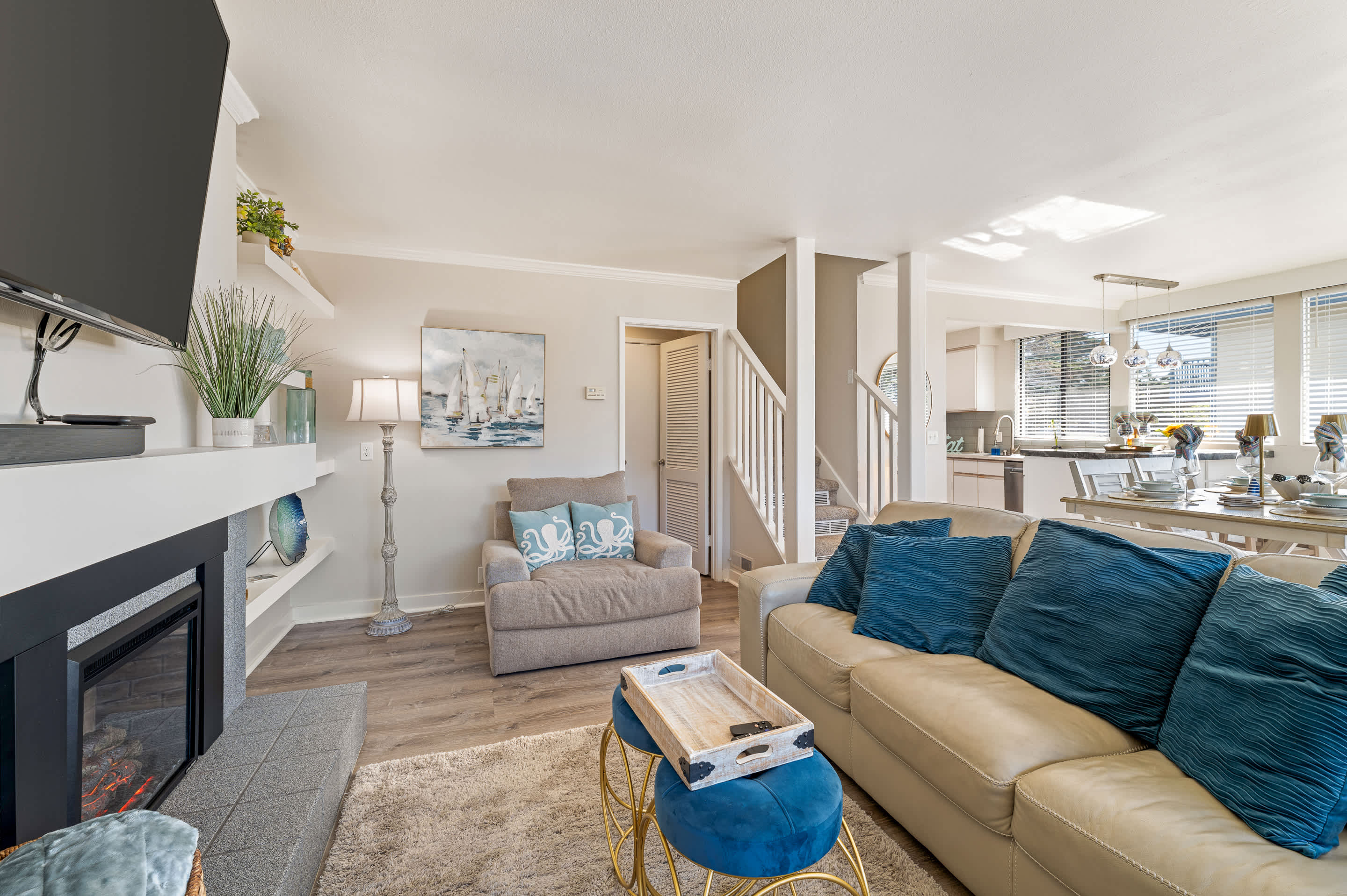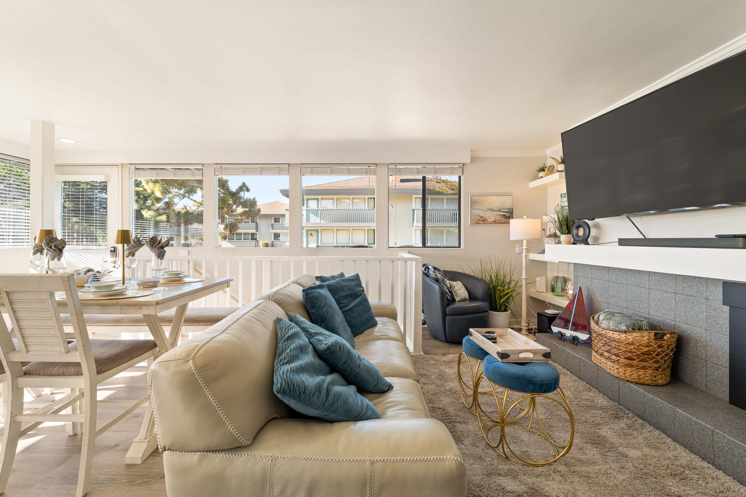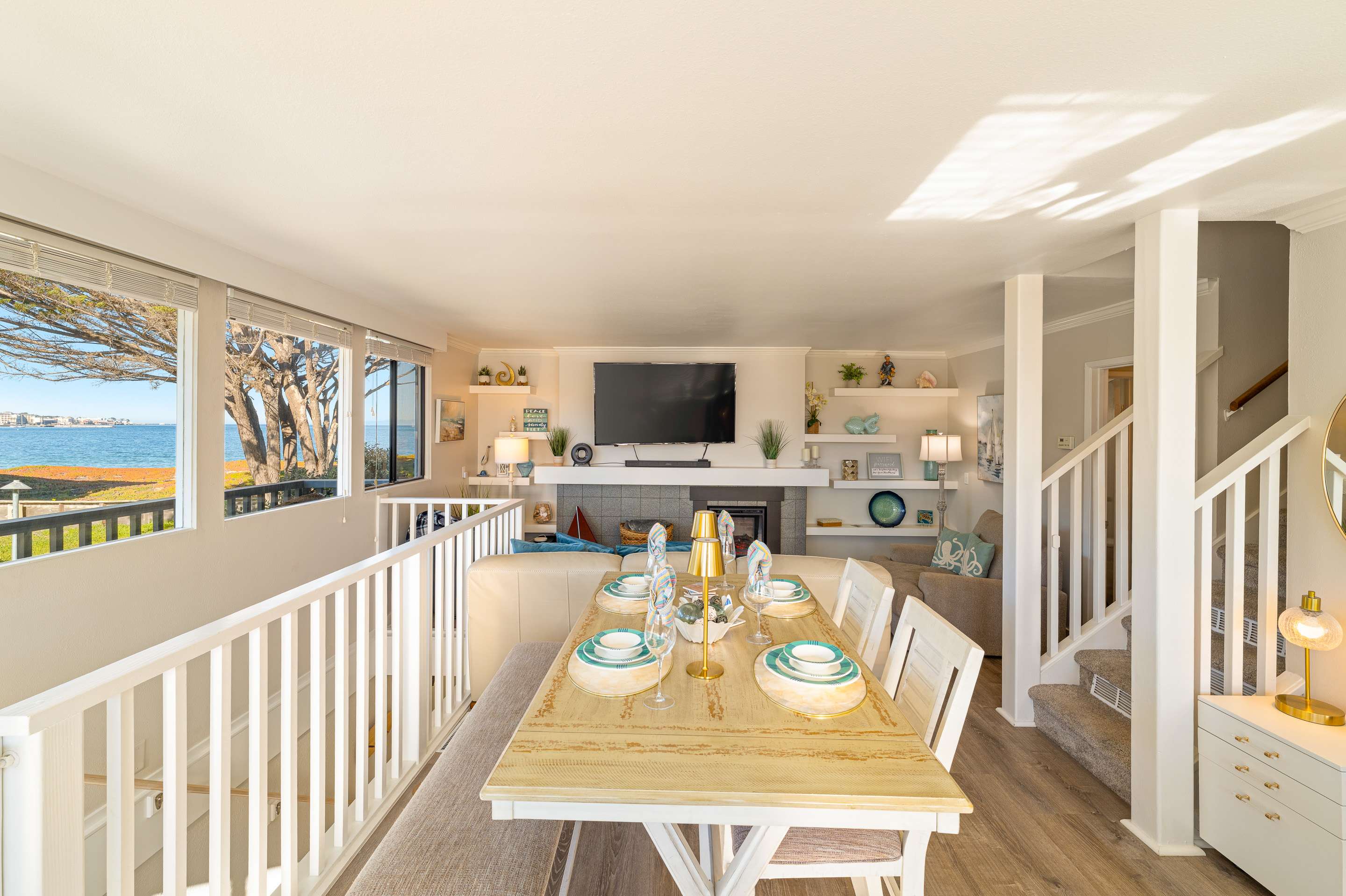 Inside, a coastal-modern warmth sets the tone as the spacious living room opens to sweeping water views. A smart TV, fireplace, comfortable couch, and two armchairs create an inviting space to unwind after a day by the ocean. Adjacent, the dining table for four anchors the open layout, making shared meals feel effortless and connected. The kitchen blends style with functionality, featuring stainless steel appliances, counter seating for two, and open sightlines straight to the Monterey Wharf and Cannery Row—letting you prep breakfast with a view. Slide open the doors to step onto the private balcony, where coastal breezes and shimmering bay views set the stage for morning coffee or sunset wine.