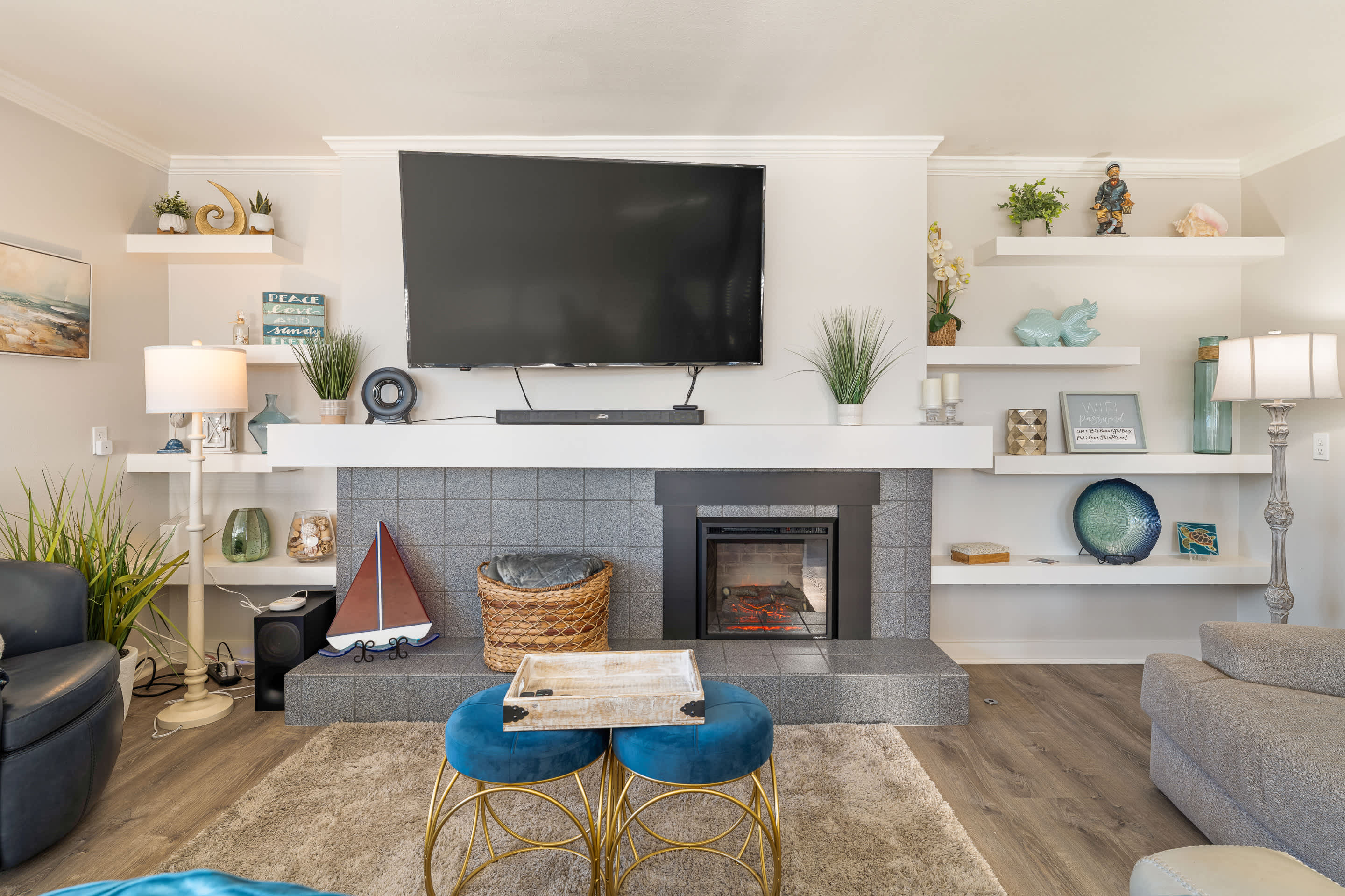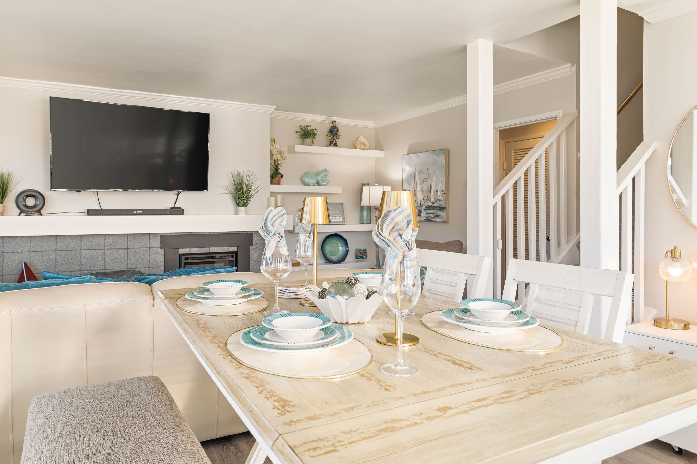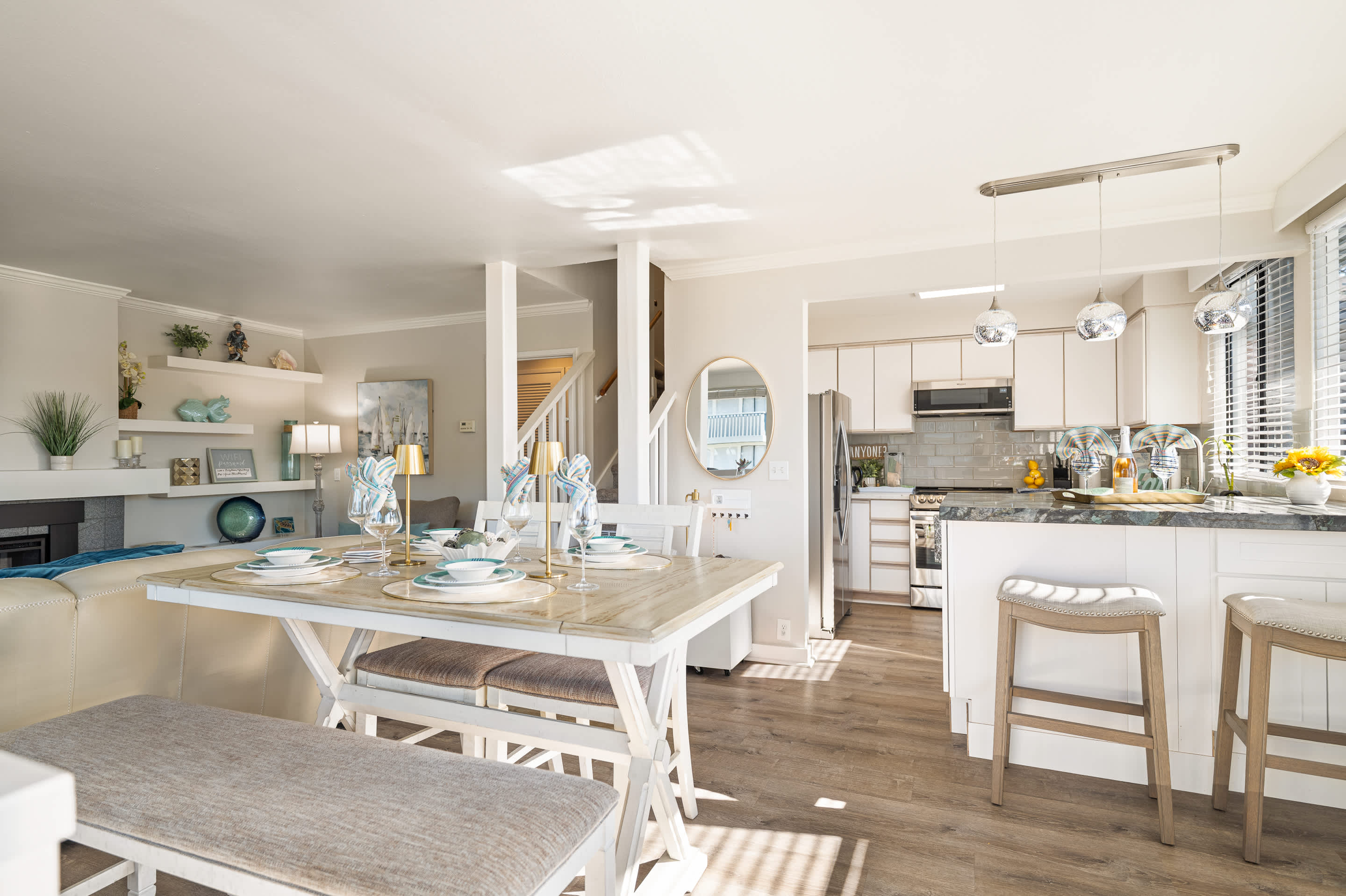 Inside, a coastal-modern warmth sets the tone as the spacious living room opens to sweeping water views. A smart TV, fireplace, comfortable couch, and two armchairs create an inviting space to unwind after a day by the ocean. Adjacent, the dining table for four anchors the open layout, making shared meals feel effortless and connected. The kitchen blends style with functionality, featuring stainless steel appliances, counter seating for two, and open sightlines straight to the Monterey Wharf and Cannery Row—letting you prep breakfast with a view. Slide open the doors to step onto the private balcony, where coastal breezes and shimmering bay views set the stage for morning coffee or sunset wine.