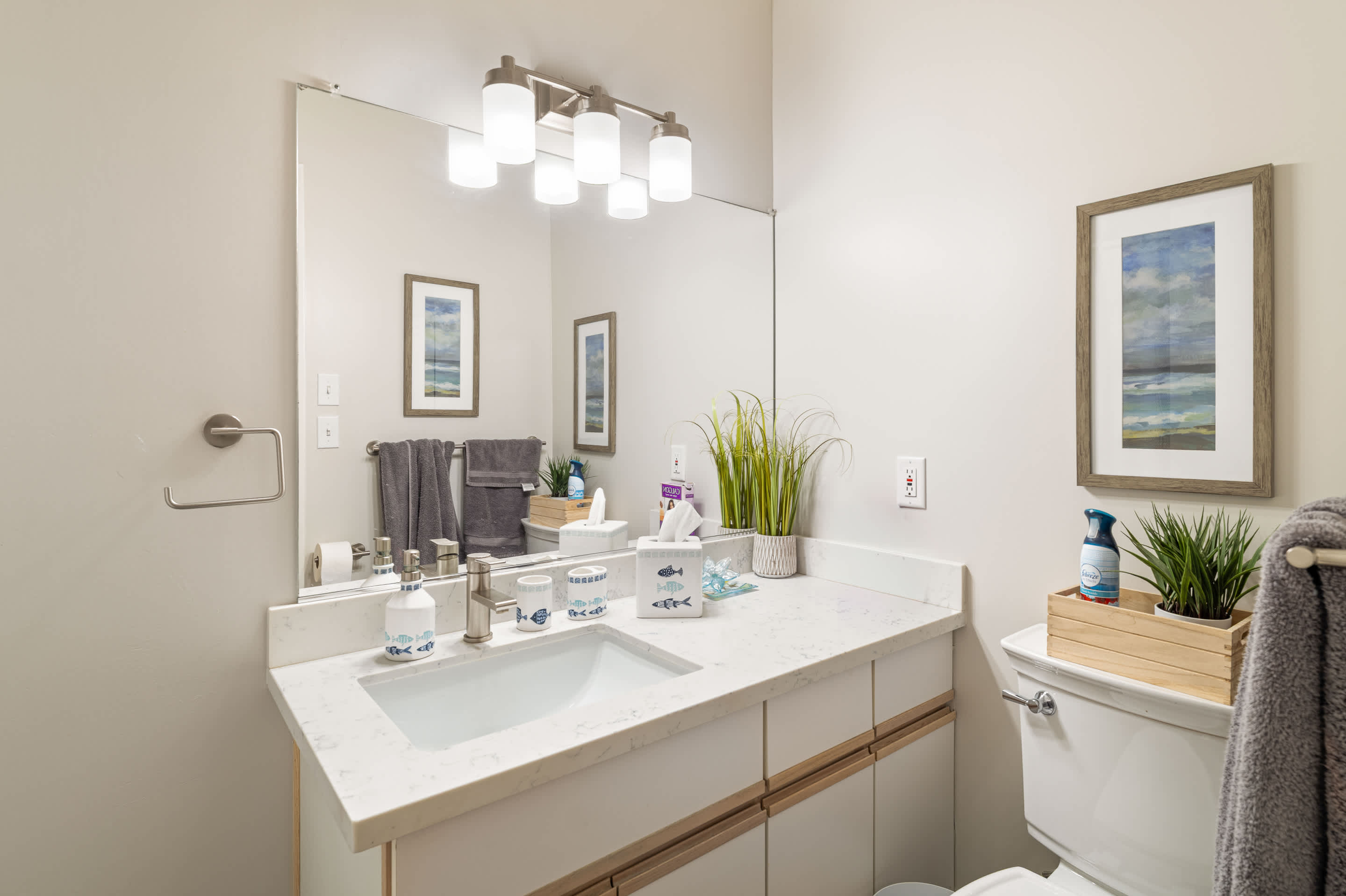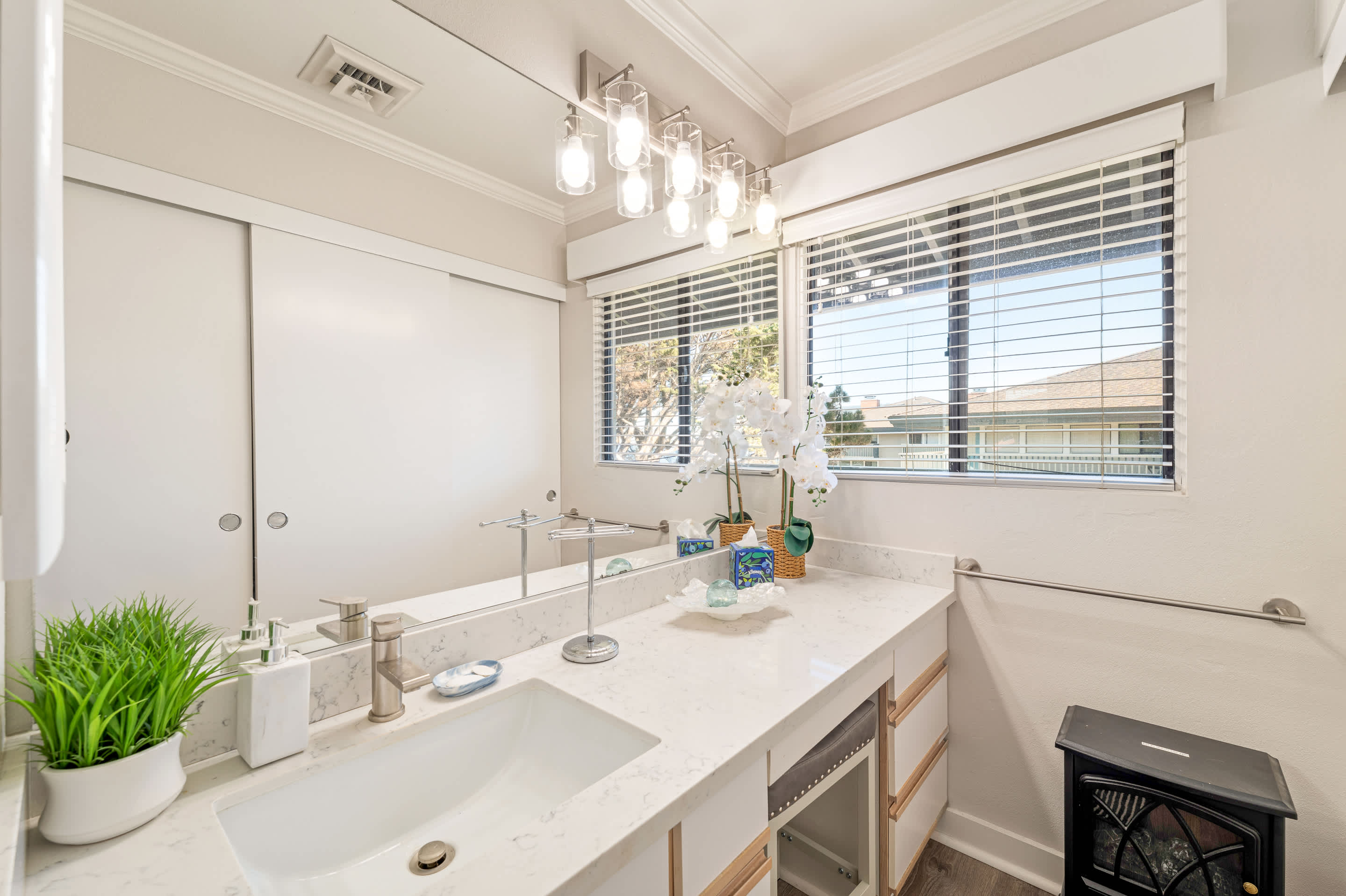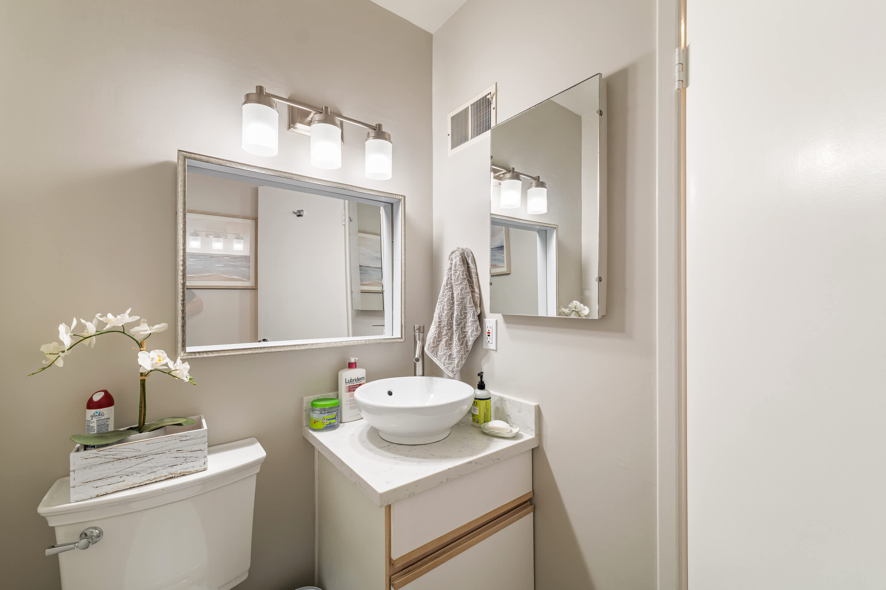 This home also includes a half bathroom and a full guest bathroom with a single vanity and shower/tub combo.