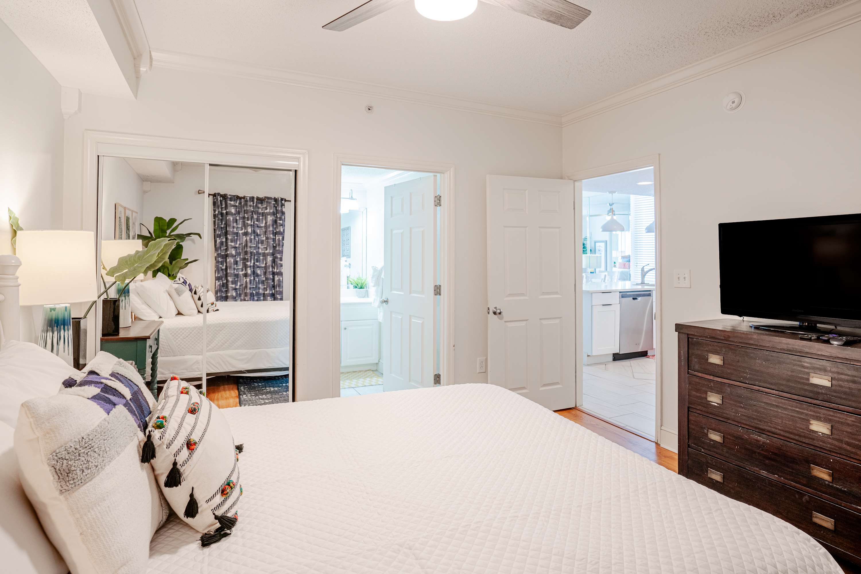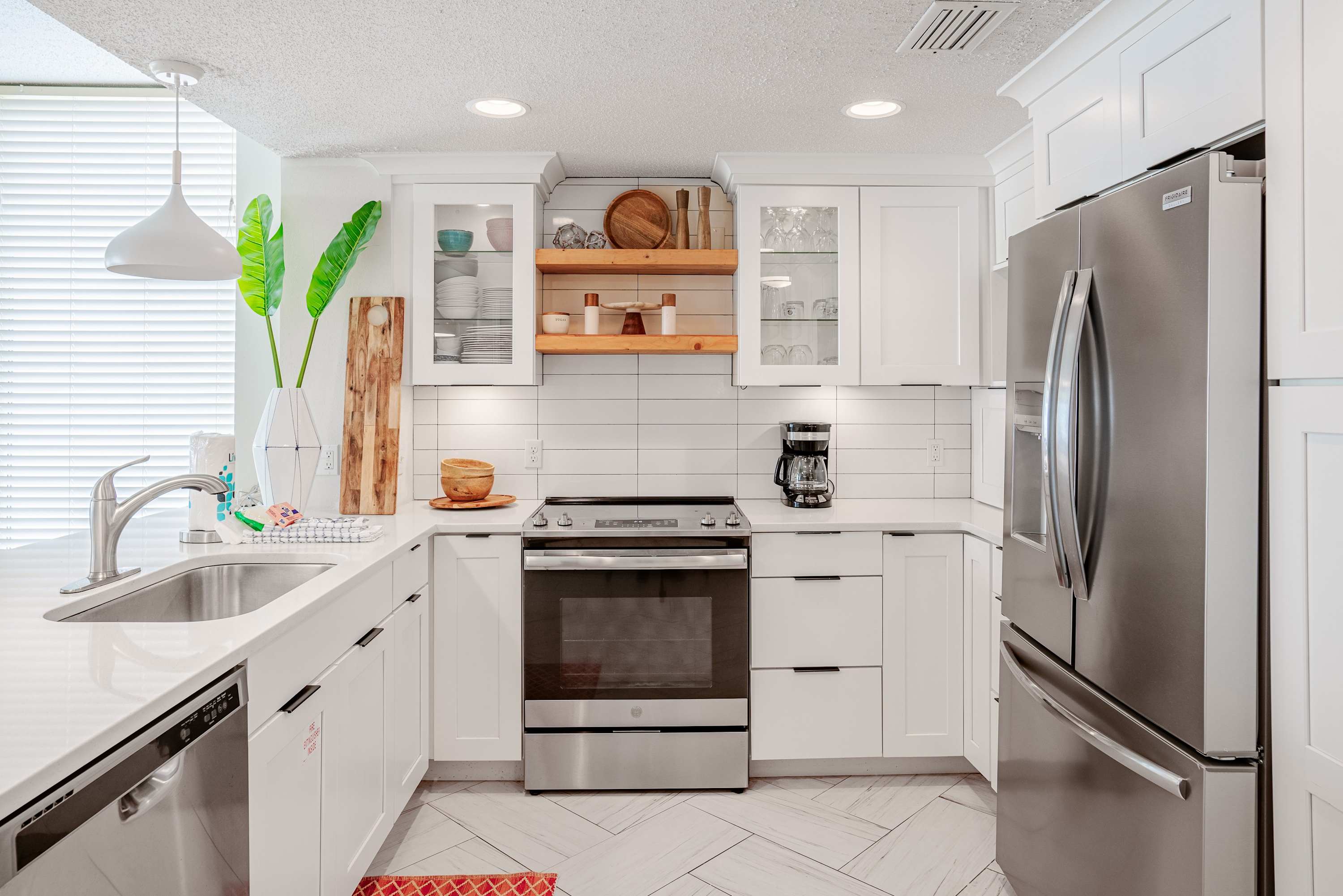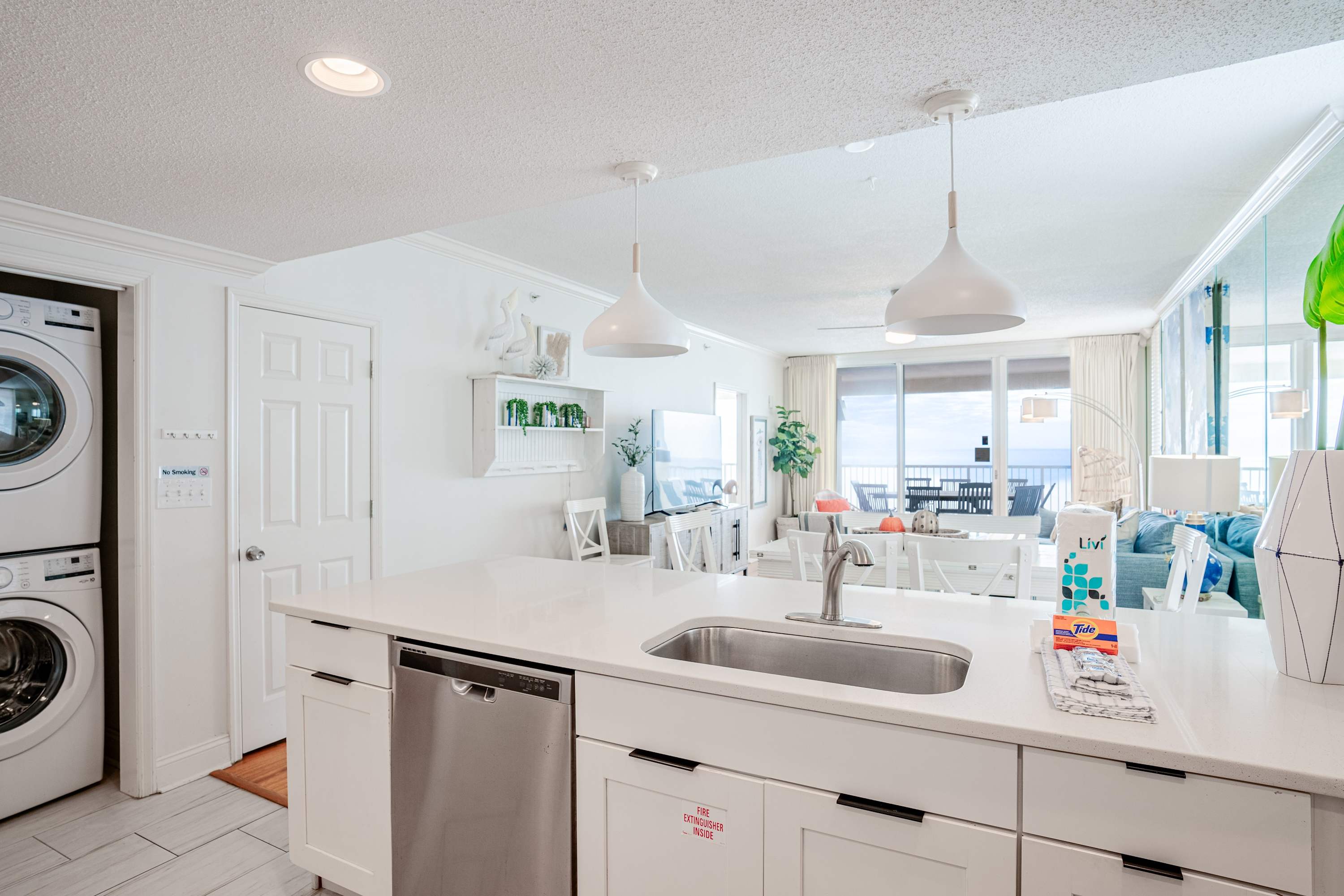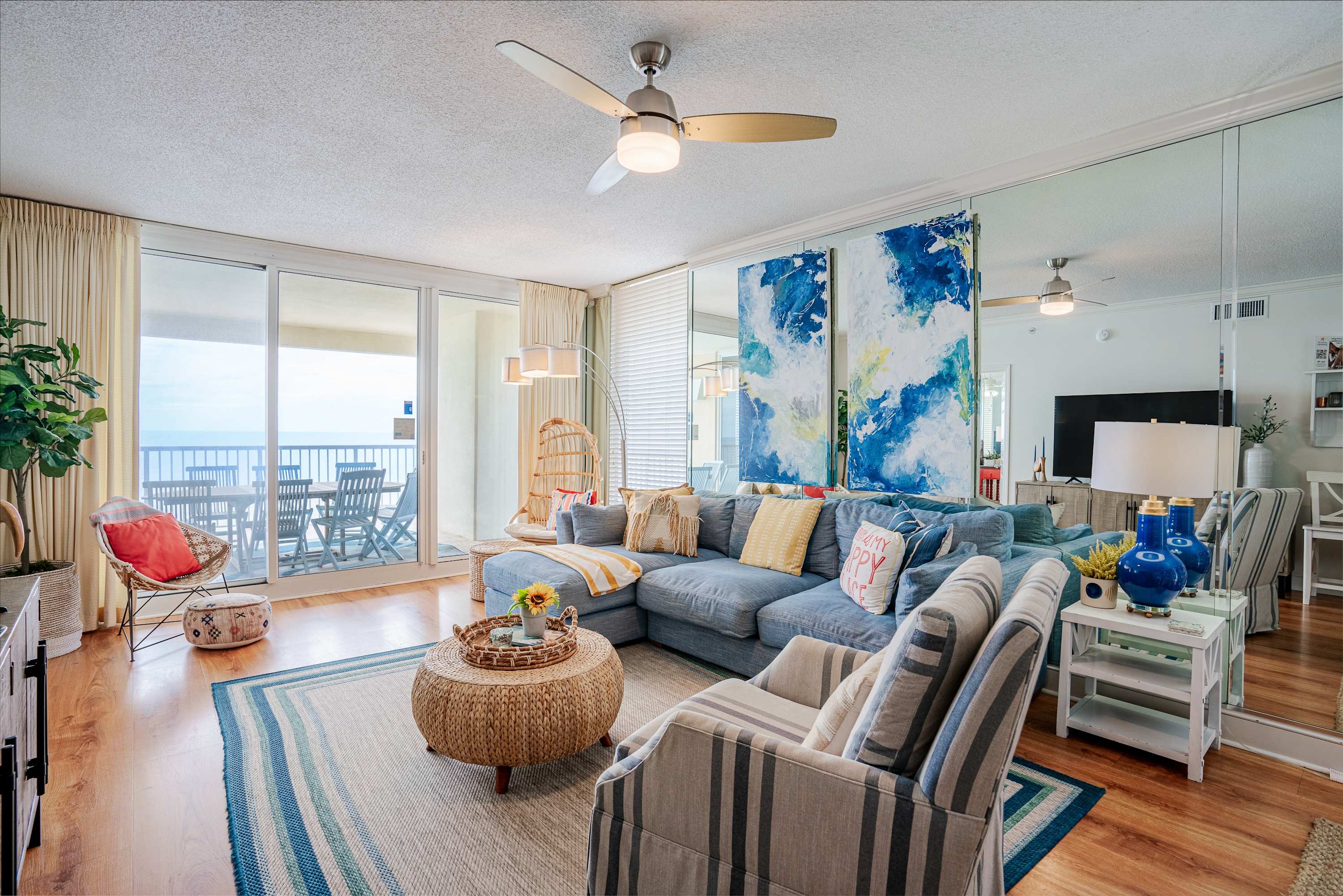 Inside, coastal light and ocean blues set the tone for your stay. The living room welcomes you with a smart TV, a plush couch with chaise, and a comfortable armchair—perfect for winding down after long beach days. Floor-to-ceiling sliding glass doors pull your eyes straight to the horizon and open to your private balcony for true indoor-outdoor living. The kitchen sits just behind, blending style and convenience with stainless steel appliances, white cabinetry, and bright stone countertops. Counter seating for four makes breakfasts and quick bites easy, while the adjacent dining table for six is ideal for dinners together or planning the next day’s adventures.