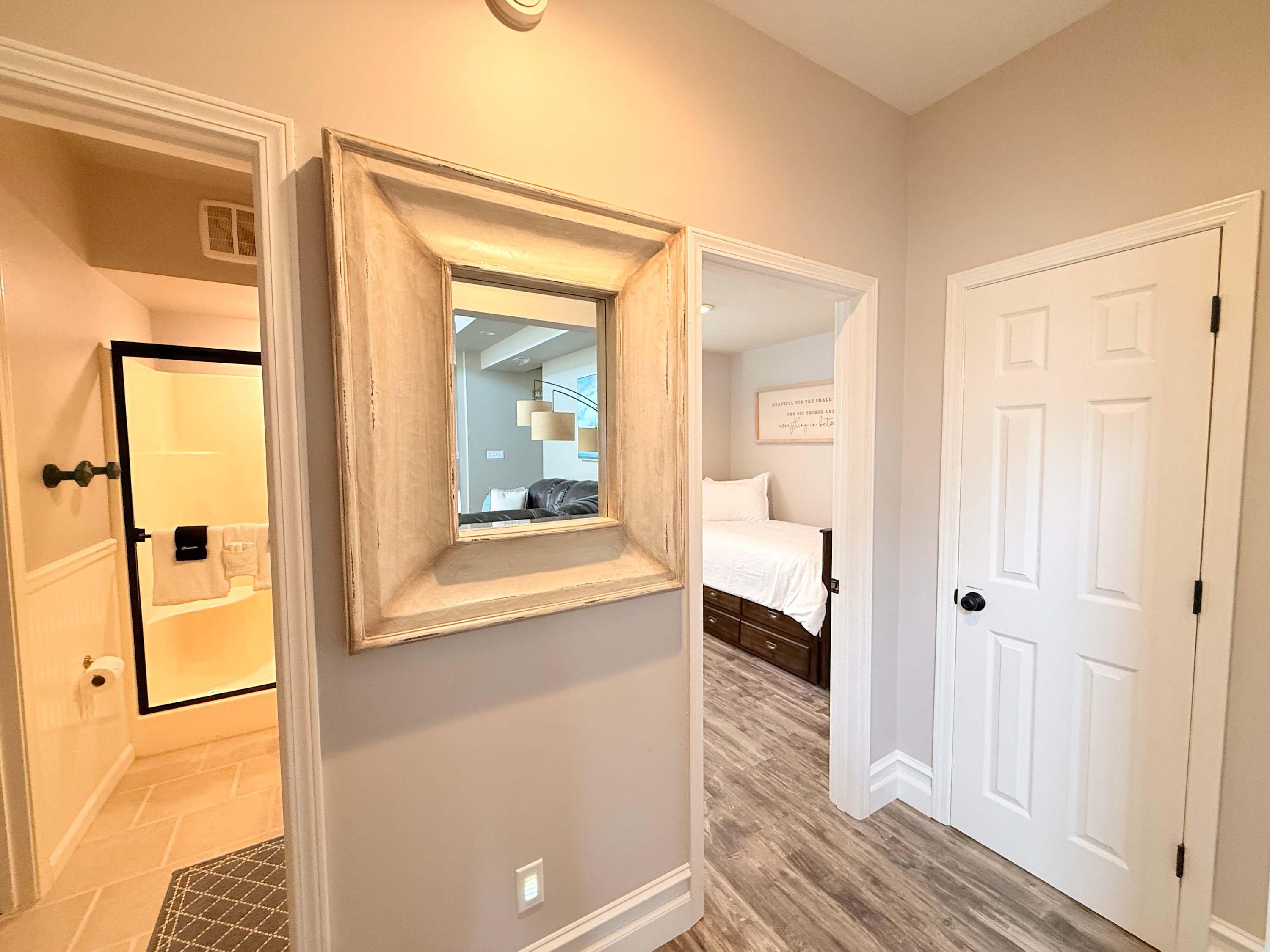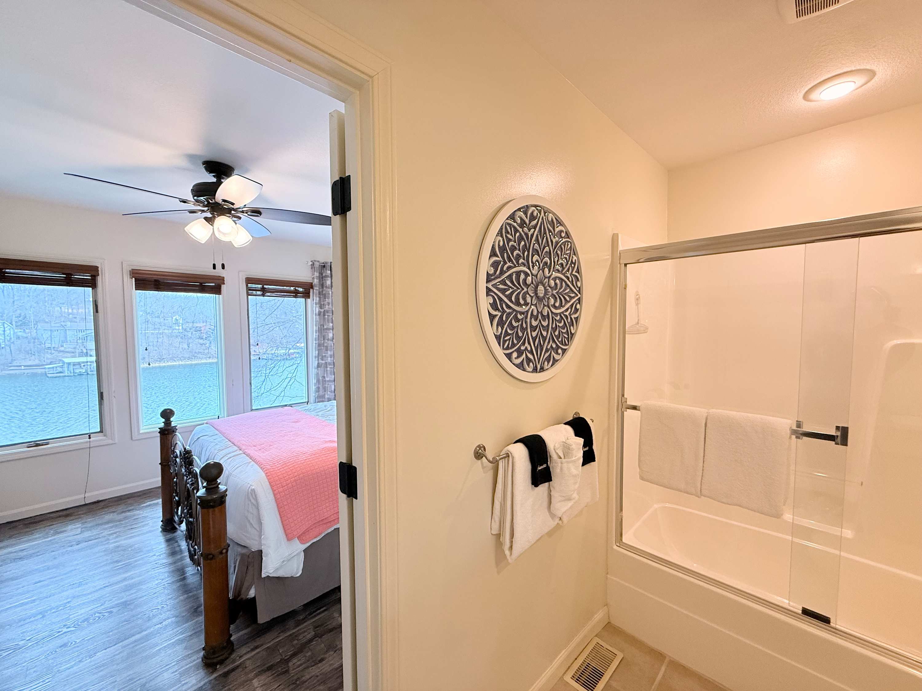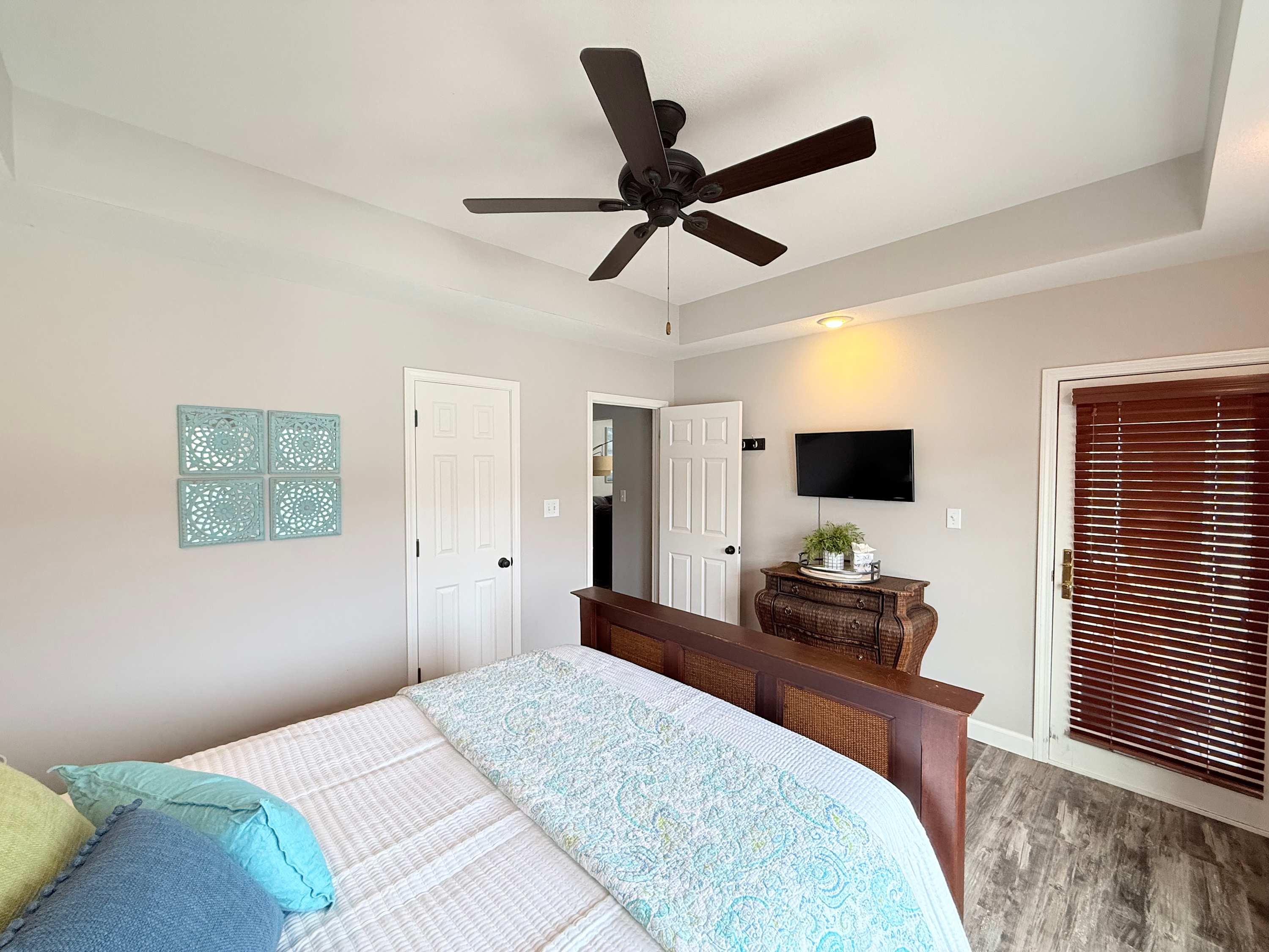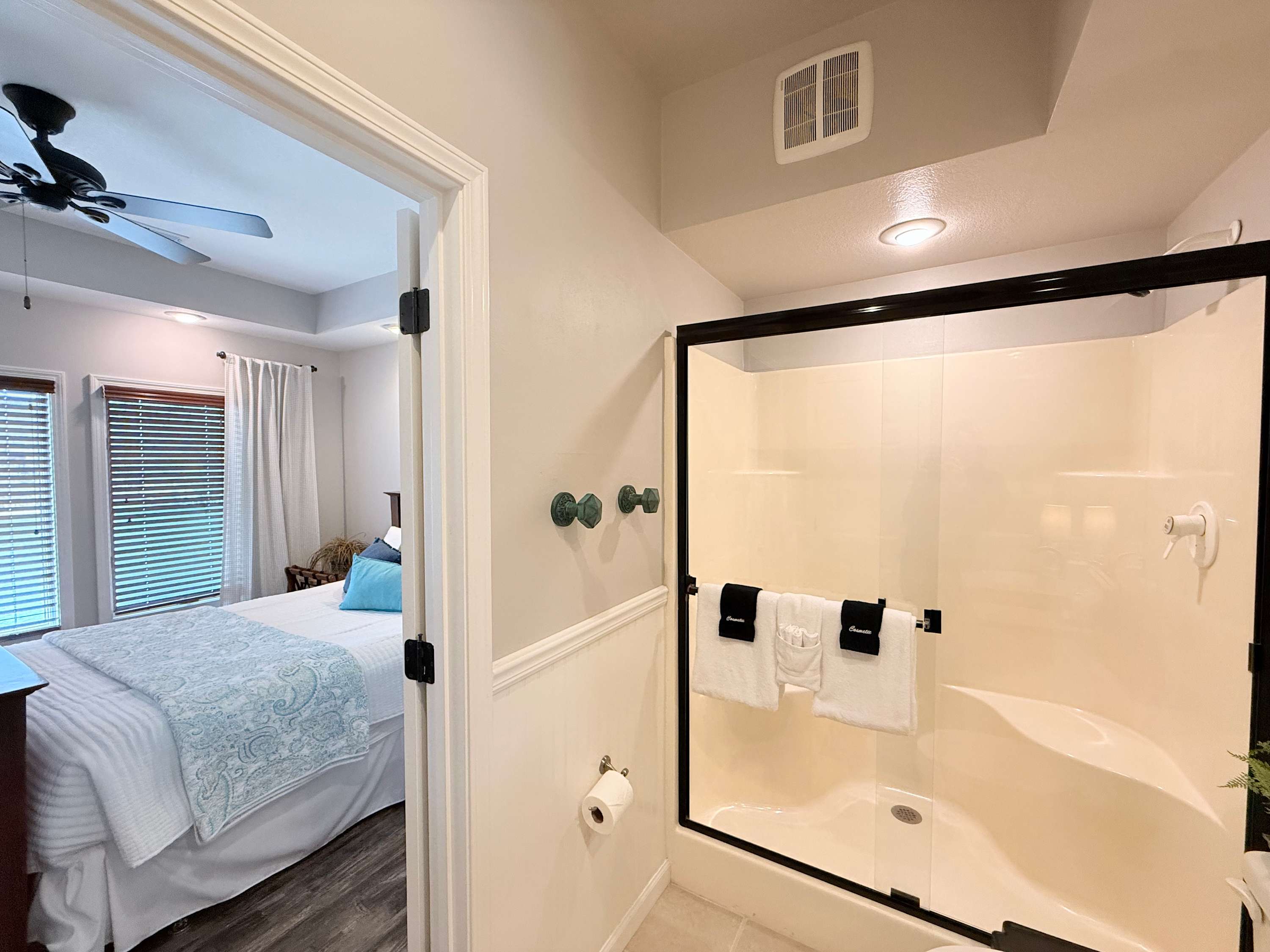 Bedroom #4 includes a queen size bed, a smart TV, deck access, and a Jack-and-Jill bathroom with a single vanity and a walk-in shower, also accessible via the hallway.