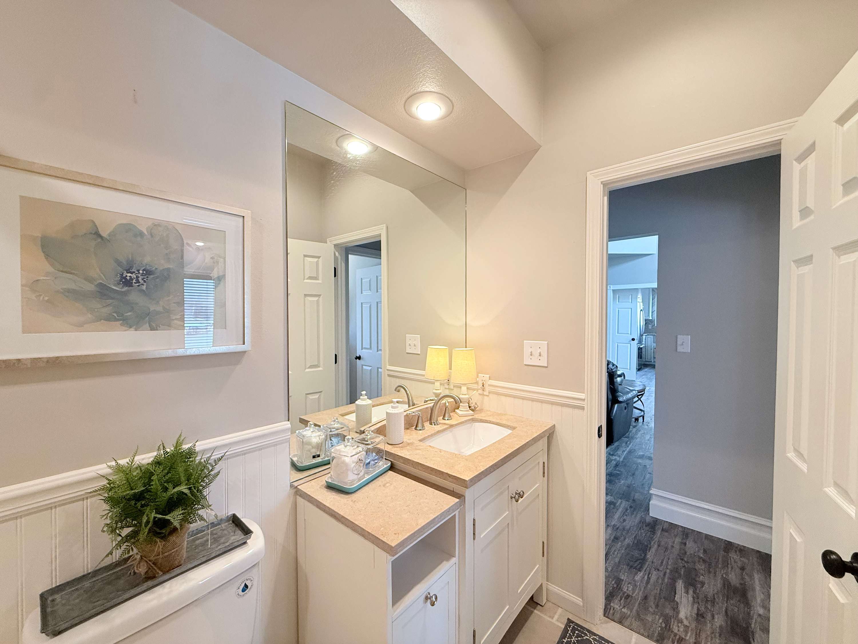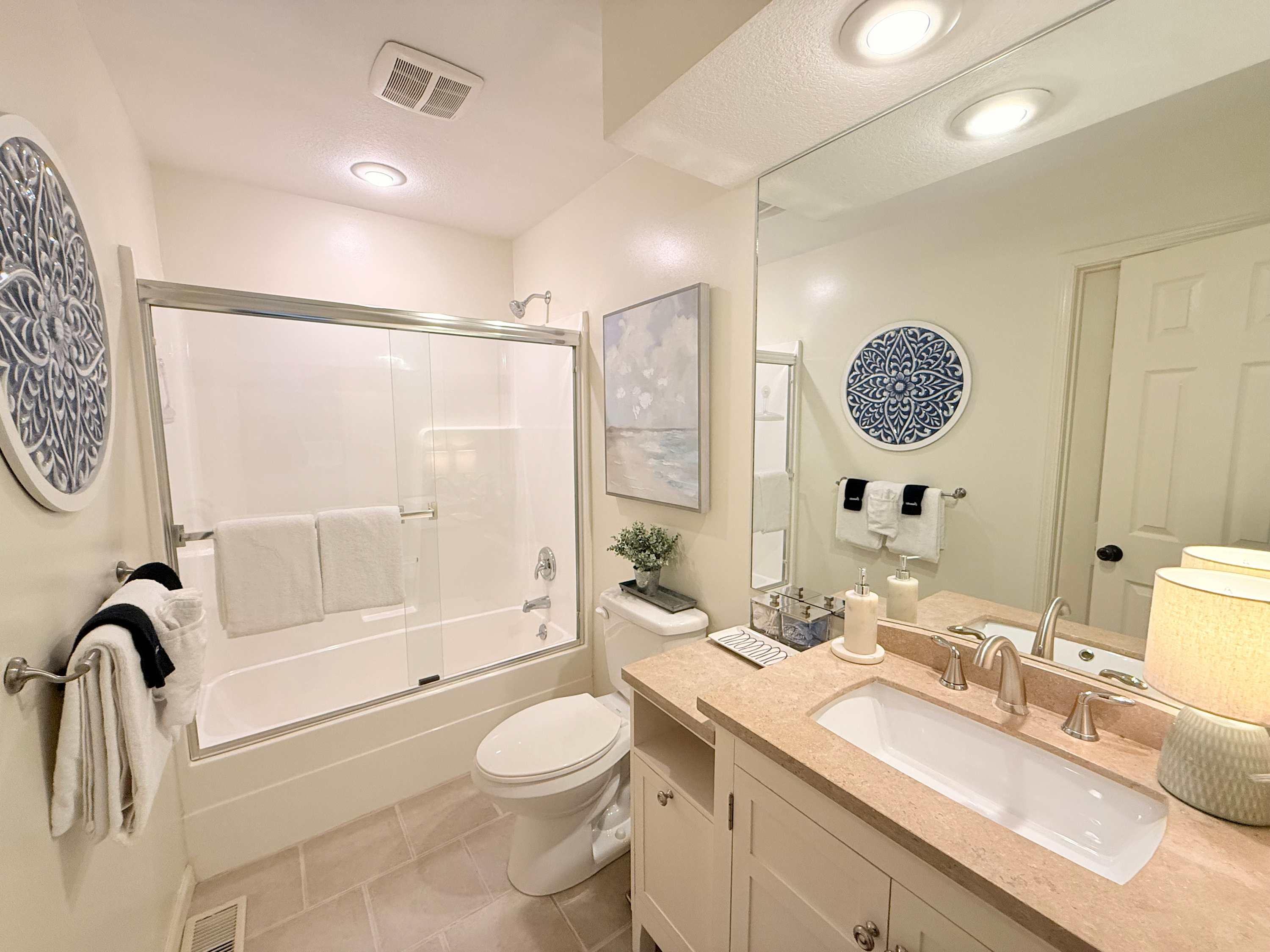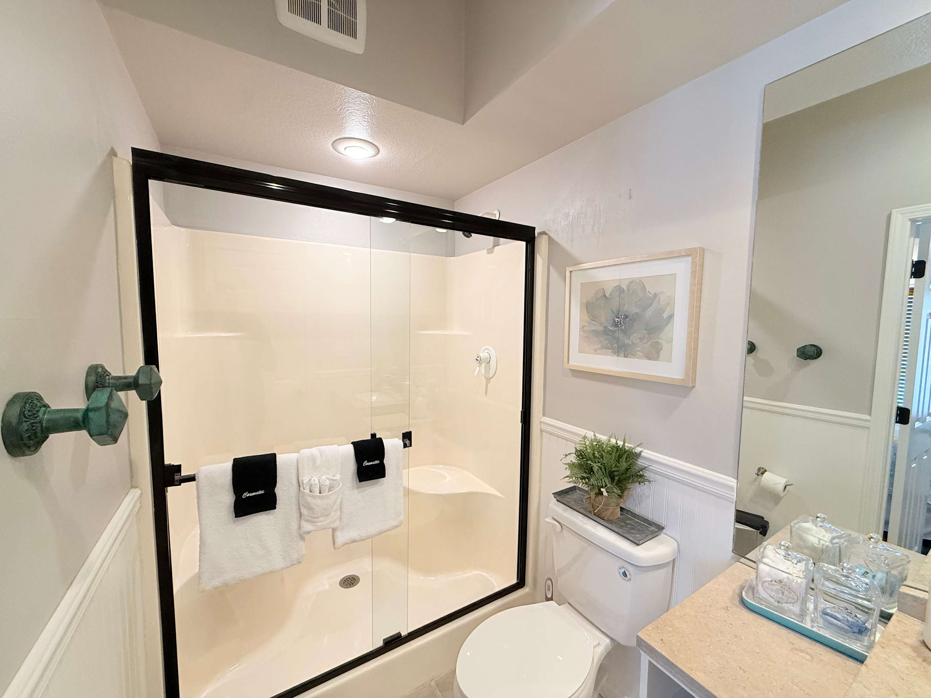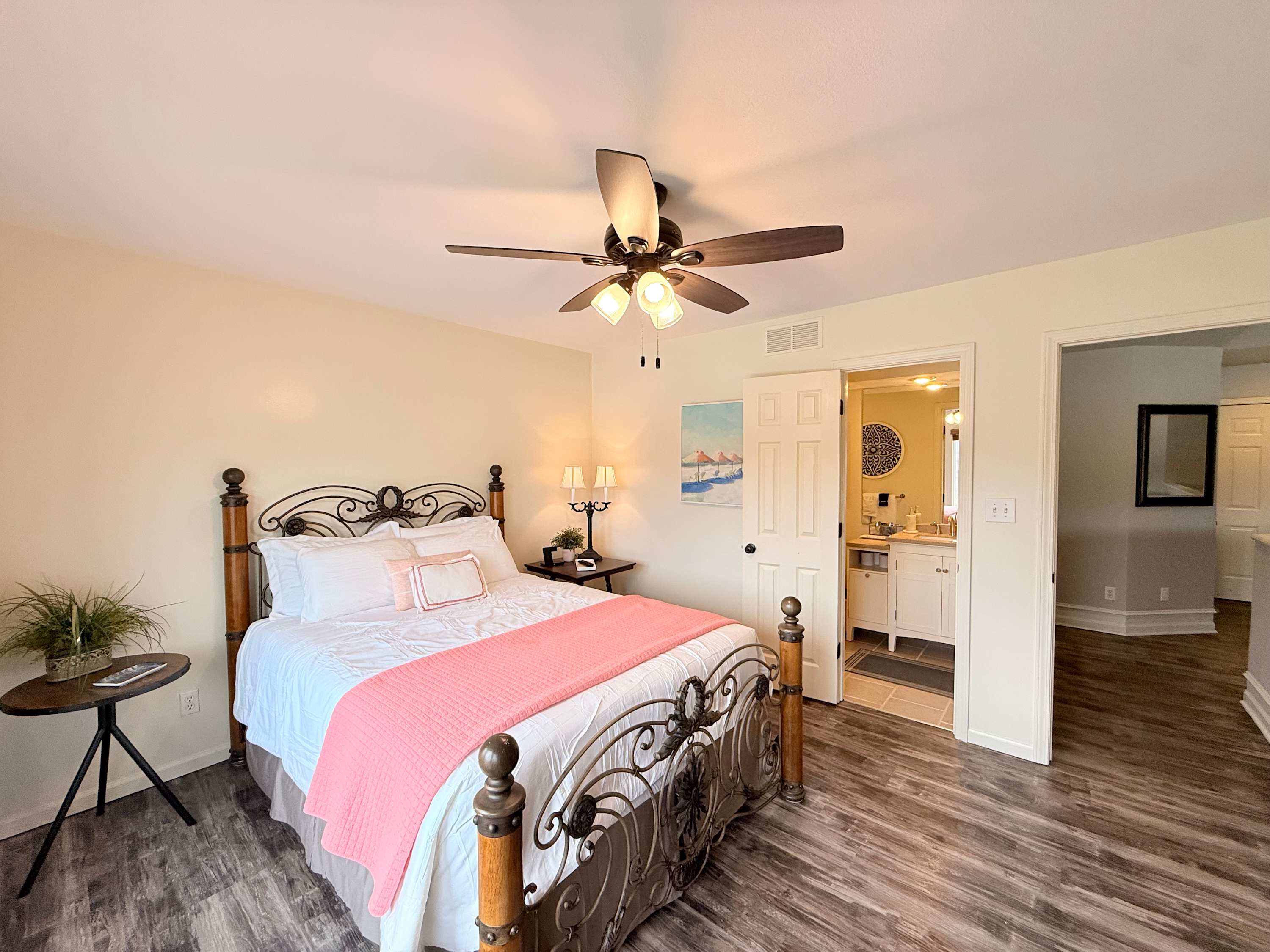 Bedroom #4 includes a queen size bed, a smart TV, deck access, and a Jack-and-Jill bathroom with a single vanity and a walk-in shower, also accessible via the hallway.