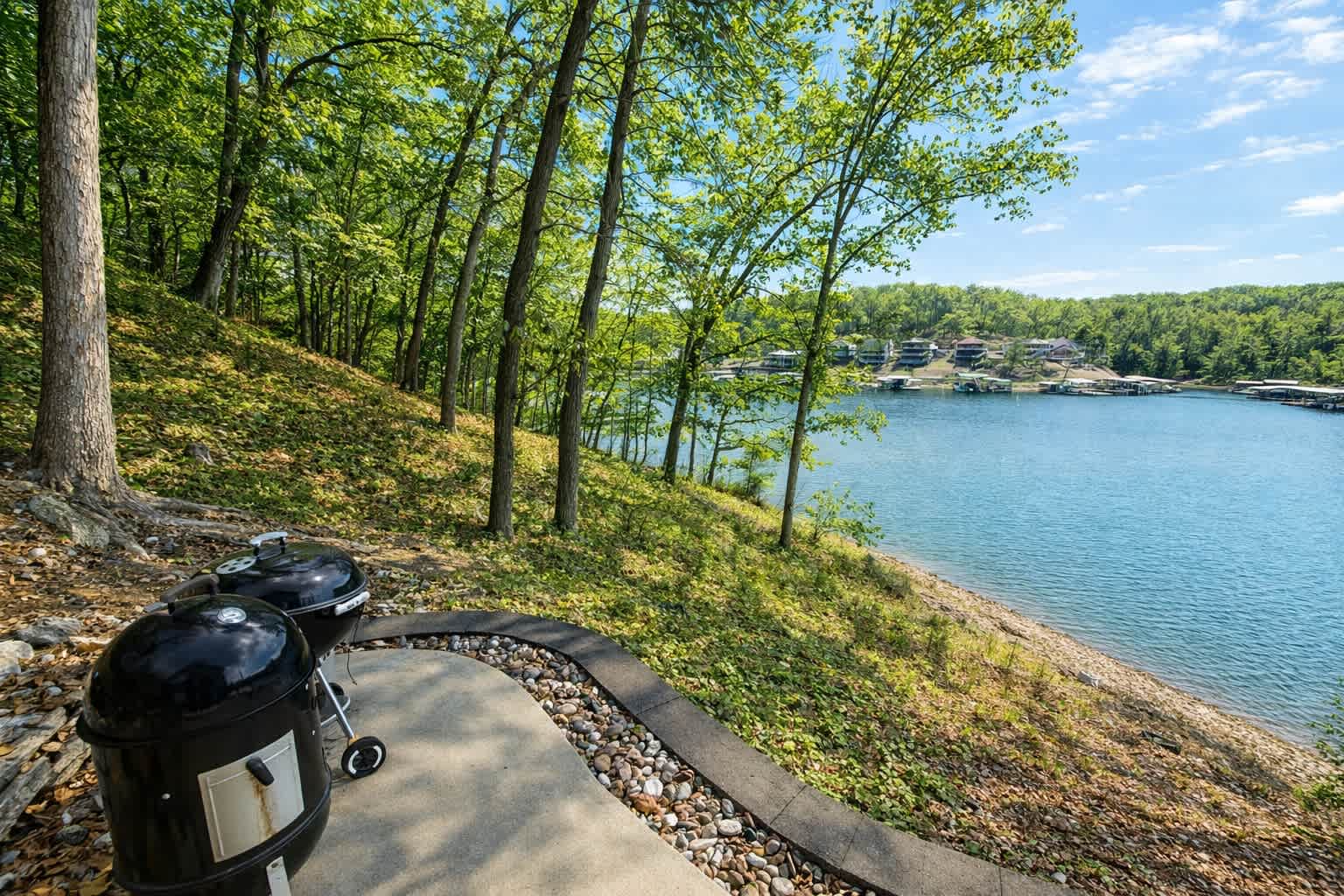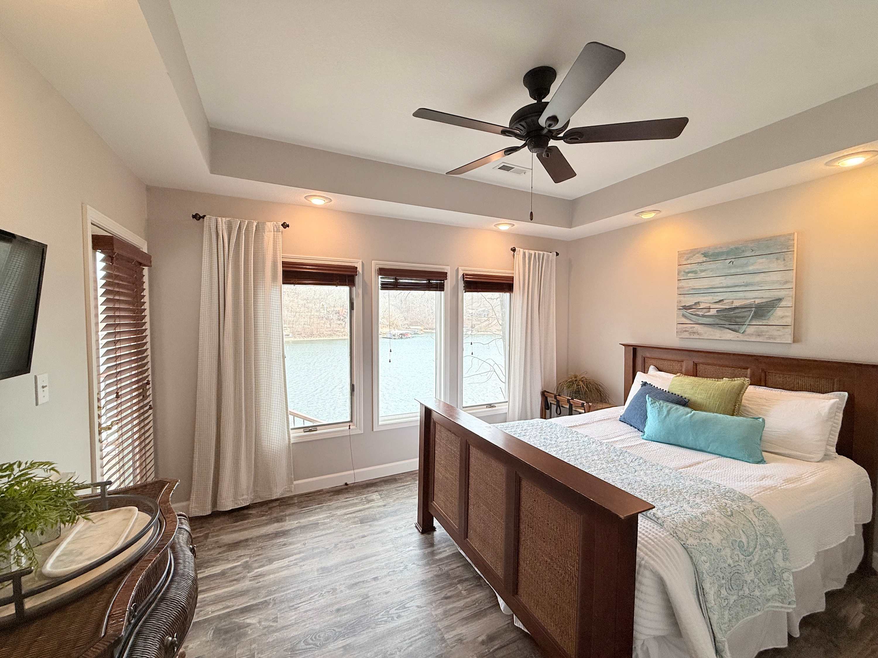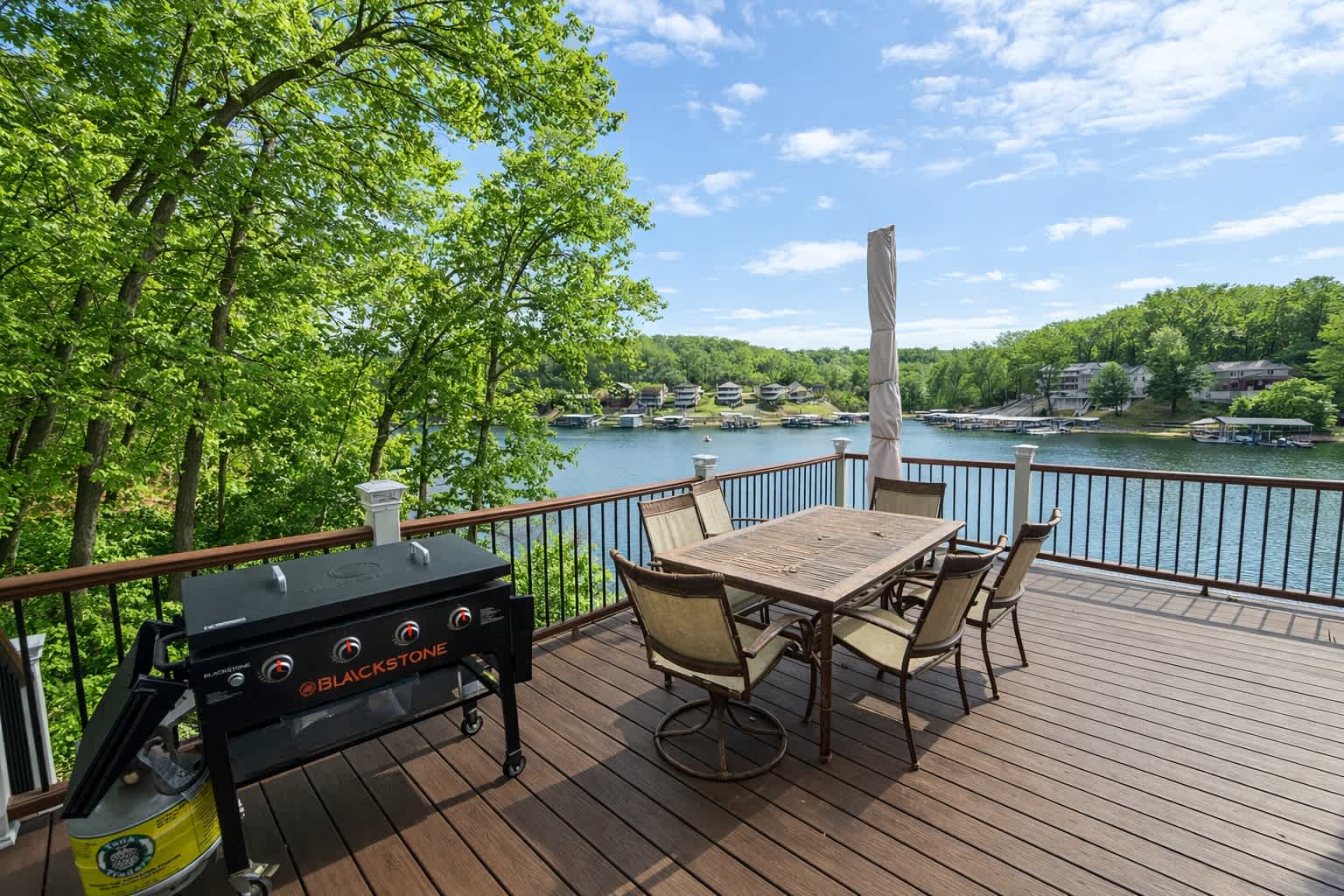 Outside is where Mimosa Mornings truly shines, offering three distinct outdoor spaces designed for relaxing and enjoying lake life. The upper deck is perfect for gathering, featuring outdoor dining along with a gas griddle and BBQ grill—ideal for meals with a view. Below, the lower patio with a lakeside bar invites long afternoons with comfortable seating, a TV for watching the game, and a fire pit for evenings by the water.