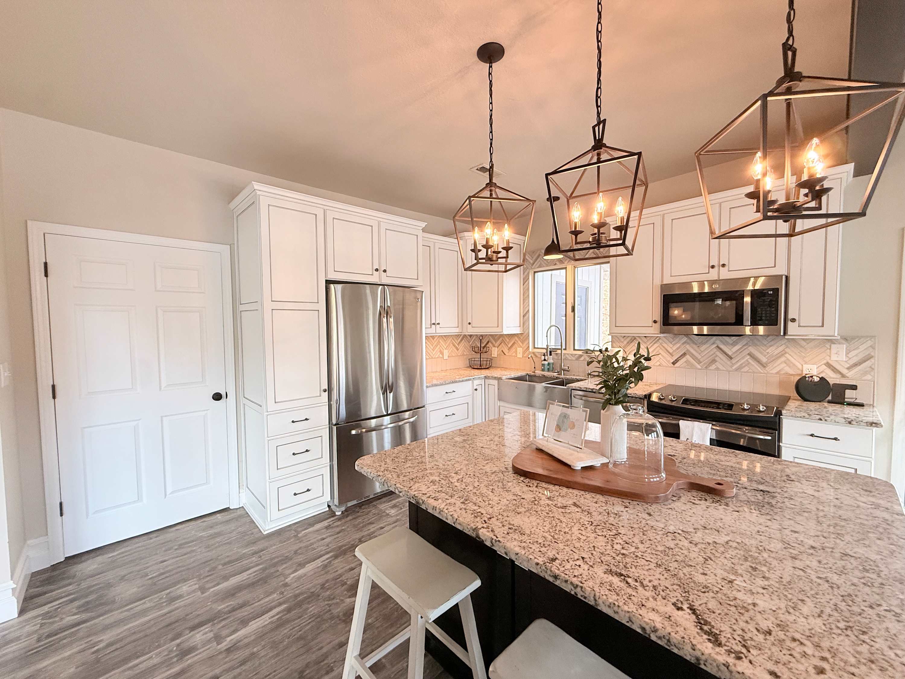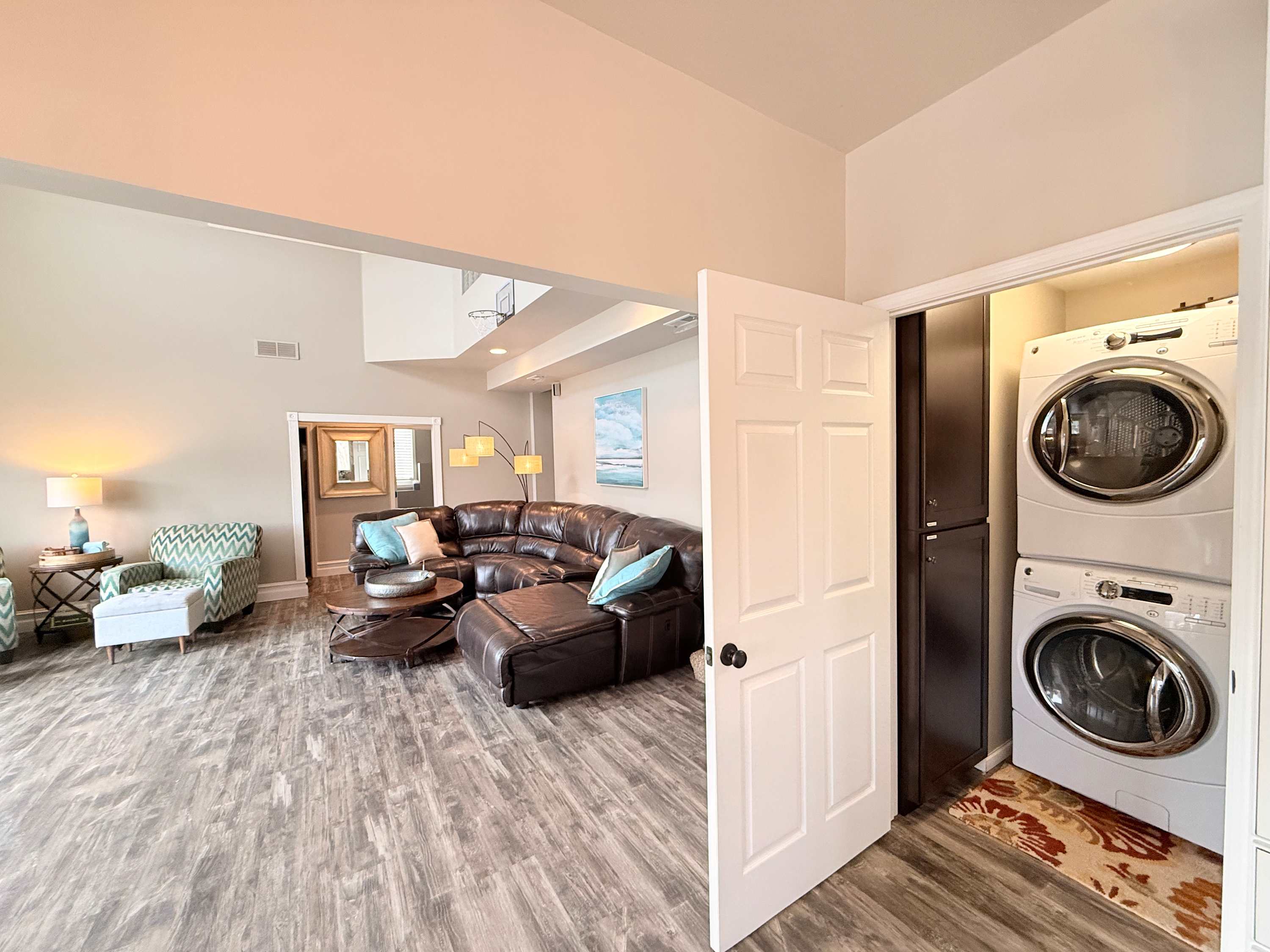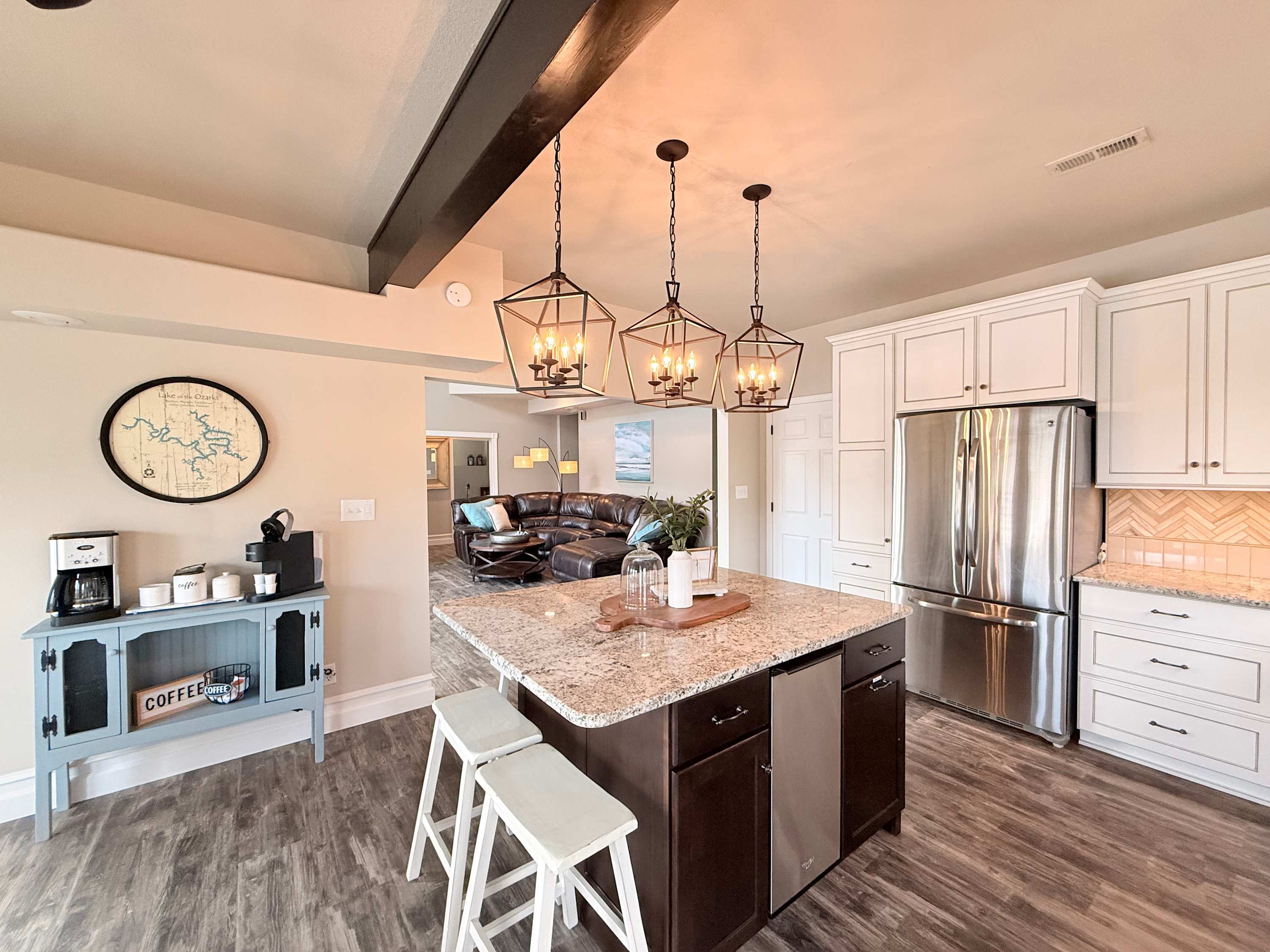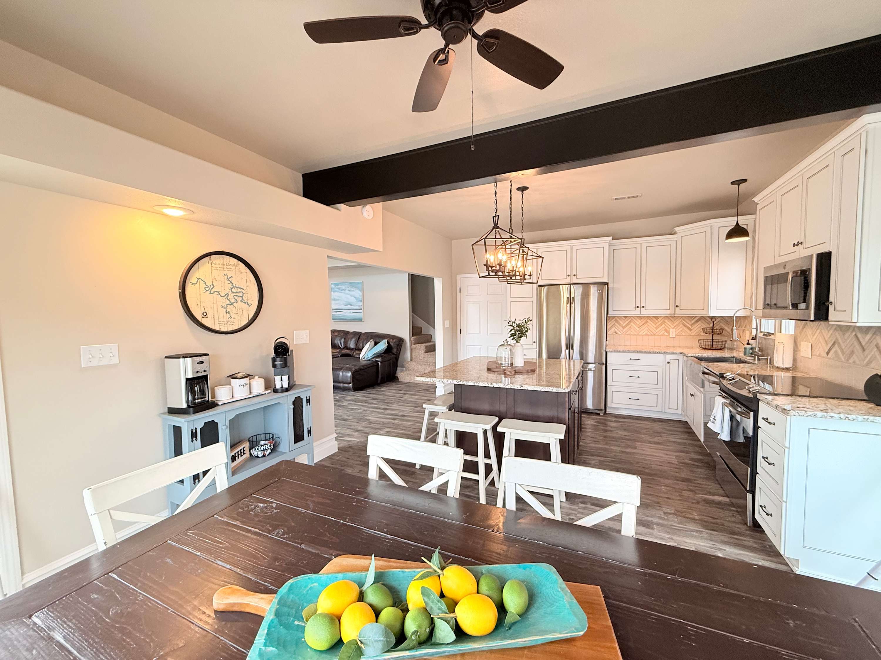 Step inside to a bright, open living room with soaring ceilings that instantly create a sense of space and relaxation. A wraparound couch, two cozy armchairs, and a smart TV with cable make it the ideal spot for movie nights, game days, or unwinding after time on the water. The kitchen flows easily from the living space and is set up for effortless mornings and group meals. Start your day at the coffee station featuring both a Keurig single-serve and Cuisinart drip coffee maker, then gather at the counter seating for four or the dining table for six just beyond. Stainless steel appliances complete the space, making it easy to cook in or reheat your favorite lake-day meals.