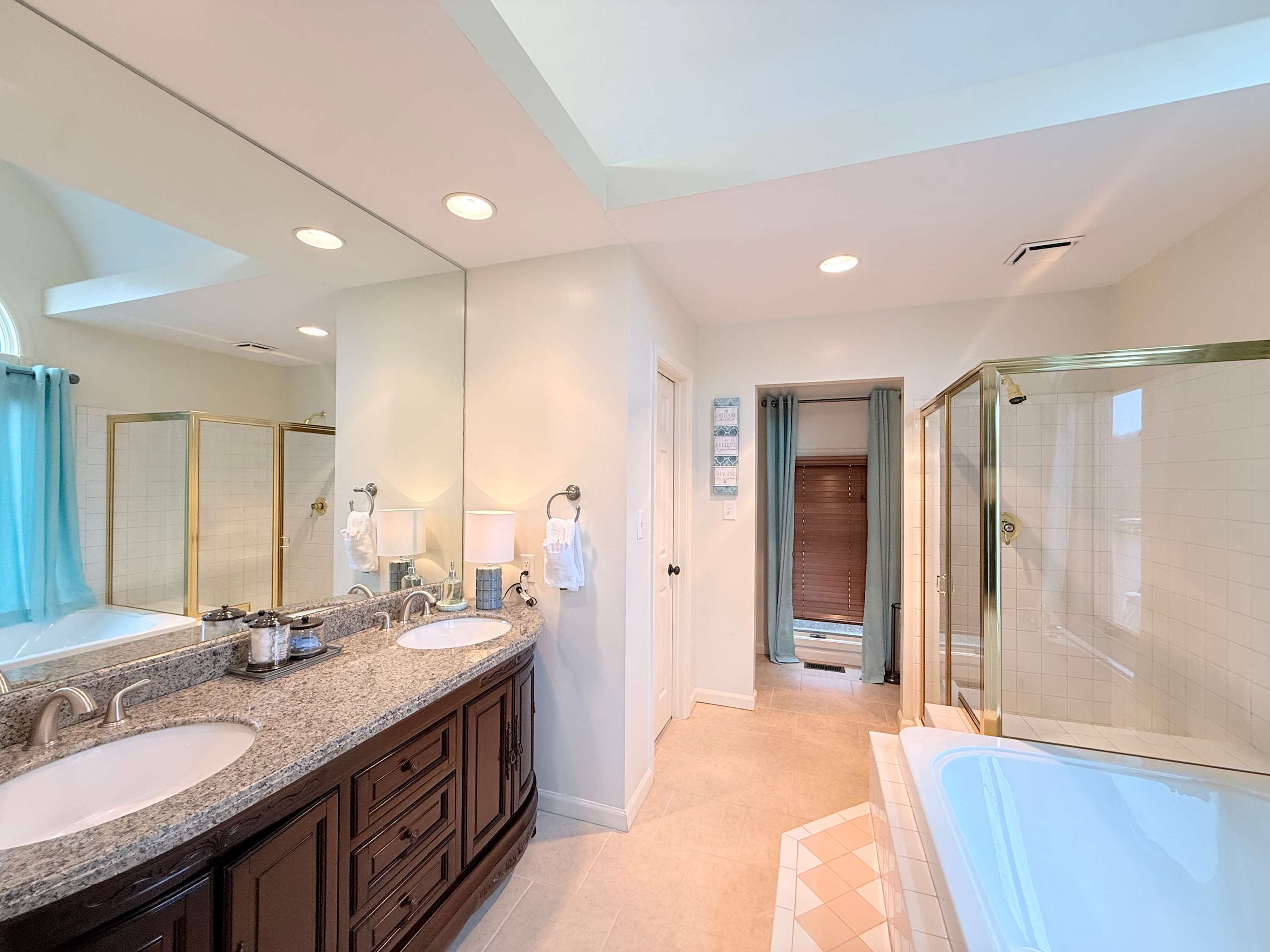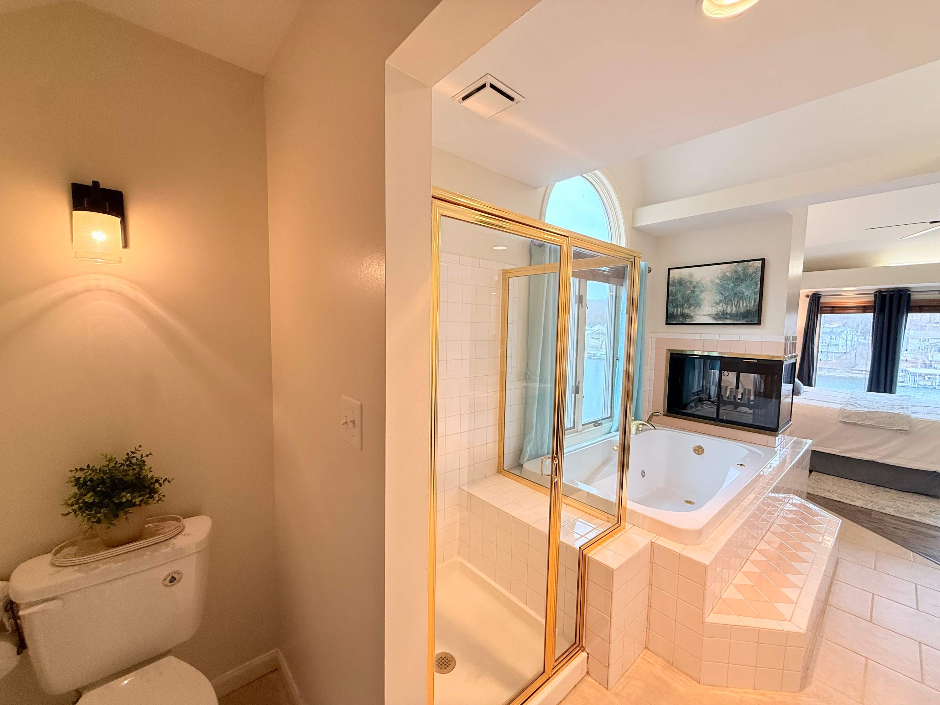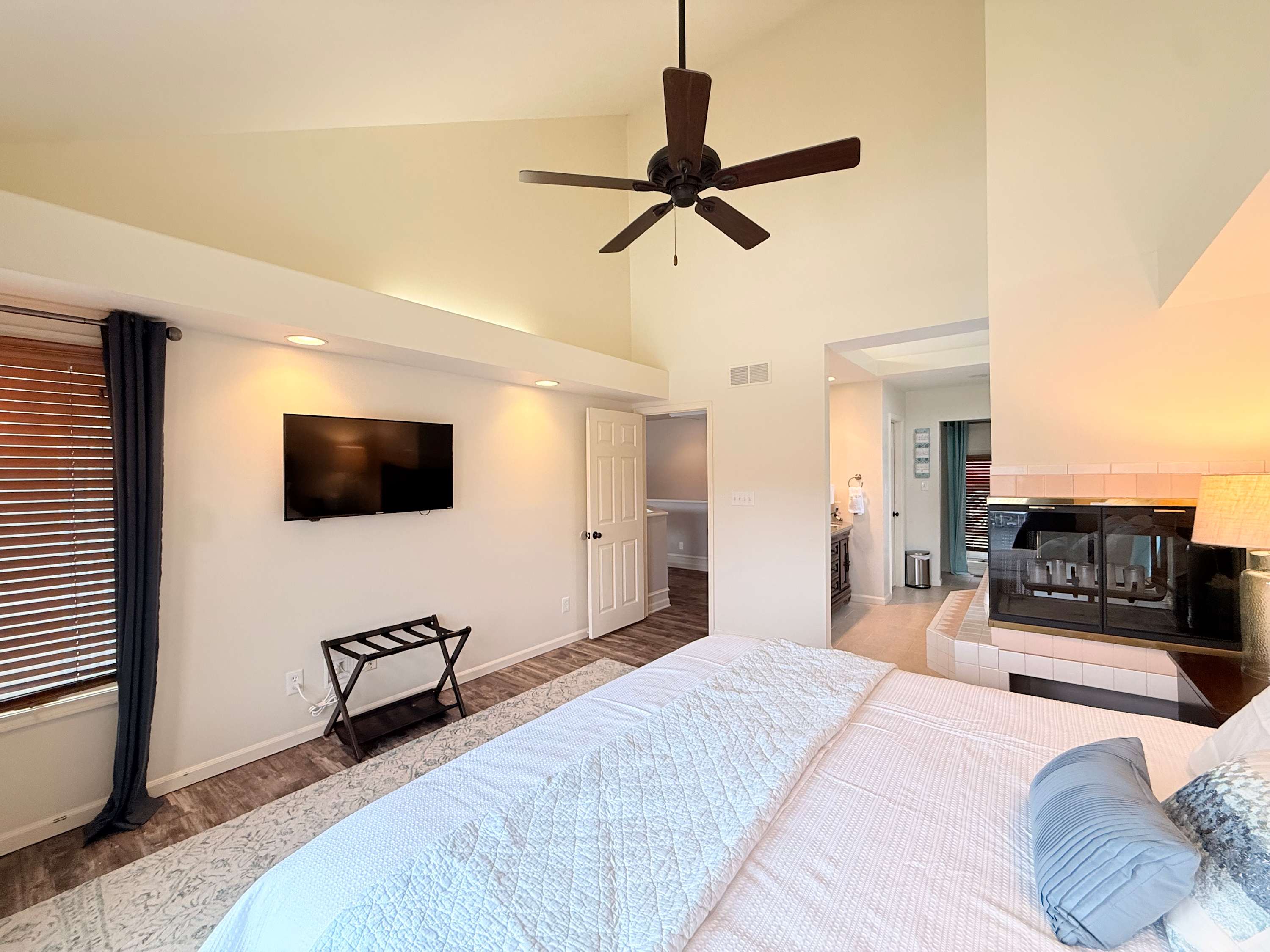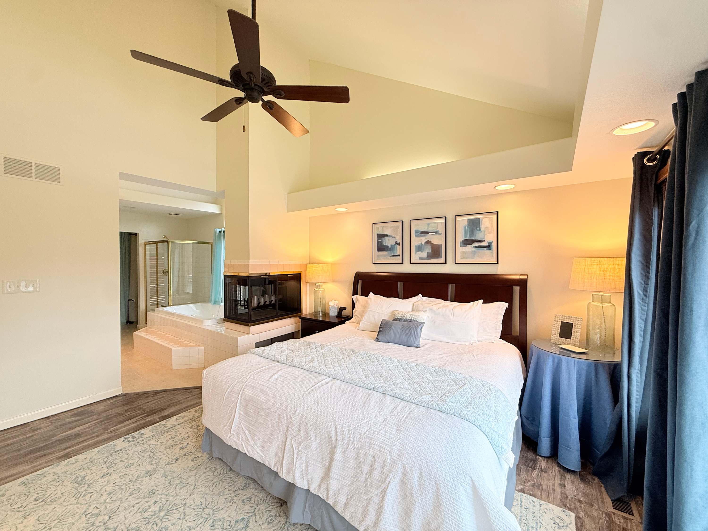 Bedroom #1 includes a king size bed, a smart TV, and an ensuite bathroom with a dual vanity, a jetted tub, and a walk-in shower.