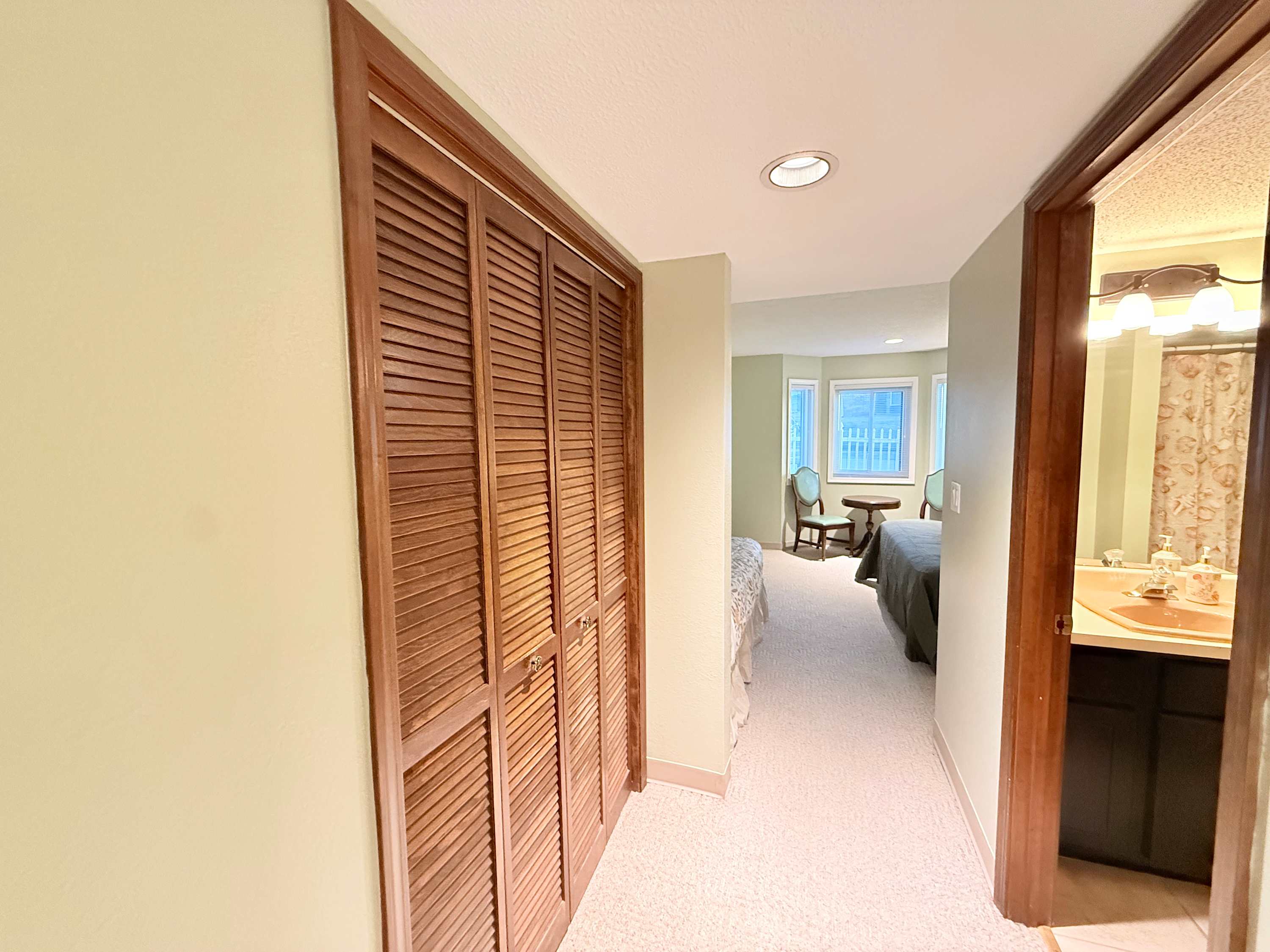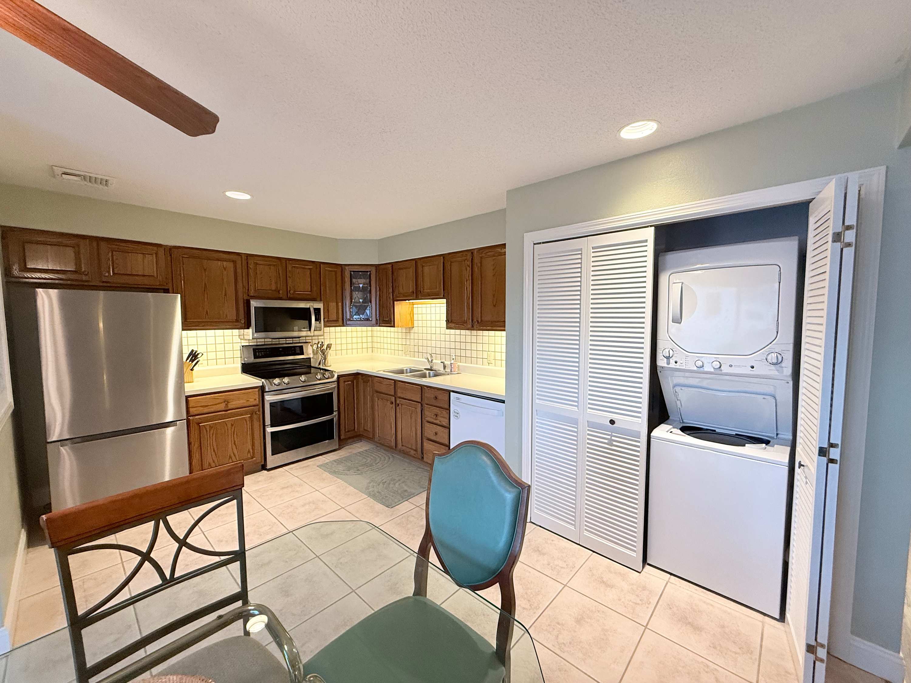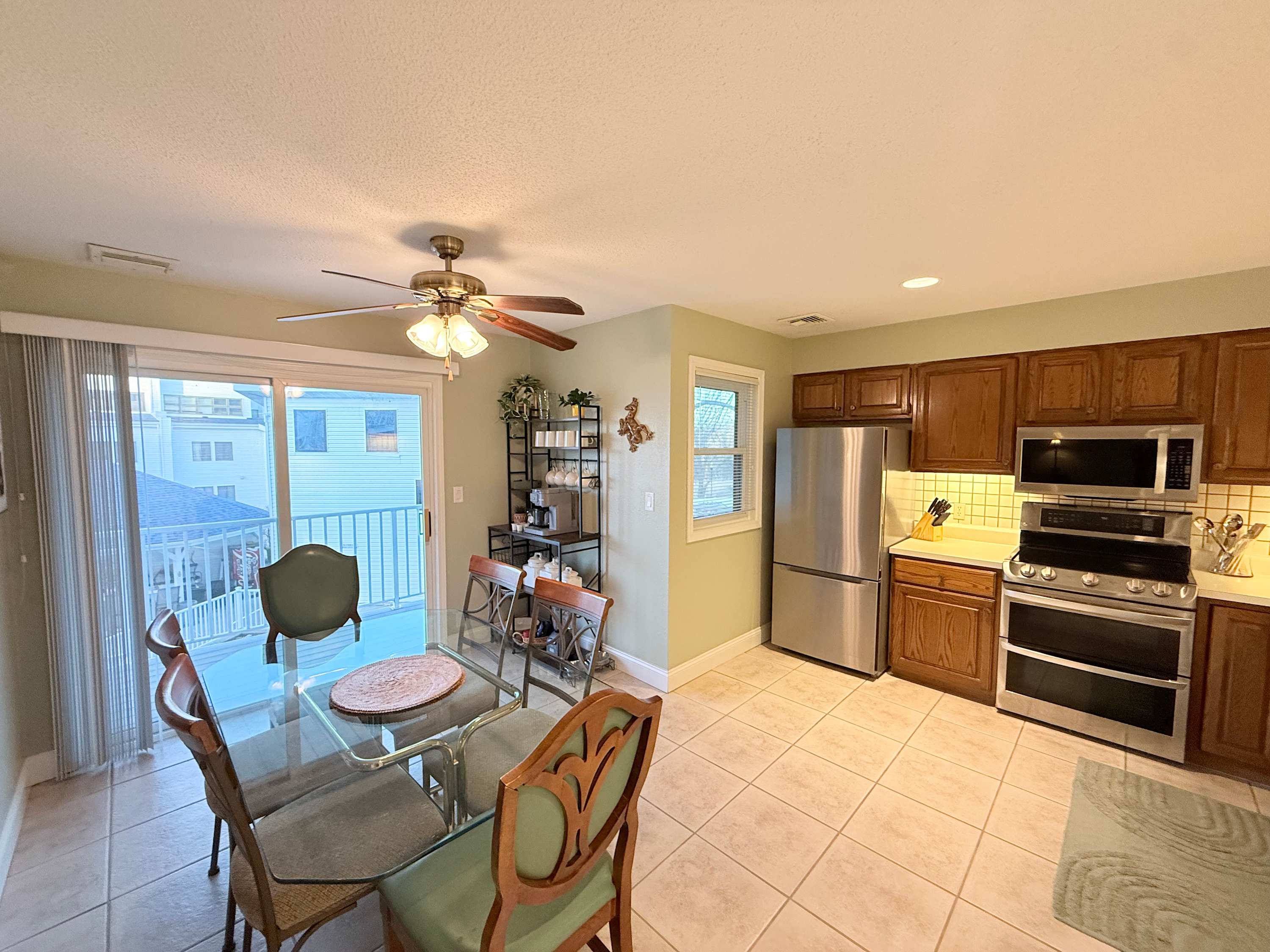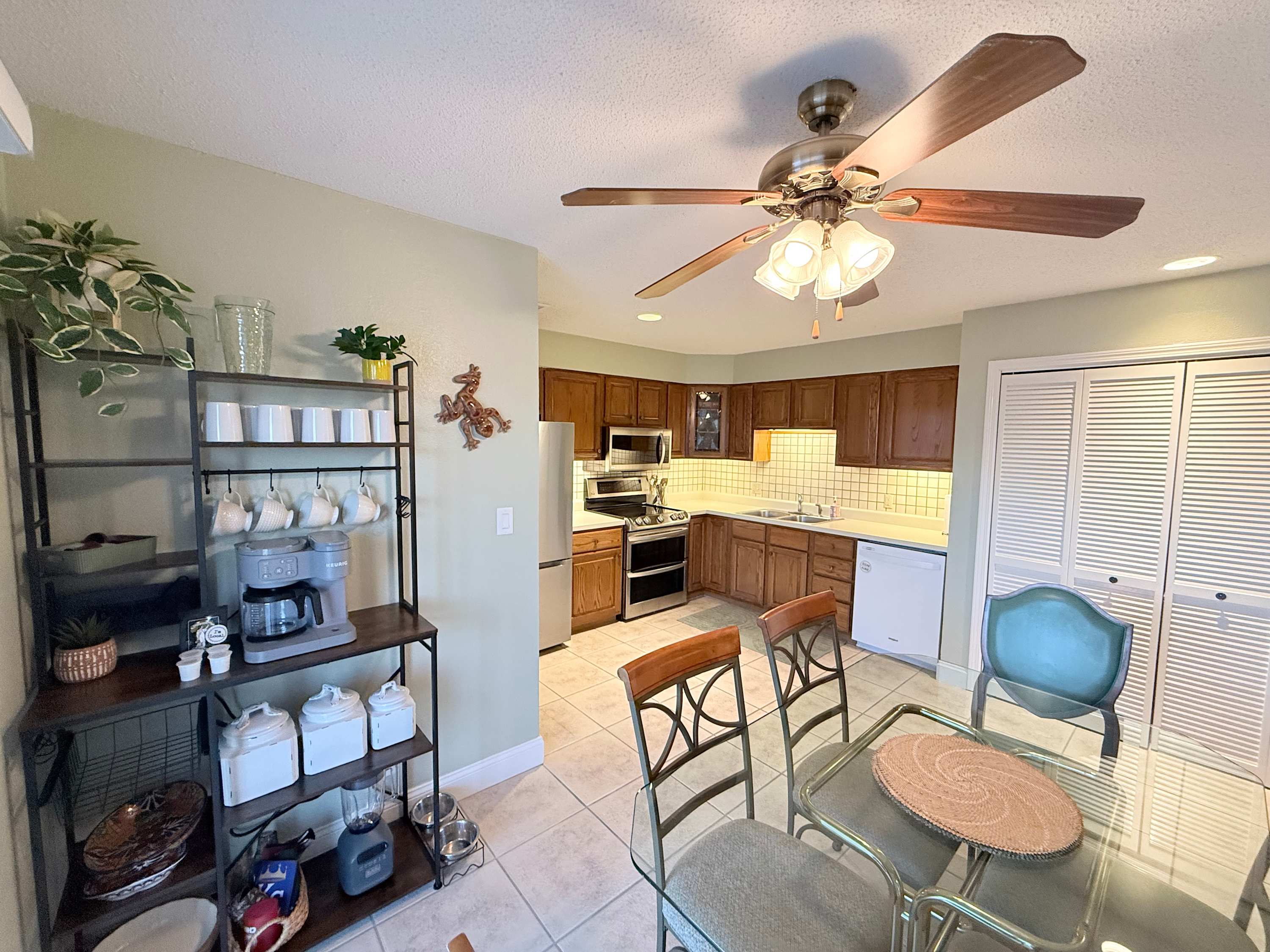Step inside to a welcoming living room designed for downtime and togetherness. Settle into the comfortable couch, loveseat, or recliner for movie nights on the smart TV, or challenge each other to board games after a full day out. The open kitchen keeps everyone connected and is thoughtfully equipped with a coffee station featuring a Keurig 2-in-1 for both pods and full pots. A dining table for six anchors the space, making shared meals, game nights, or trip planning easy and relaxed. Slide open the doors to the private balcony, where a table for four invites morning coffee or evening wind-downs with fresh air and peaceful surroundings.
