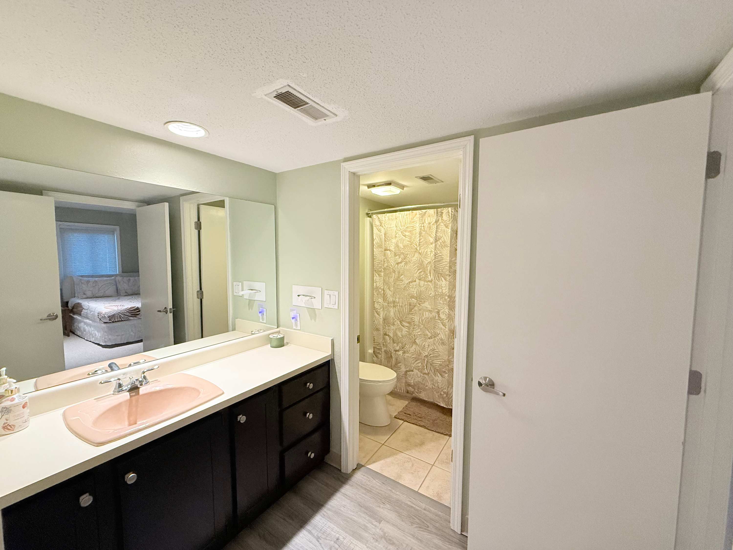 Bedroom #2 includes 2 queen size beds and a Jack-and-Jill bathroom with a single vanity and a shower/tub combo, also accessible via the hallway.