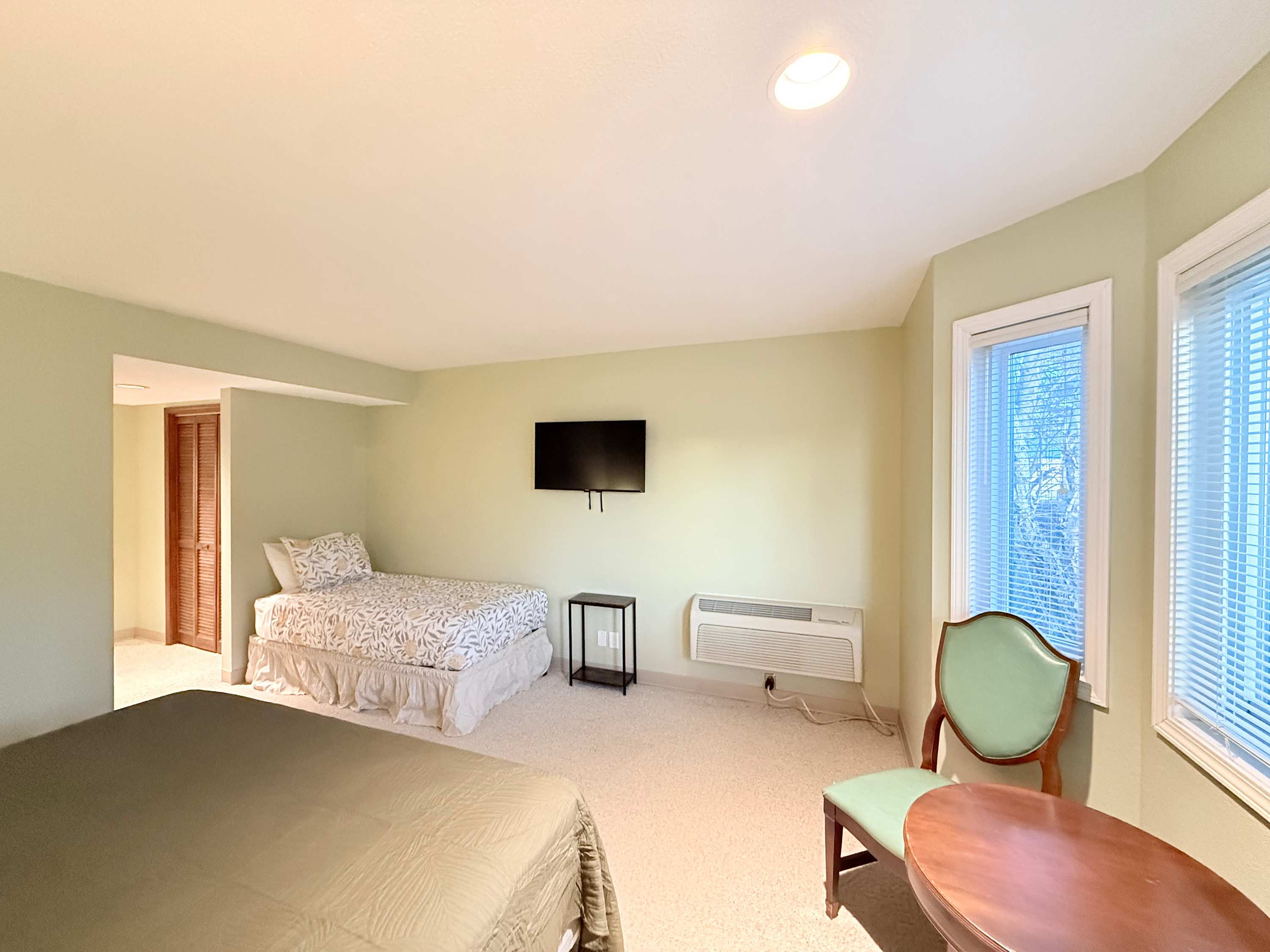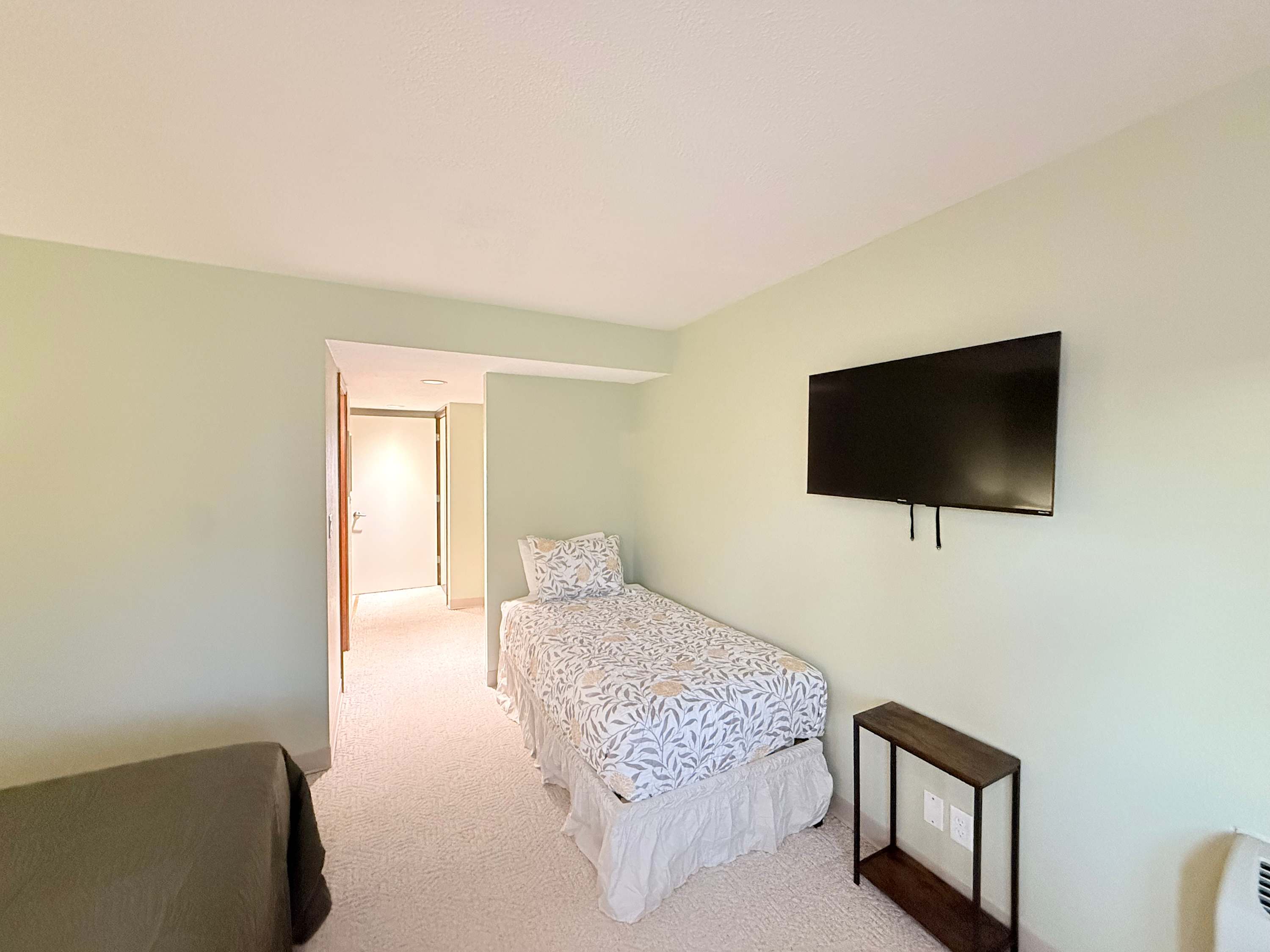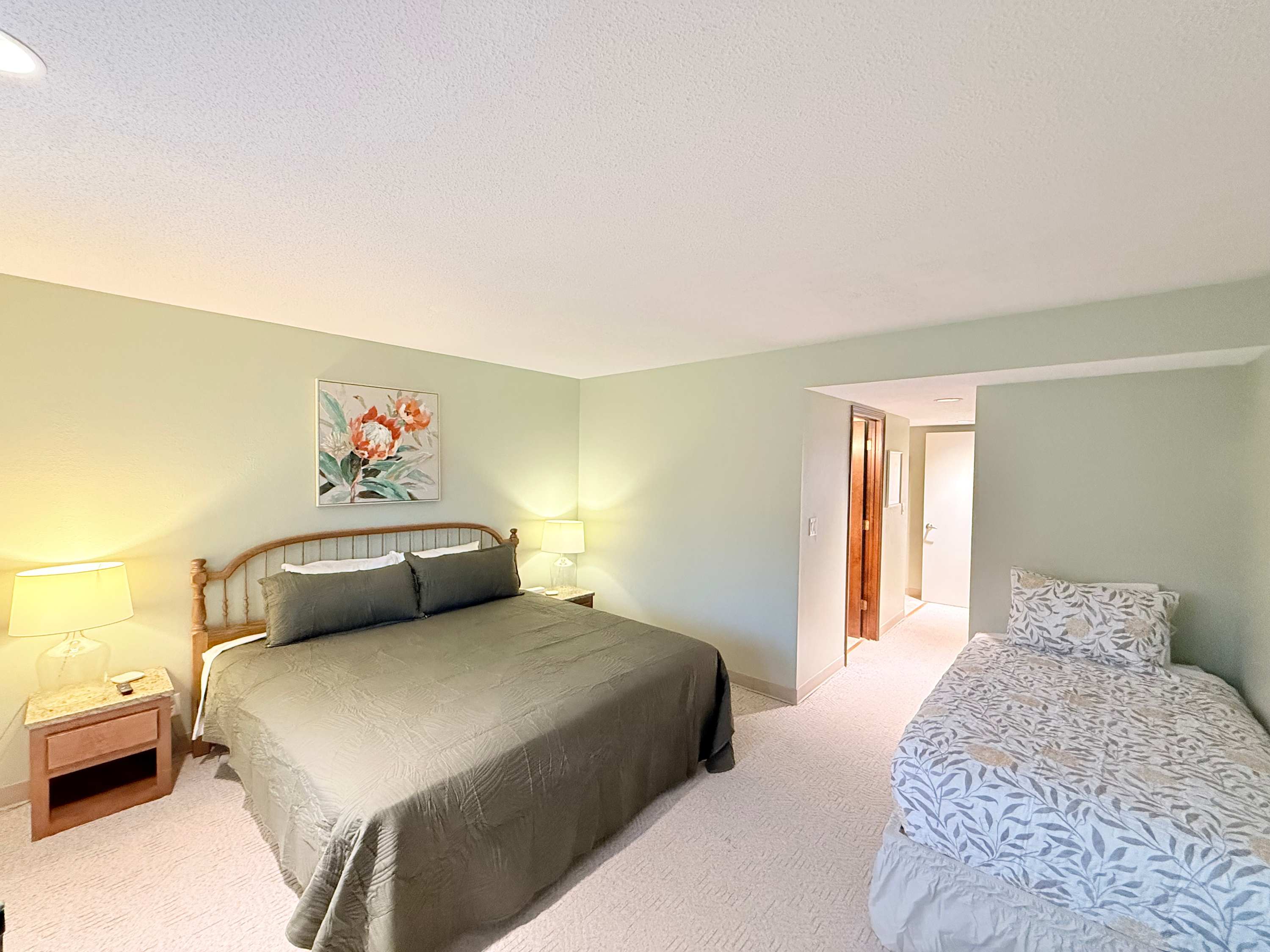 Bedroom #1 includes a king size bed, a twin size bed and a twin size rollaway bed, a smart TV, and an ensuite bathroom with a single vanity and a walk-in shower.