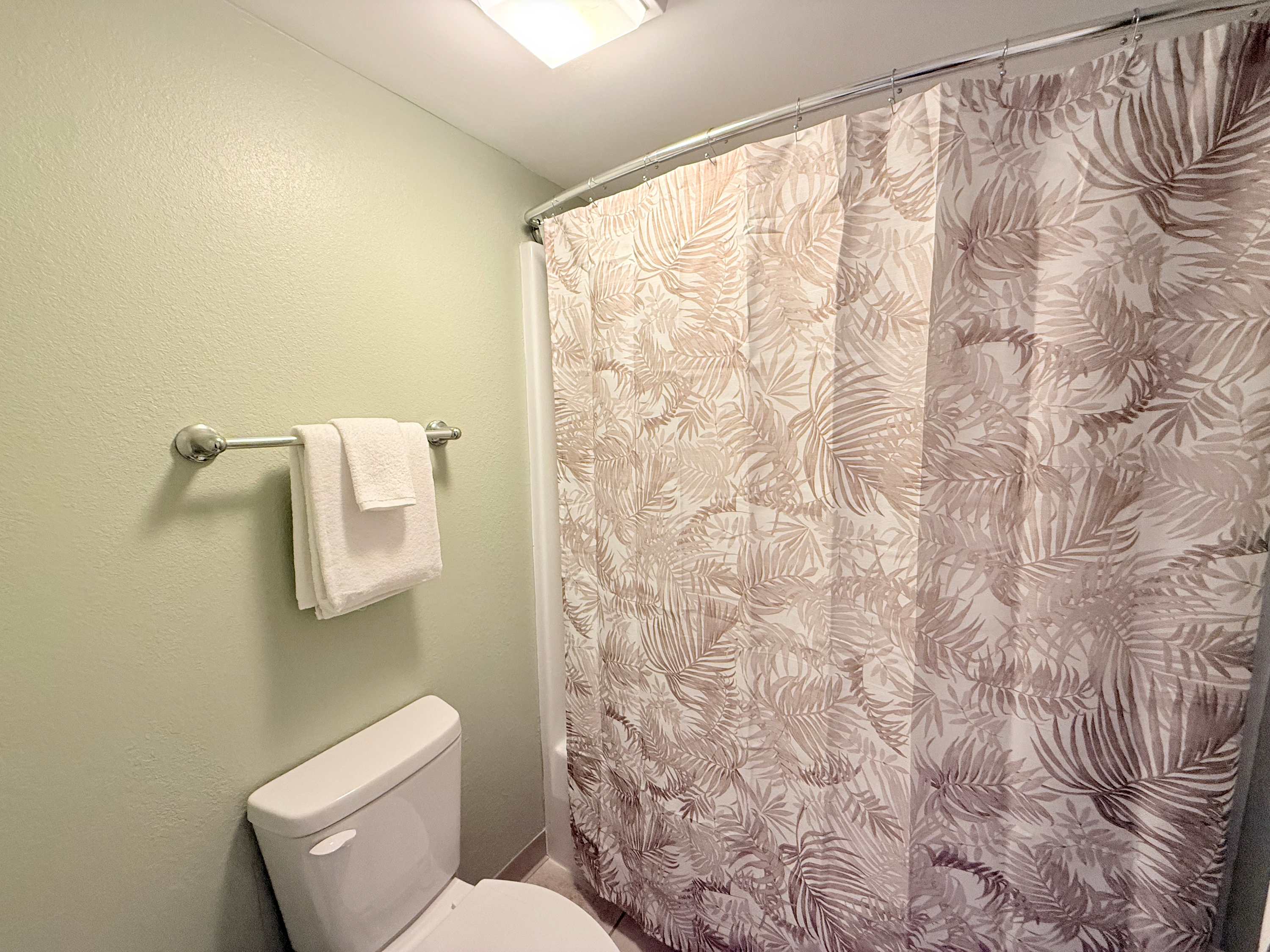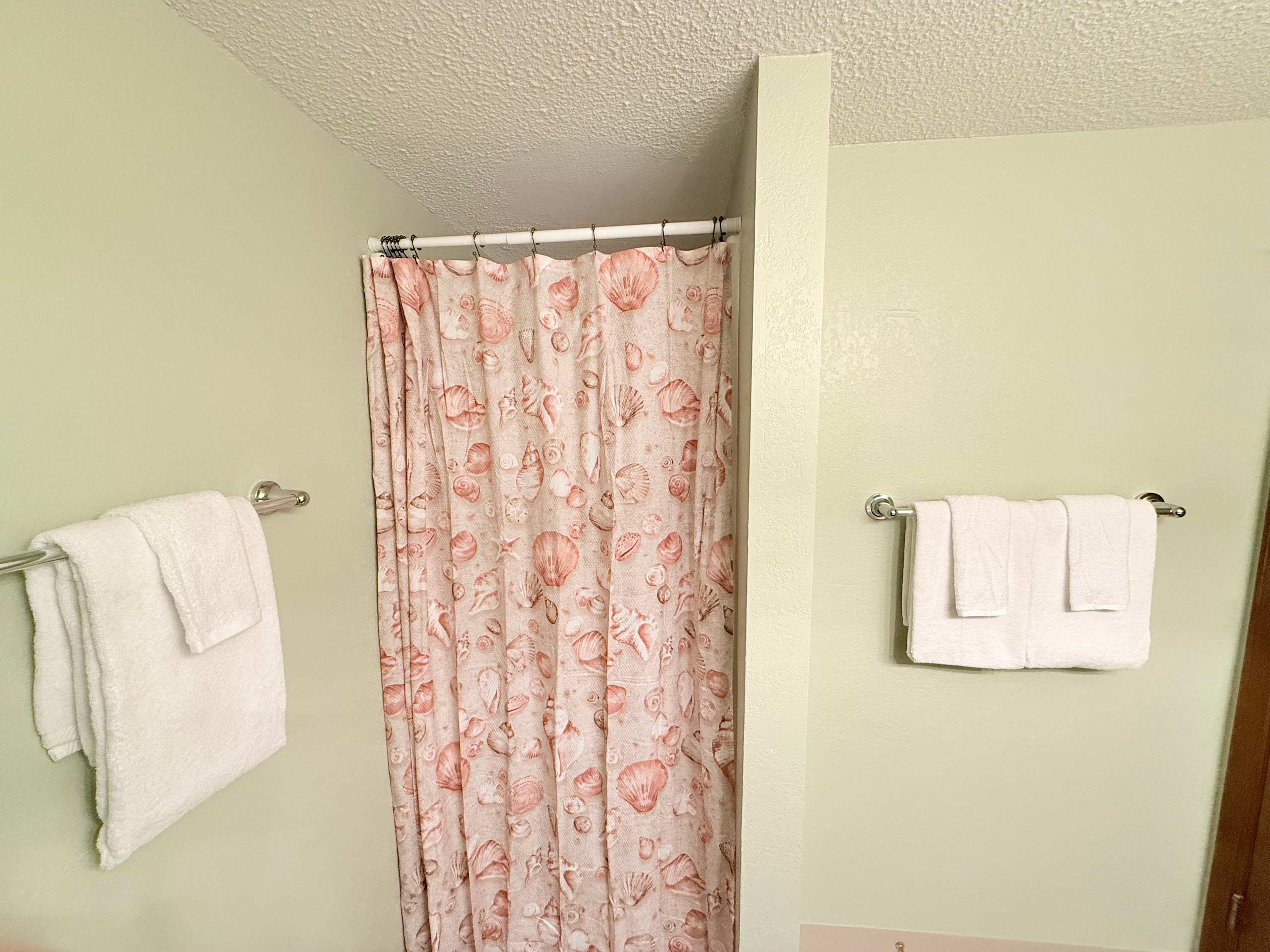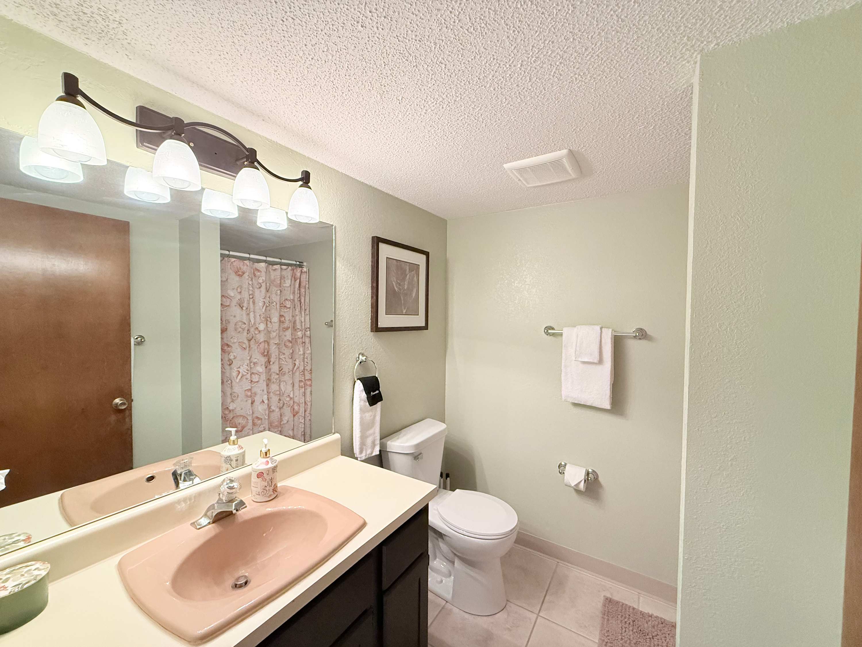Bedroom #1 includes a king size bed, a twin size bed and a twin size rollaway bed, a smart TV, and an ensuite bathroom with a single vanity and a walk-in shower.