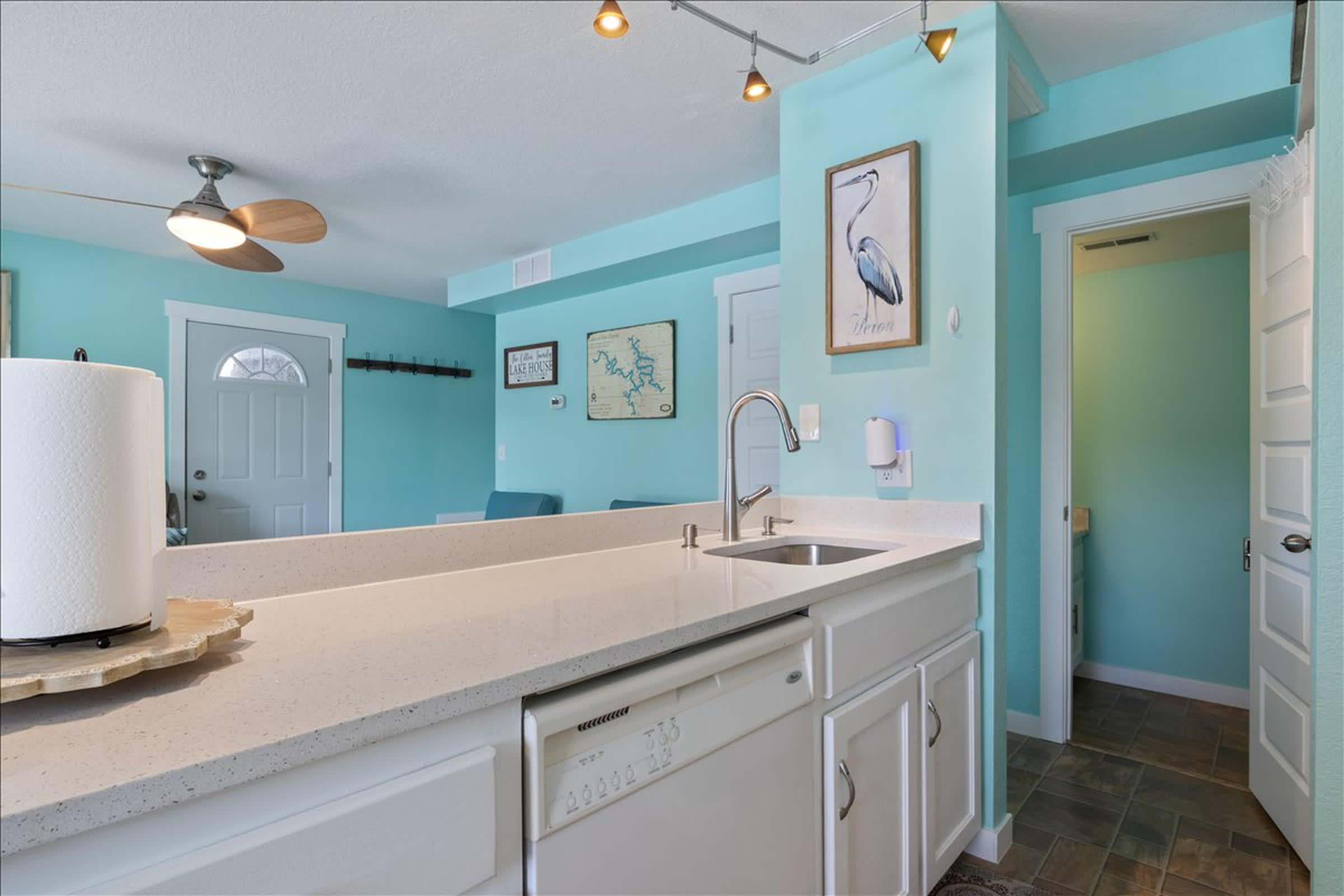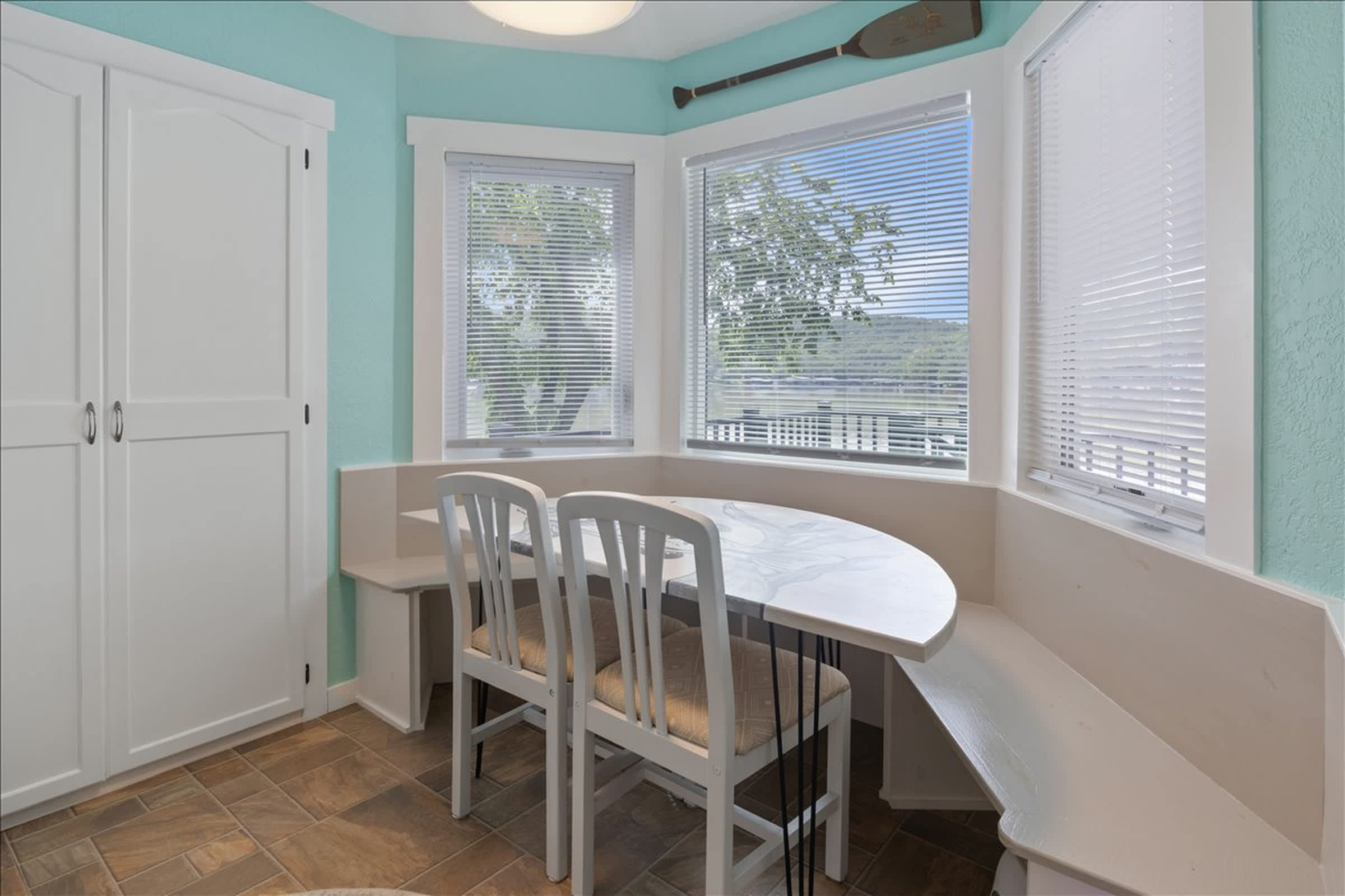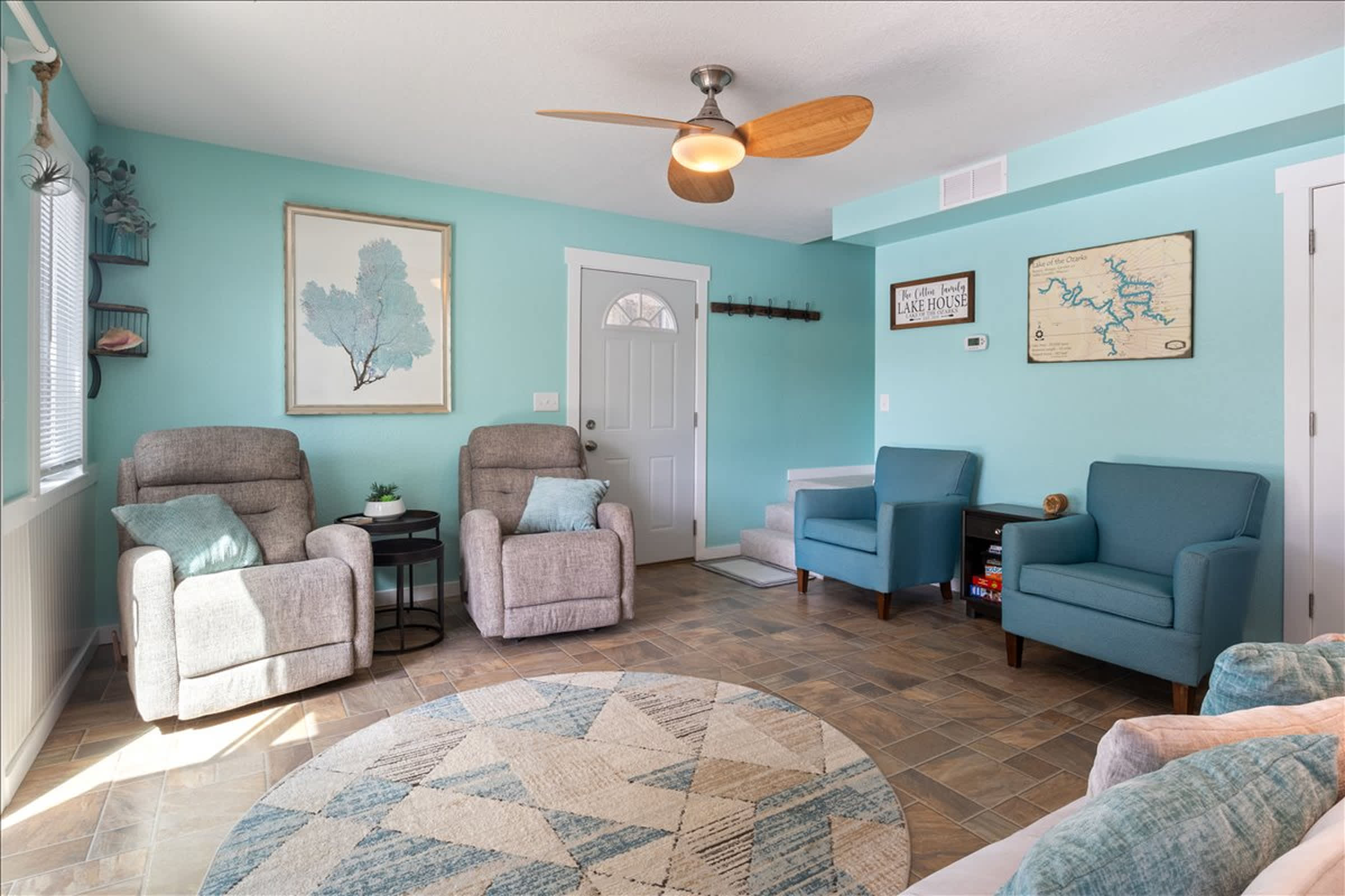 Inside, the home welcomes you with a cozy, open living space that feels instantly comfortable. The living room is perfect for winding down after a day outside, with a plush couch, multiple armchairs for everyone to spread out, and a collection of board games that make evenings easy and fun. The kitchen is fully stocked with all the essentials, making it simple to whip up breakfast before hitting the lake or prepare dinner to enjoy together. Just nearby, the dining table and nook comfortably seat six—ideal for shared meals, card games, or planning the next day’s adventures. Lakeside Serenity is the kind of place where time slows, memories linger, and every moment feels like a true lake getaway.