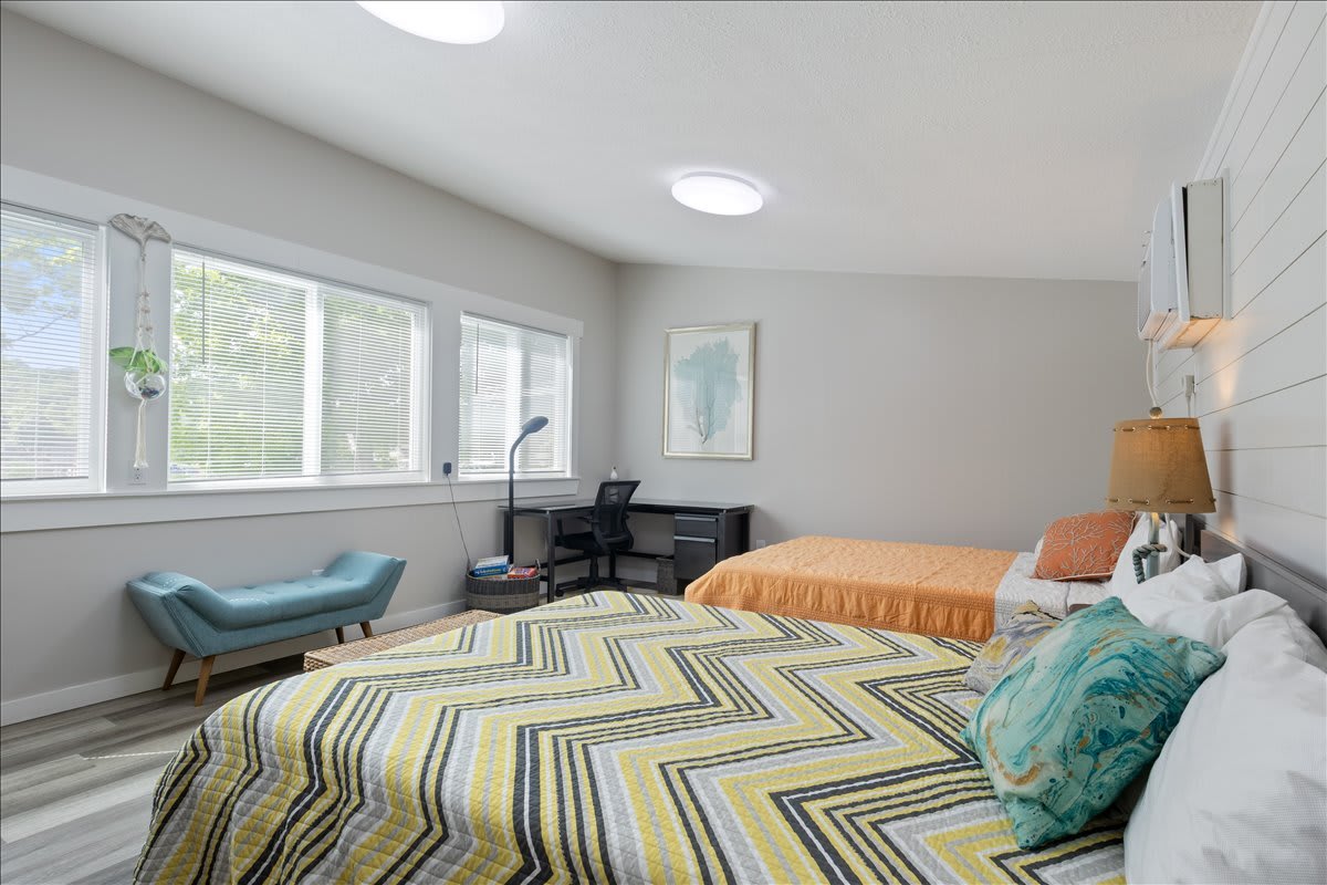 Bedroom #3 is located in a separate cabin and includes 2 queen size beds, a desk, and a smart TV.