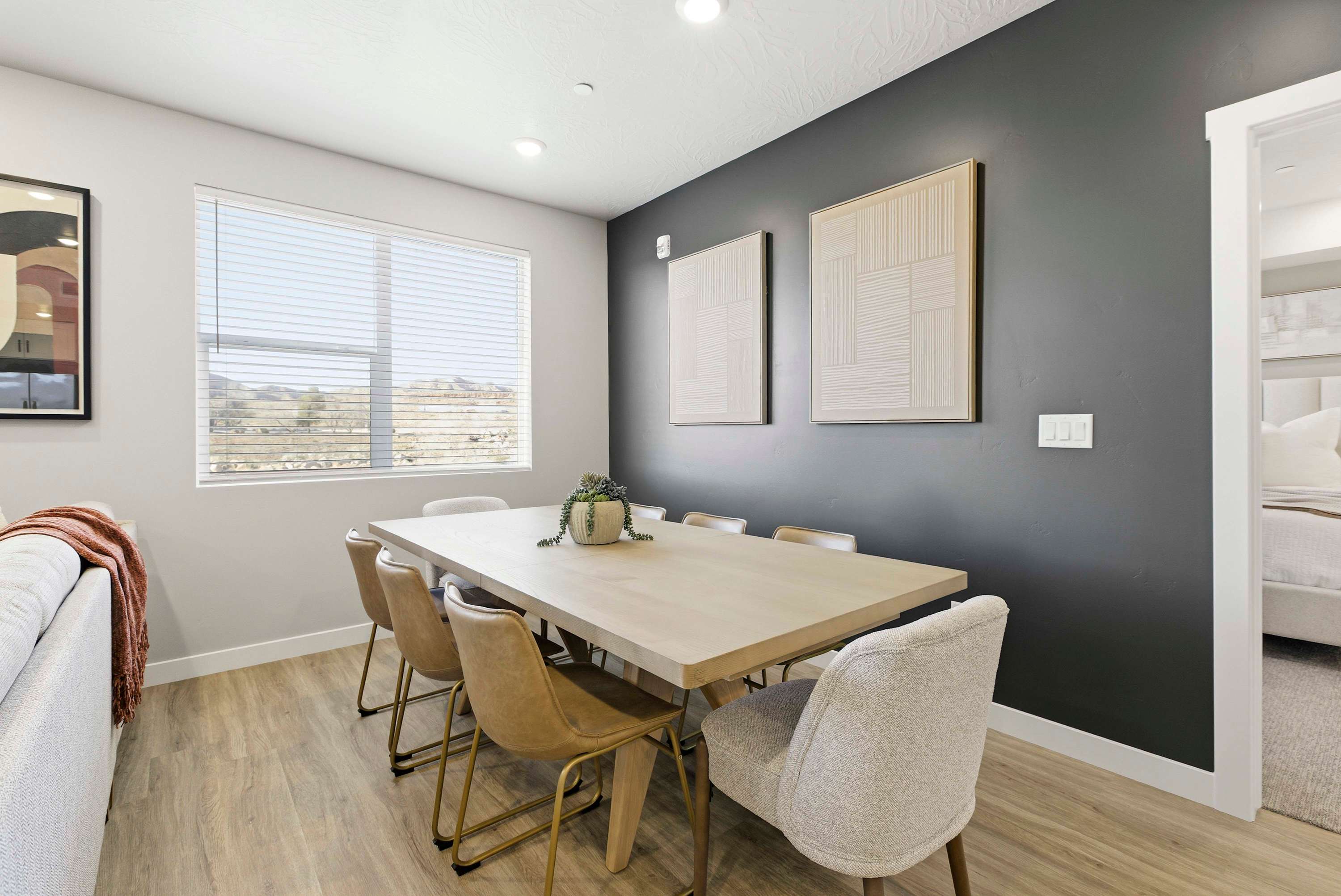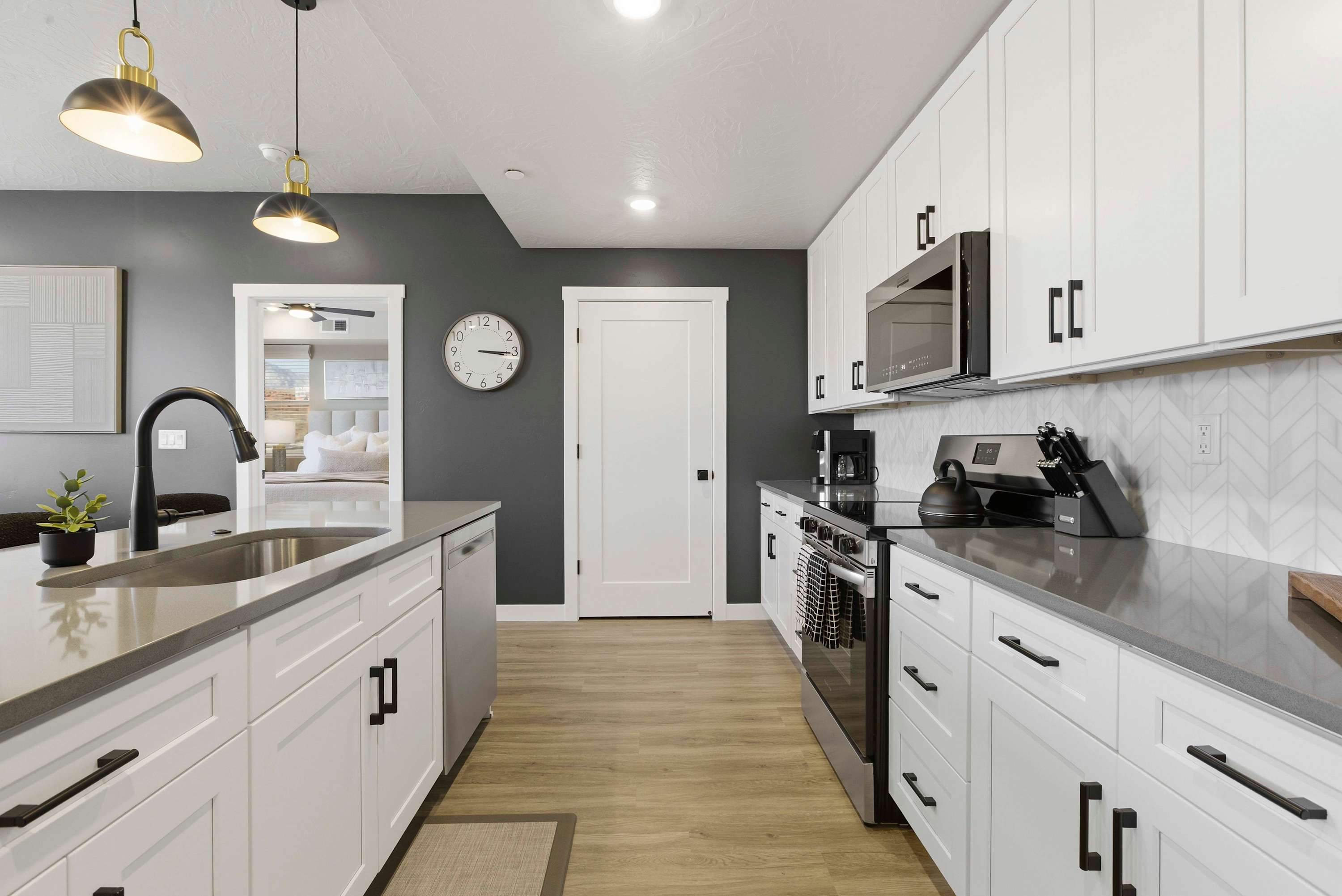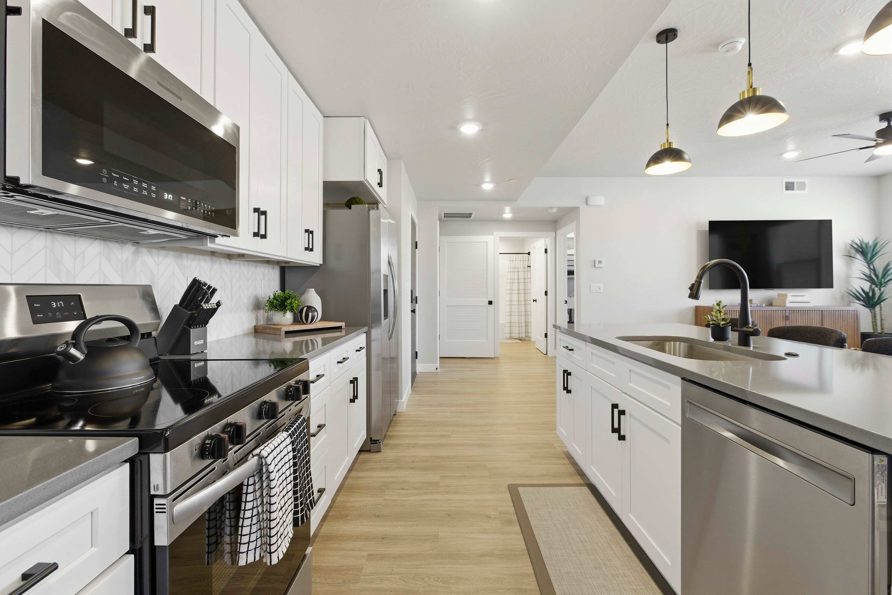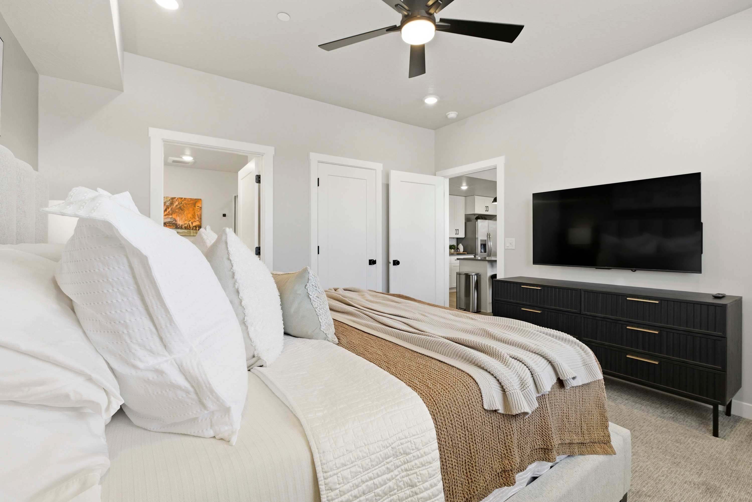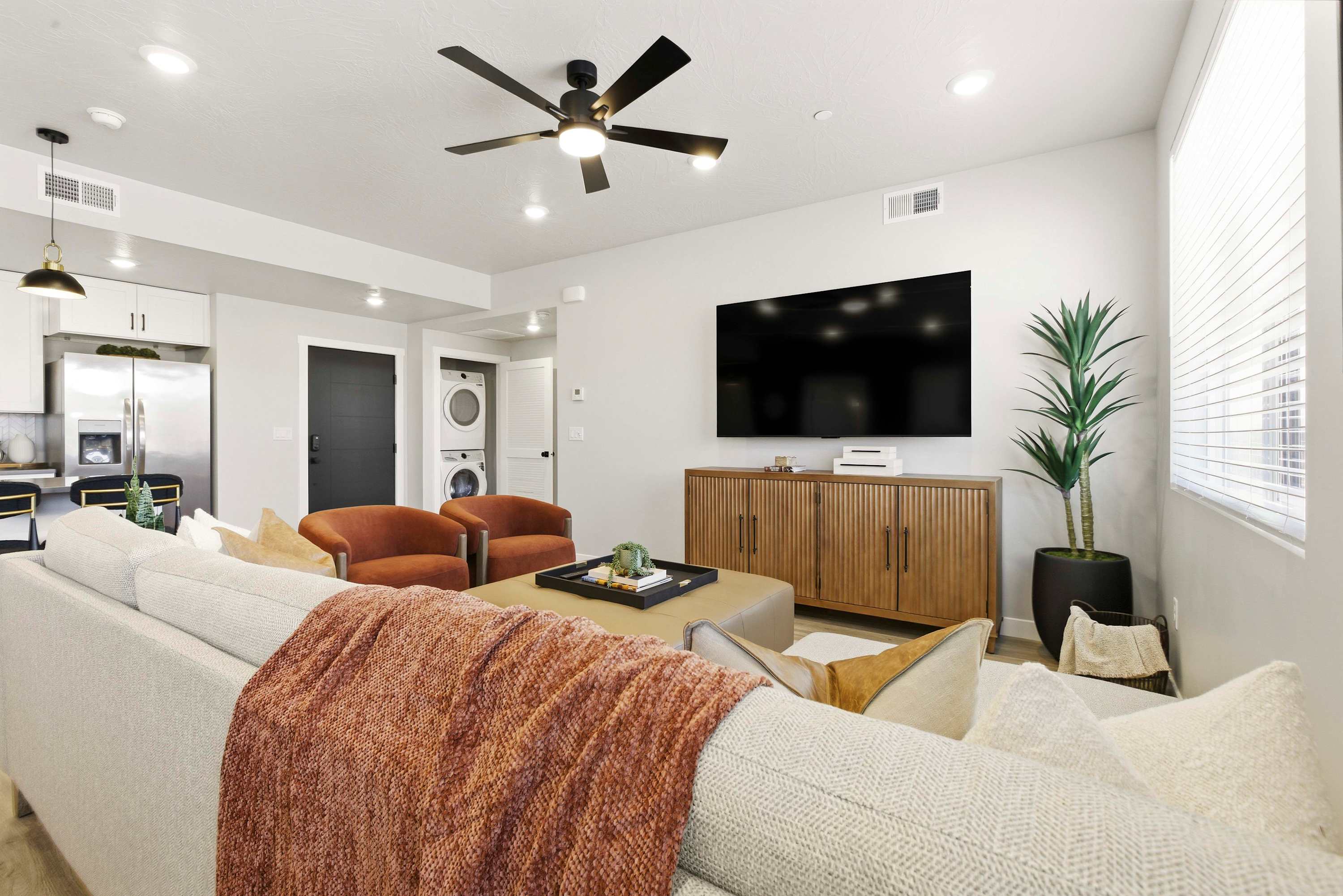 Step inside Sand Yeti and you’re welcomed into a bright, open kitchen-living space designed for comfort and connection. The living room invites you to kick back on the couch or armchairs and stream your favorite shows on the smart TV after a full day of resort fun. The modern kitchen is both stylish and functional, featuring stainless steel appliances, a Keurig and drip coffee maker for easy mornings, and counter seating for four that’s perfect for quick breakfasts or evening snacks. Just beyond, the spacious dining table for eight sets the stage for shared meals, game nights, and memorable conversations. When it’s time to rest, the bedrooms offer room-darkening shades, ensuring peaceful sleep so you’re refreshed and ready for another day of adventure.