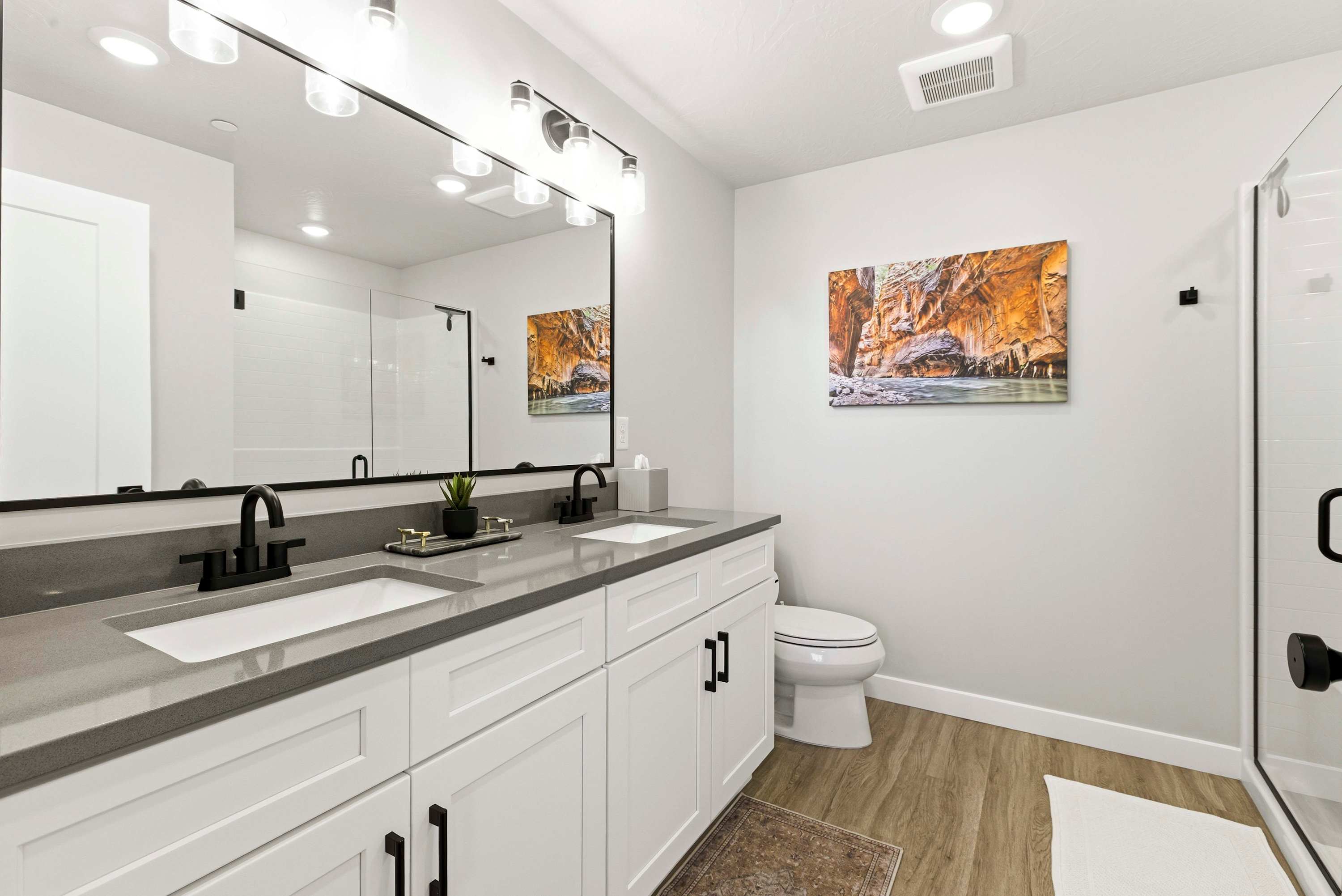 Bedroom #1 includes a king size bed, a smart TV, and an ensuite bathroom with a dual vanity and a walk-in shower.