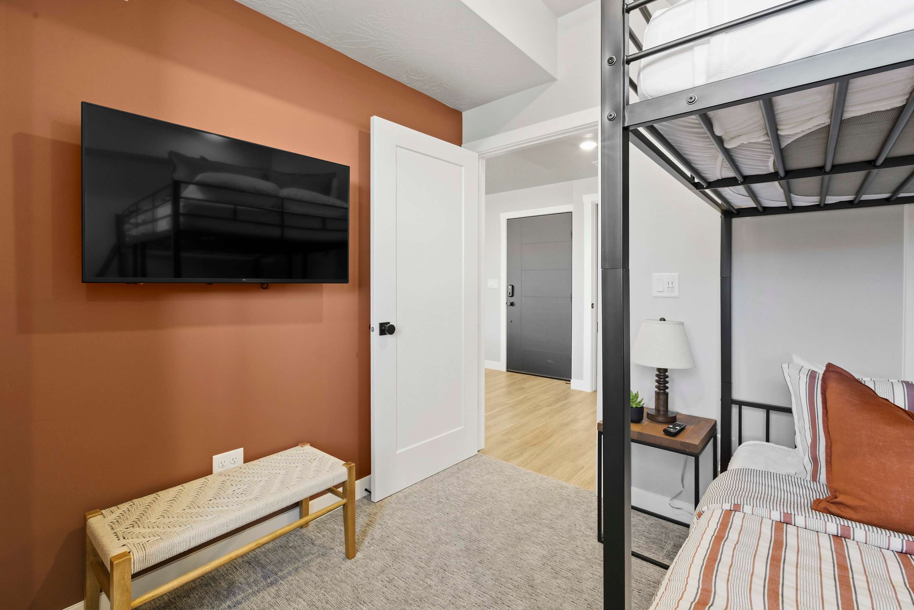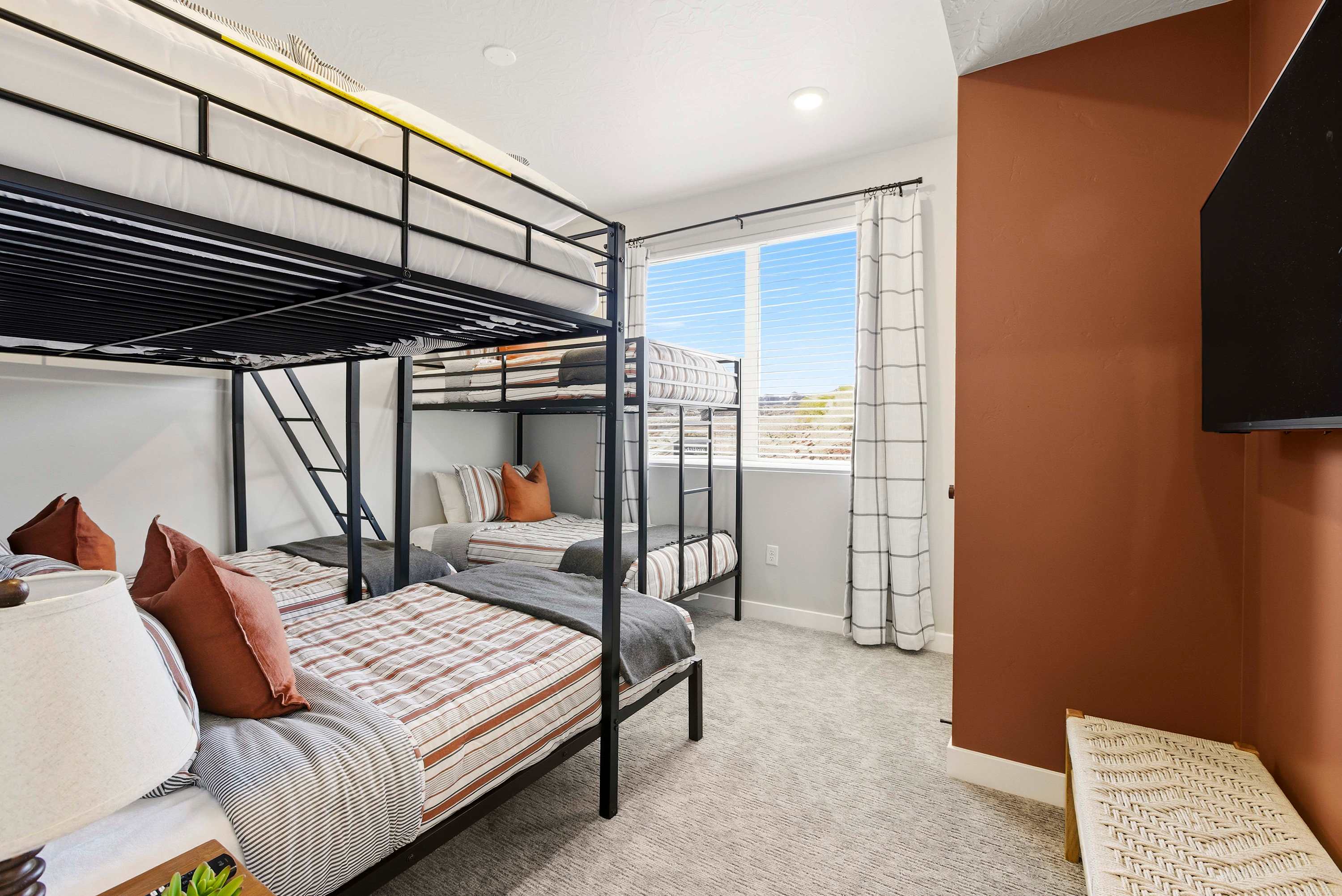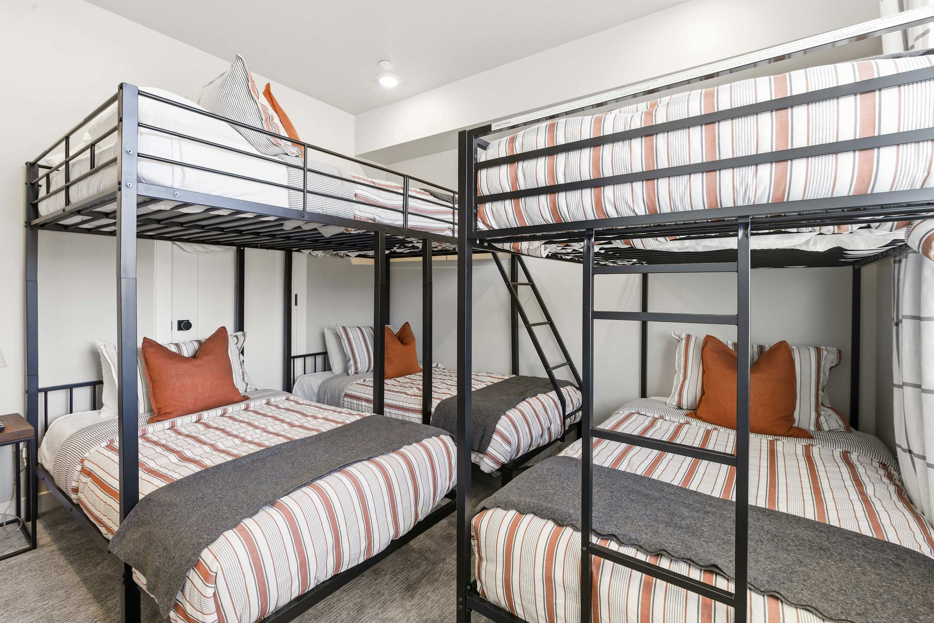 Bedroom #2 includes a set of twin-over twin bunk beds, another set of bunk beds is a queen-over-2 twin size beds, and a smart TV.
