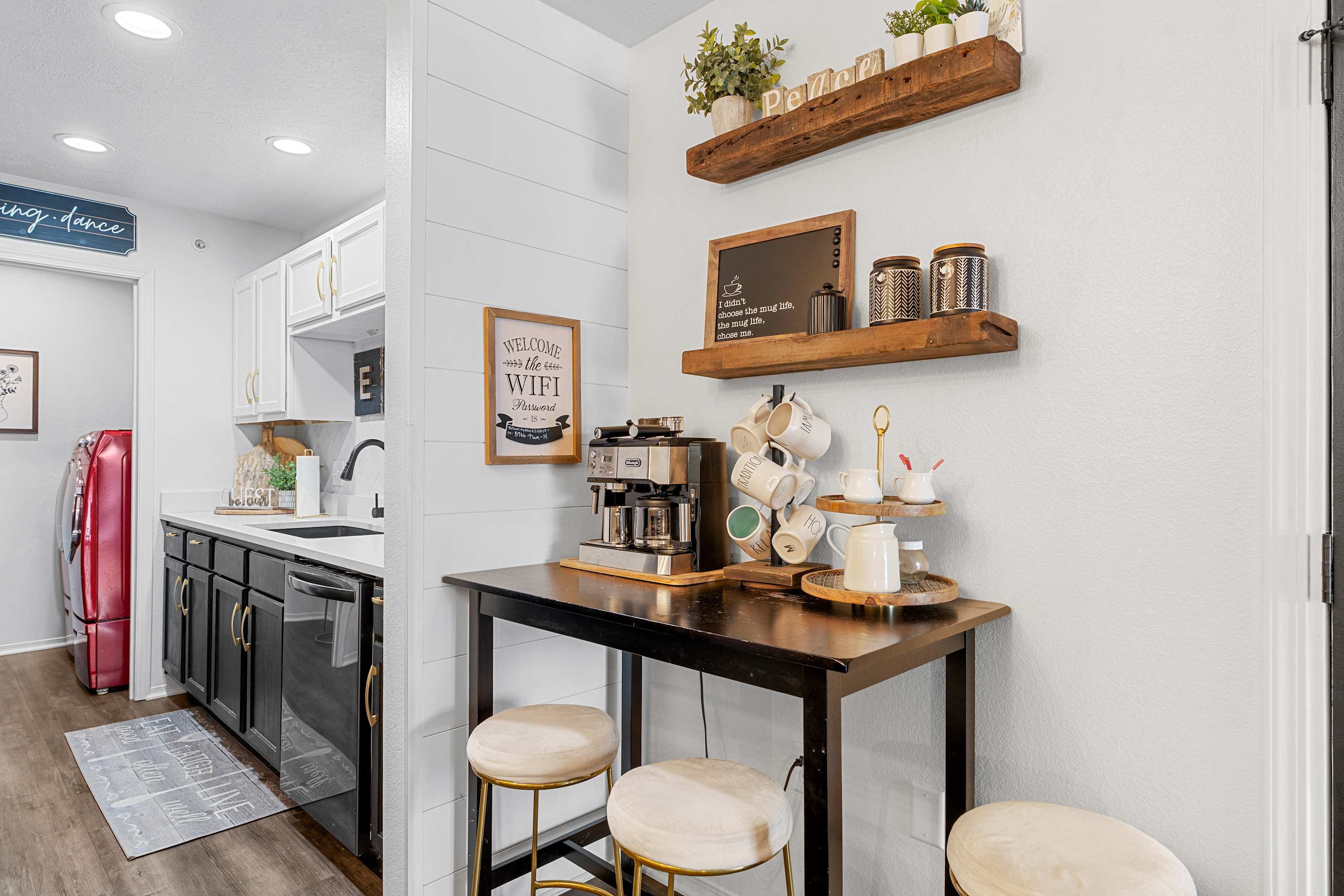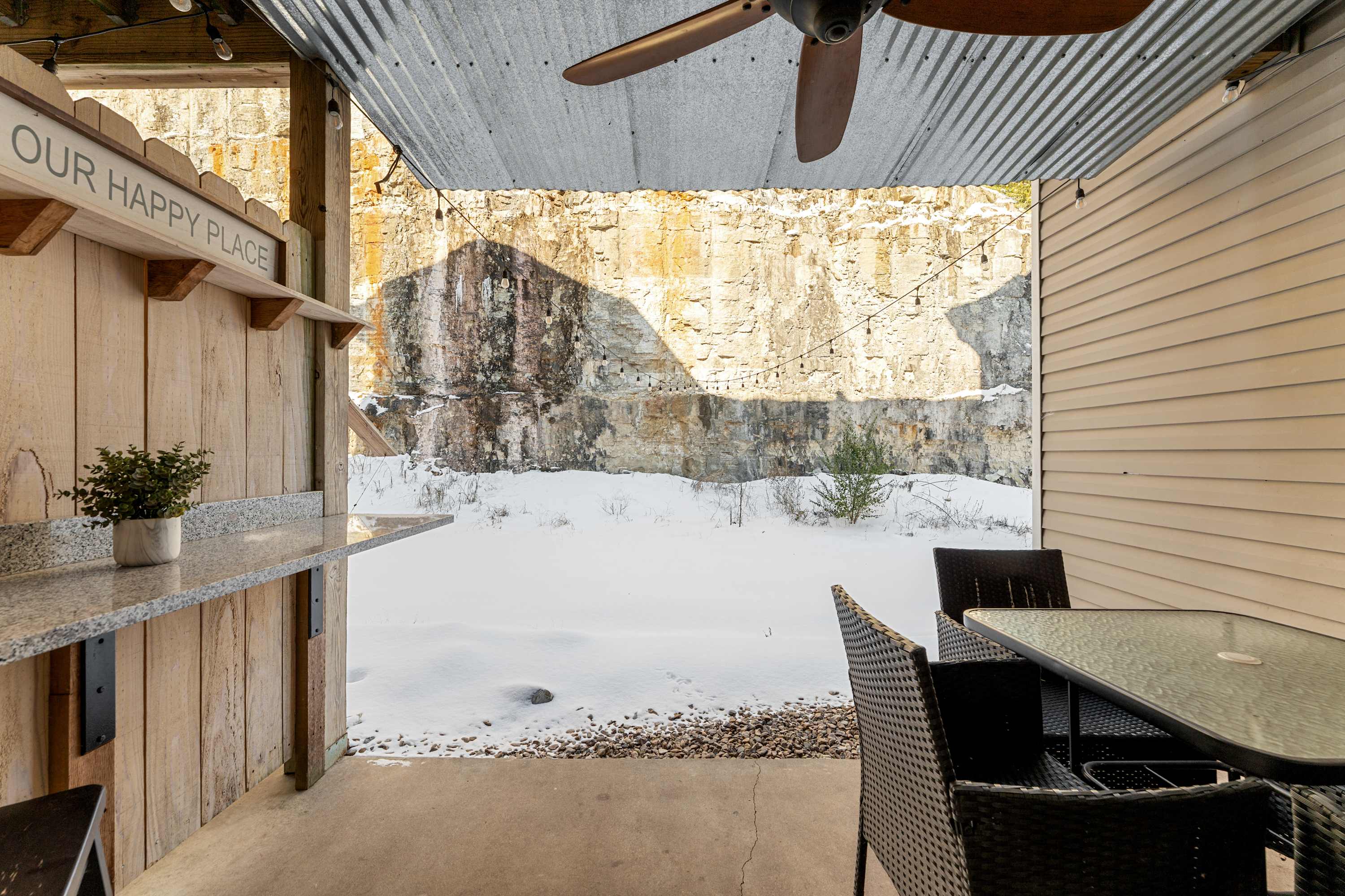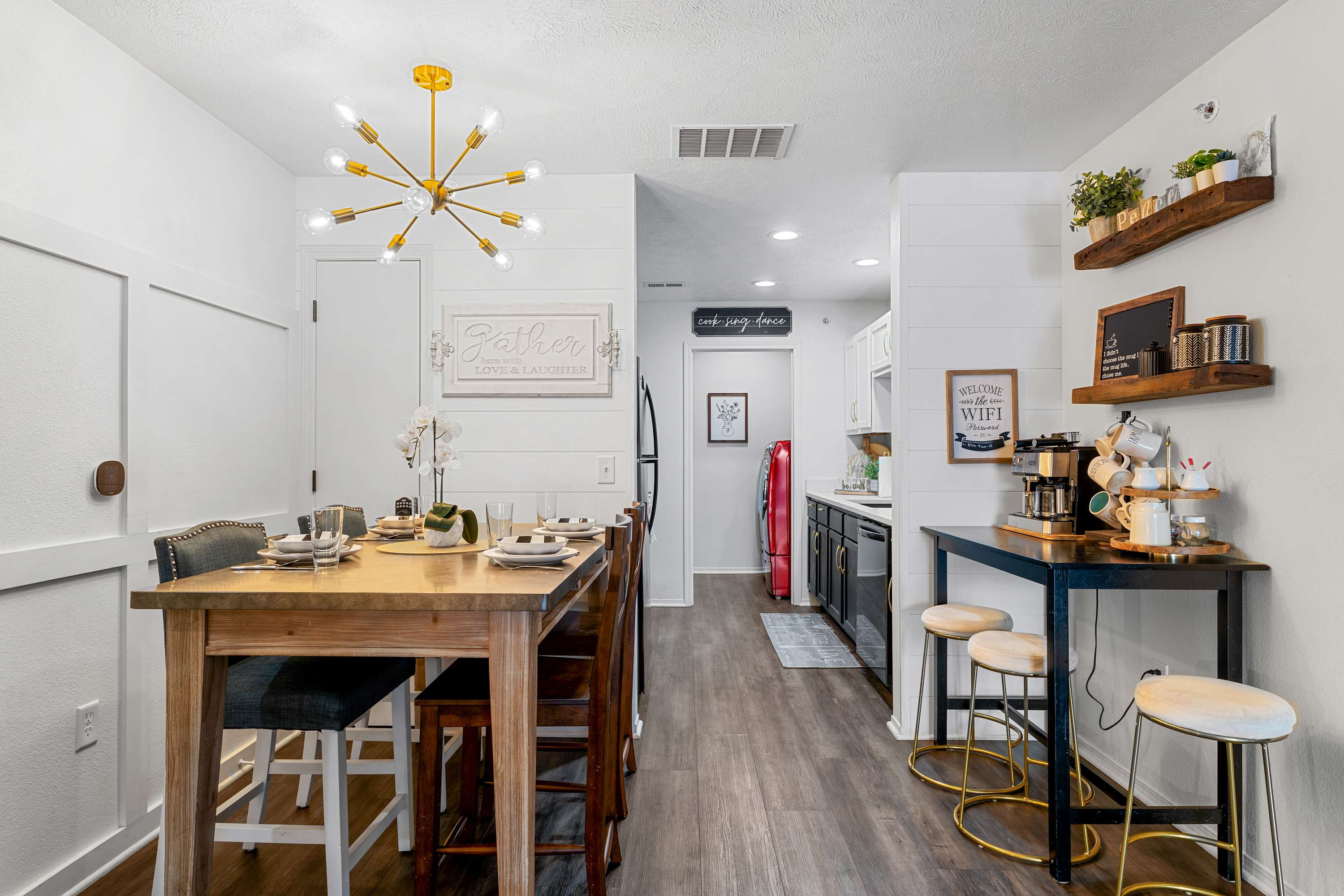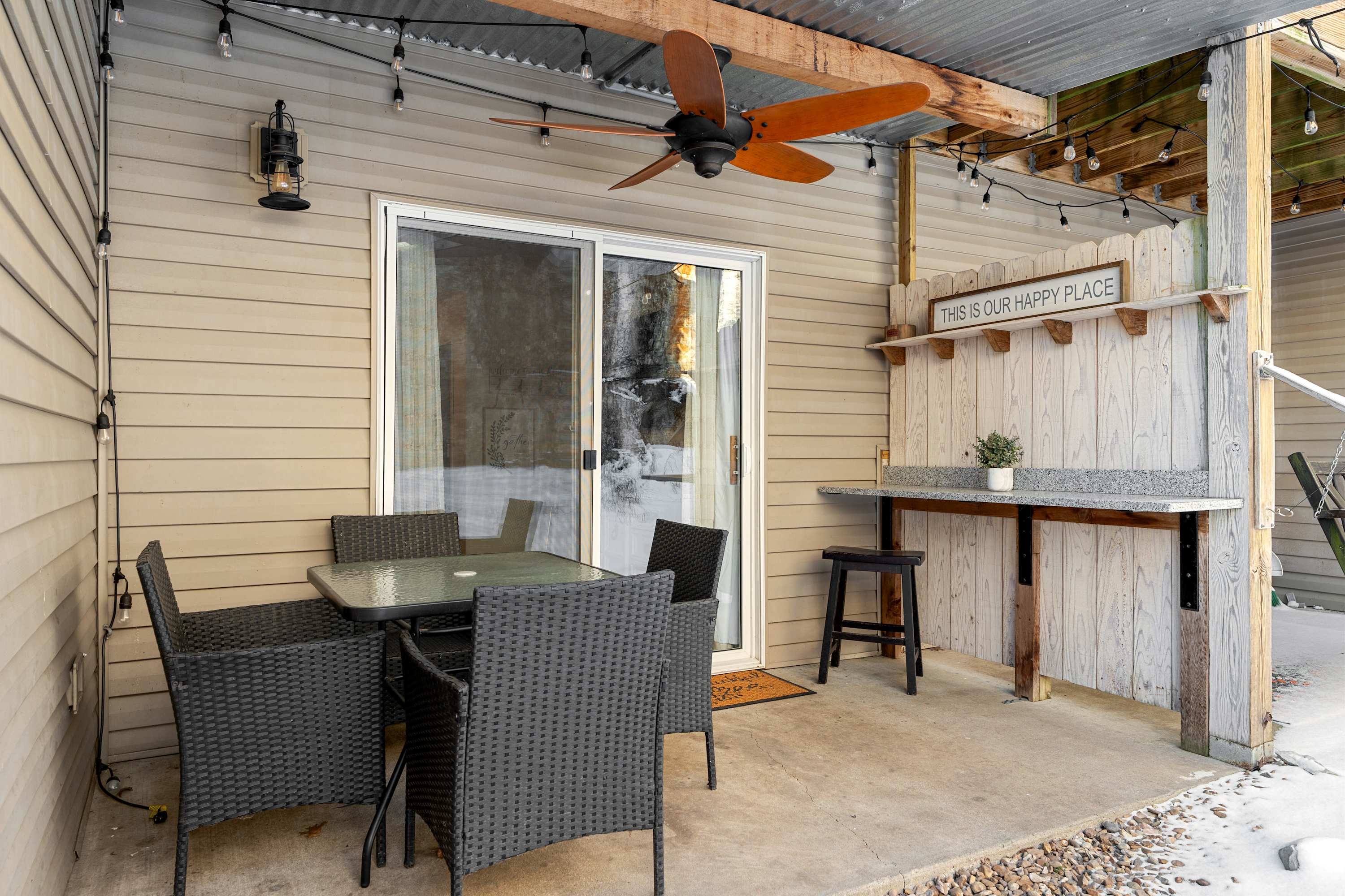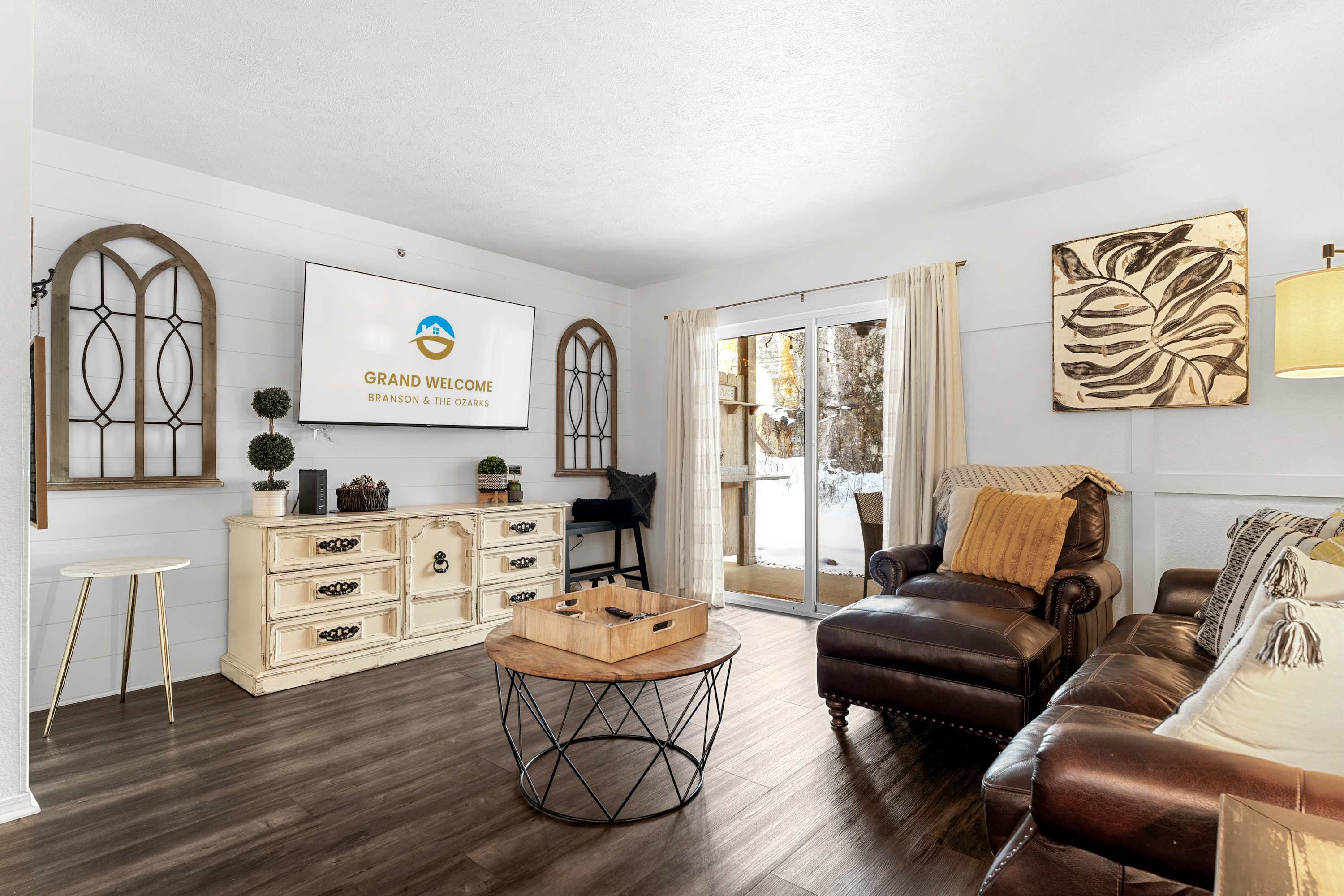 Step inside and you’re welcomed by a space where modern chic meets warm, inviting charm. Natural light flows into the living room, where a plush couch and a cozy armchair with ottoman invite you to kick back in front of the smart TV after a day of exploring. The kitchen feels fresh and stylish with white countertops and a charming coffee bar featuring counter seating for two—perfect for slow mornings or evening wine chats. Just beyond, the dining table comfortably seats four, ideal for shared meals or planning the next day’s Branson adventures. Outside, your private covered patio becomes an extension of the living space, with a table for four where you can enjoy al fresco meals, morning coffee, or quiet evenings surrounded by peaceful hillside views.