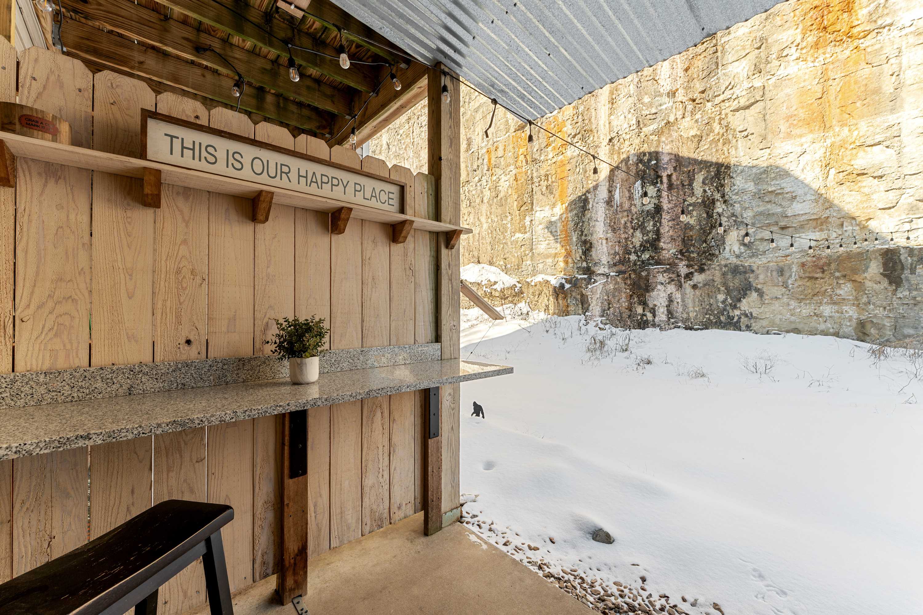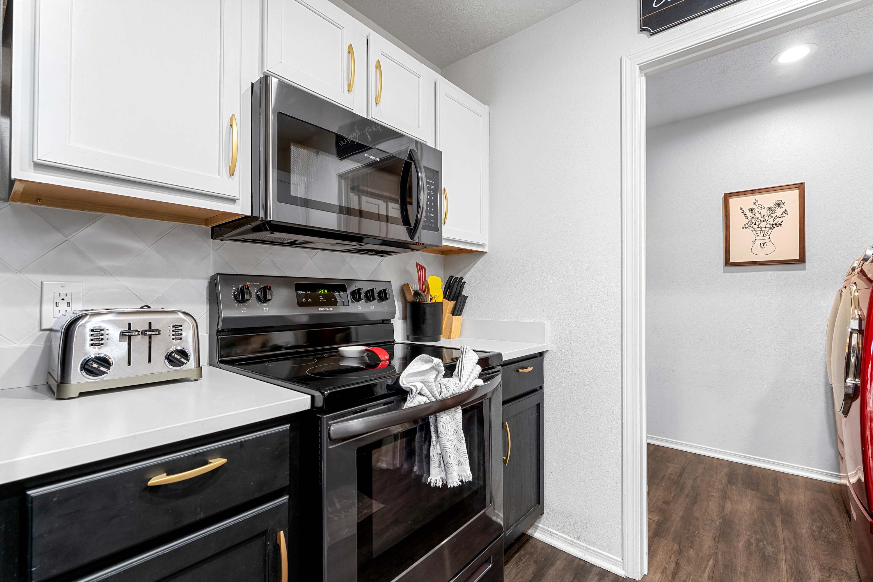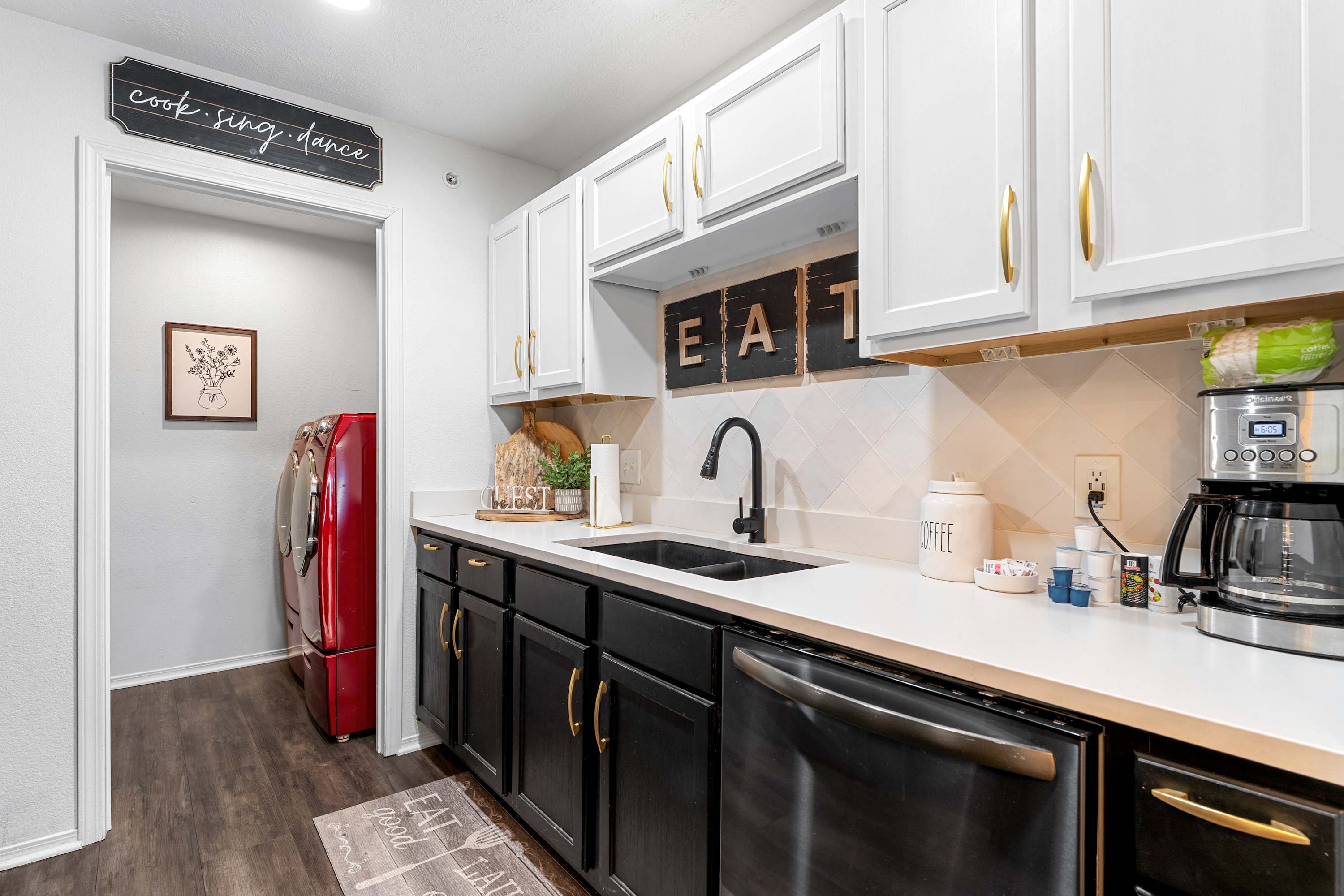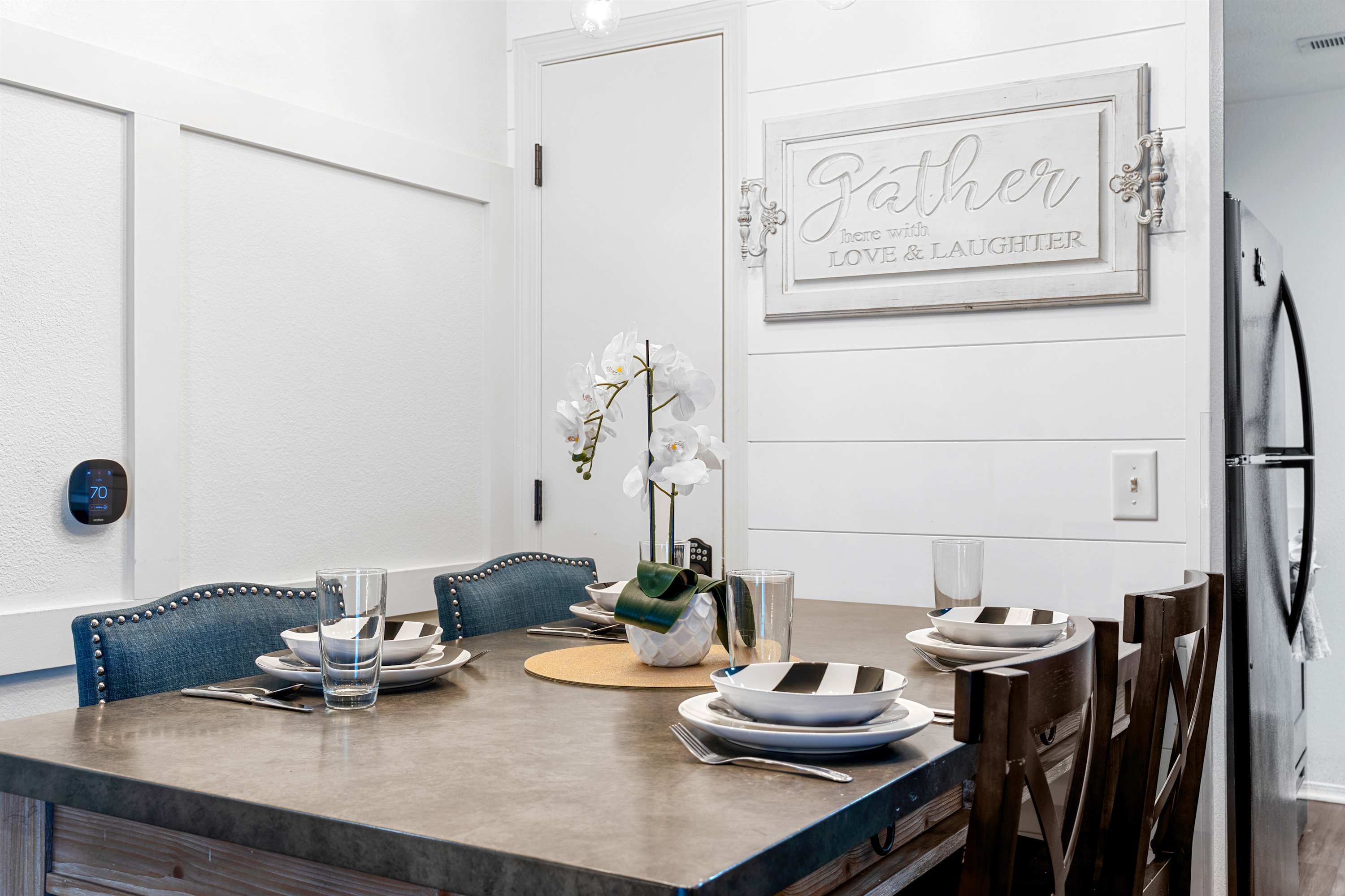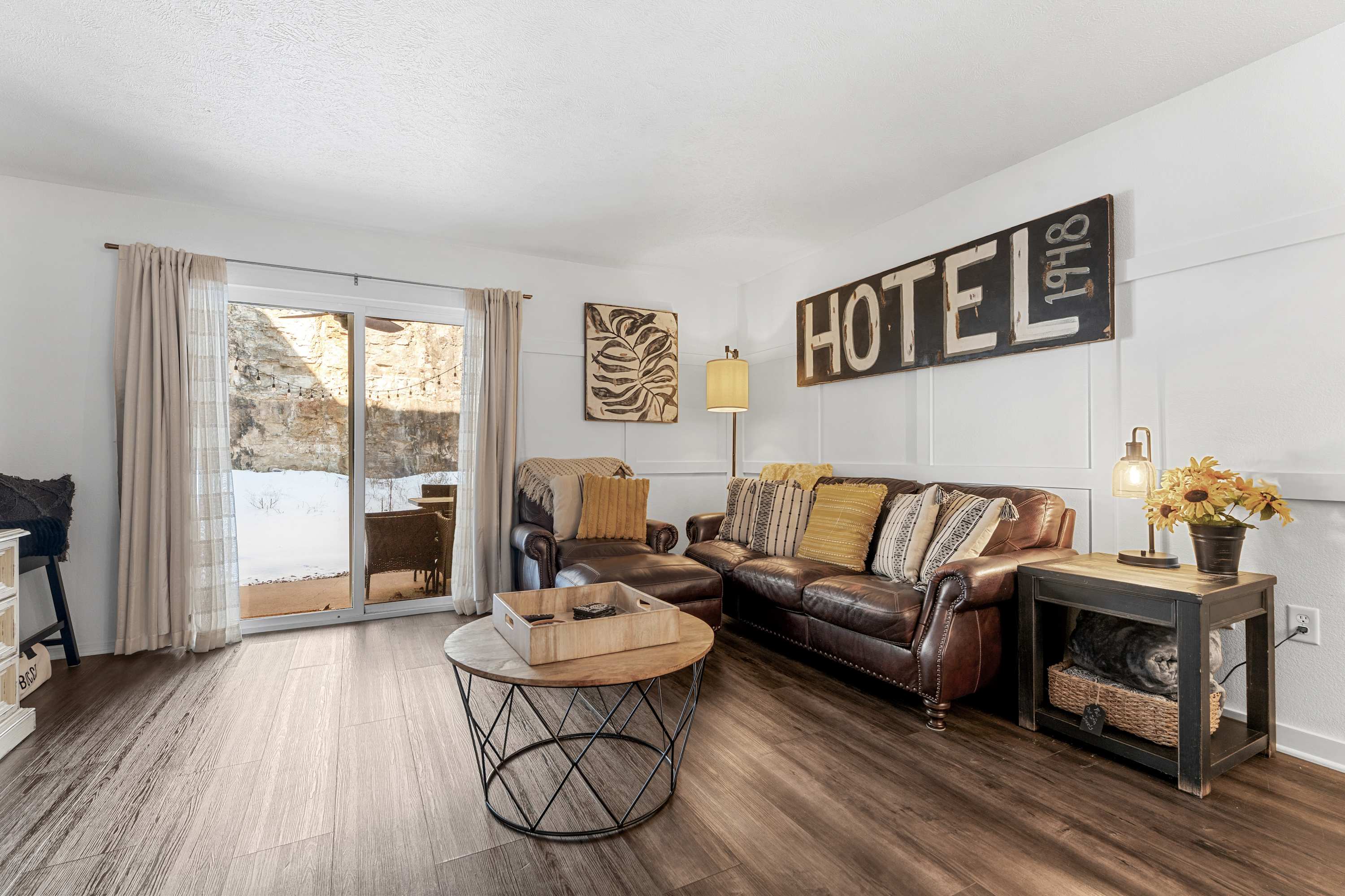 Step inside and you’re welcomed by a space where modern chic meets warm, inviting charm. Natural light flows into the living room, where a plush couch and a cozy armchair with ottoman invite you to kick back in front of the smart TV after a day of exploring. The kitchen feels fresh and stylish with white countertops and a charming coffee bar featuring counter seating for two—perfect for slow mornings or evening wine chats. Just beyond, the dining table comfortably seats four, ideal for shared meals or planning the next day’s Branson adventures. Outside, your private covered patio becomes an extension of the living space, with a table for four where you can enjoy al fresco meals, morning coffee, or quiet evenings surrounded by peaceful hillside views.