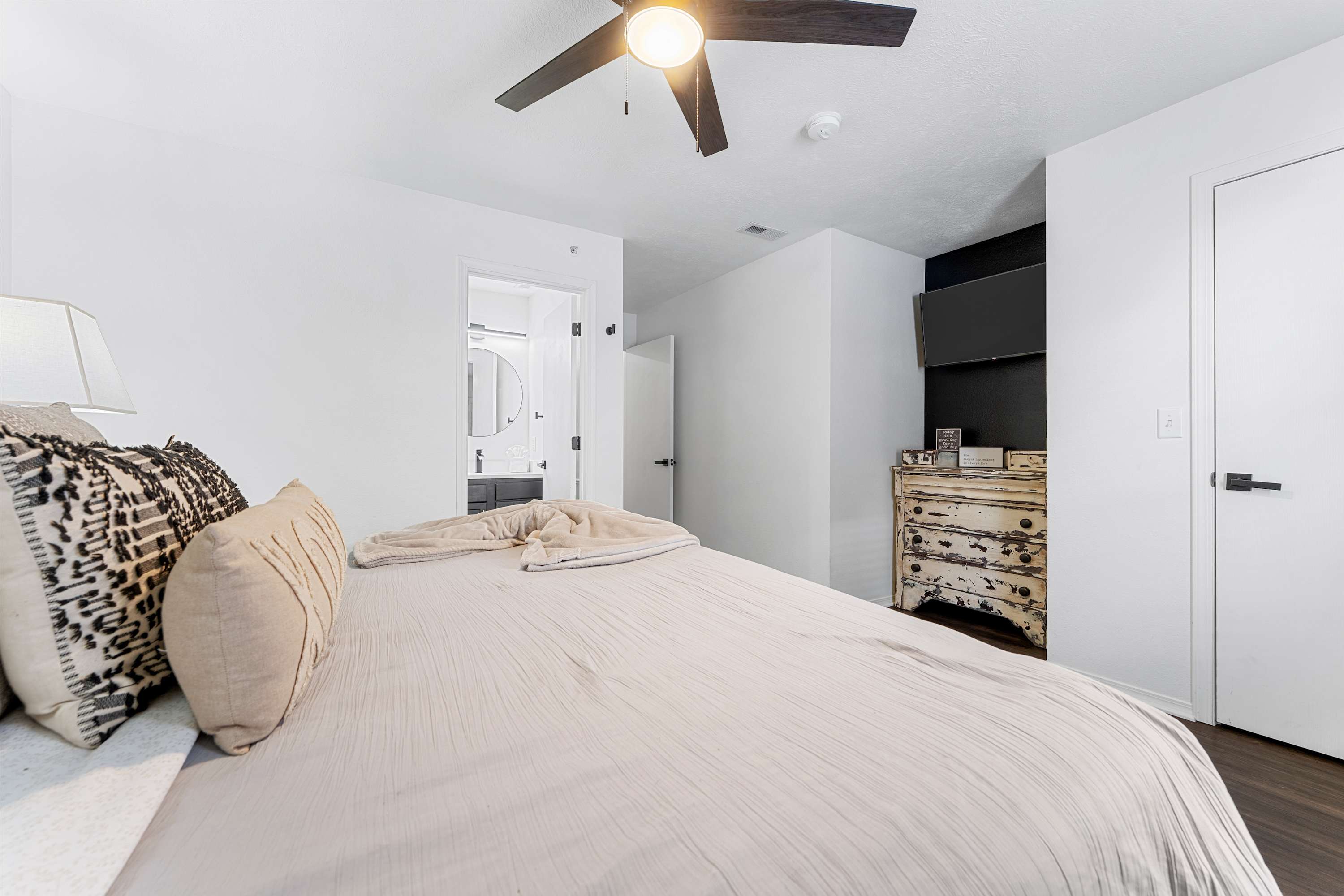 Bedroom #1 includes a king size bed, a smart TV, and an ensuite bathroom with a single vanity and a shower/tub combo.