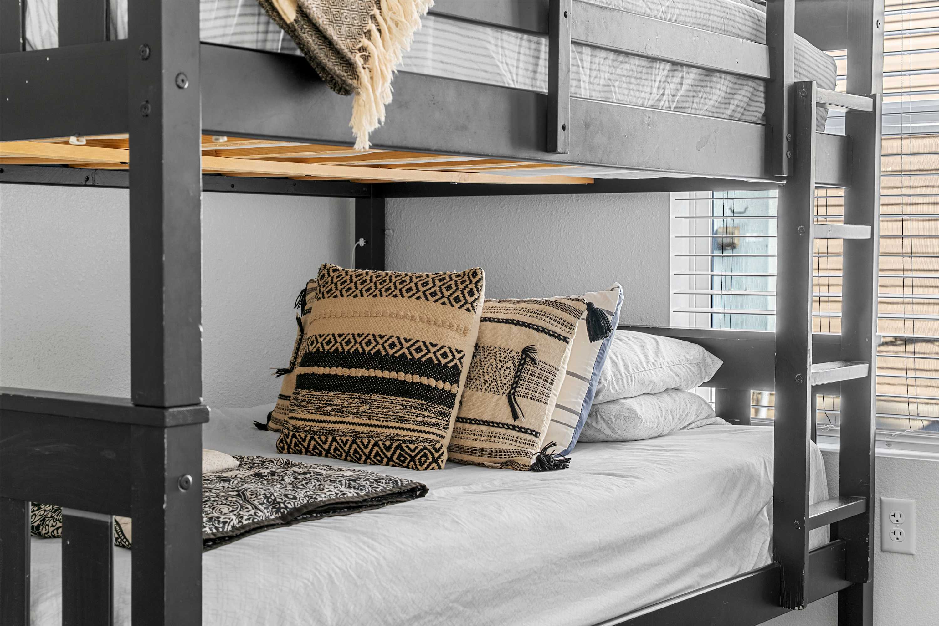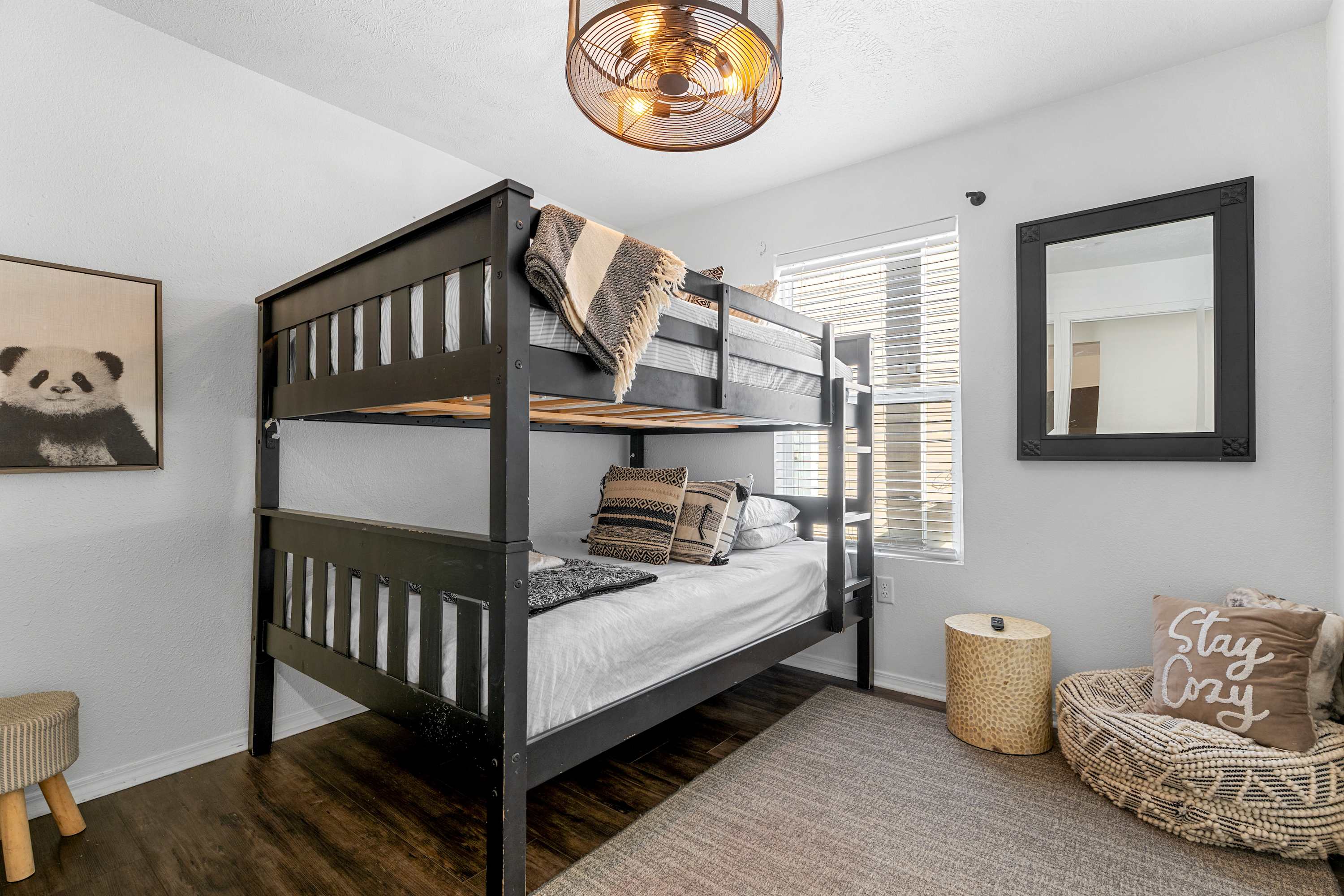 Bedroom #2 includes a set of queen-over-queen bunk beds and a smart TV.