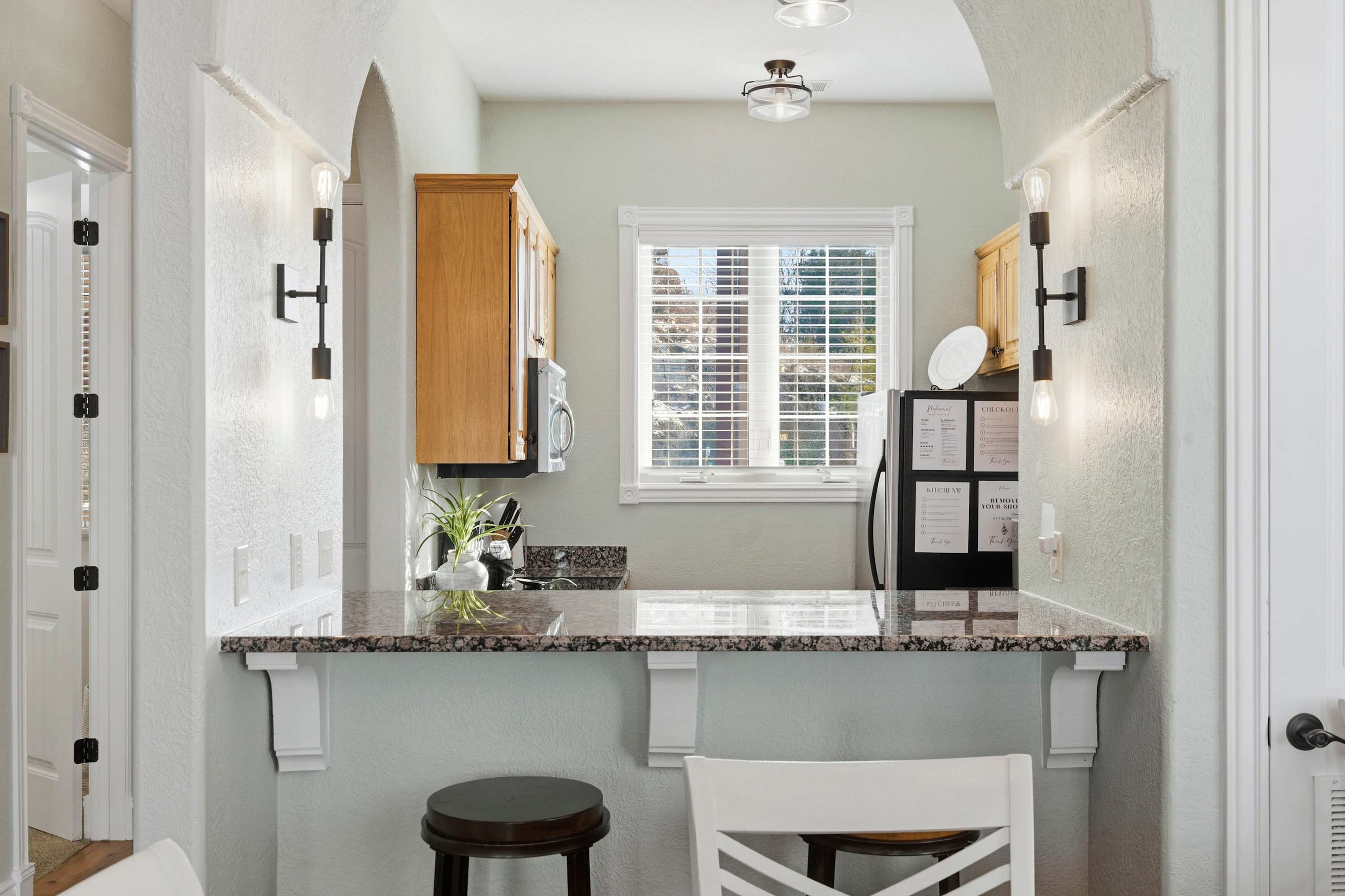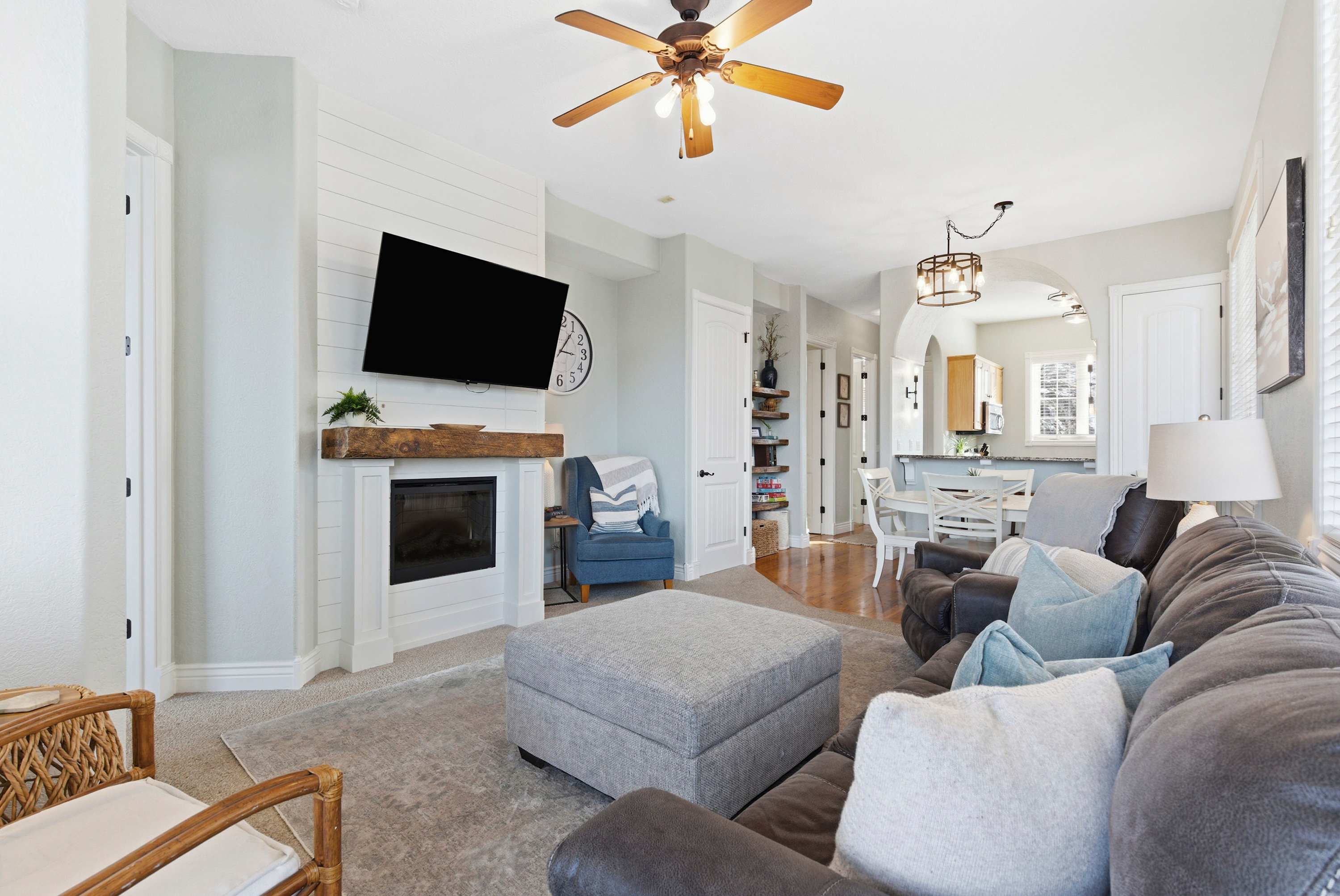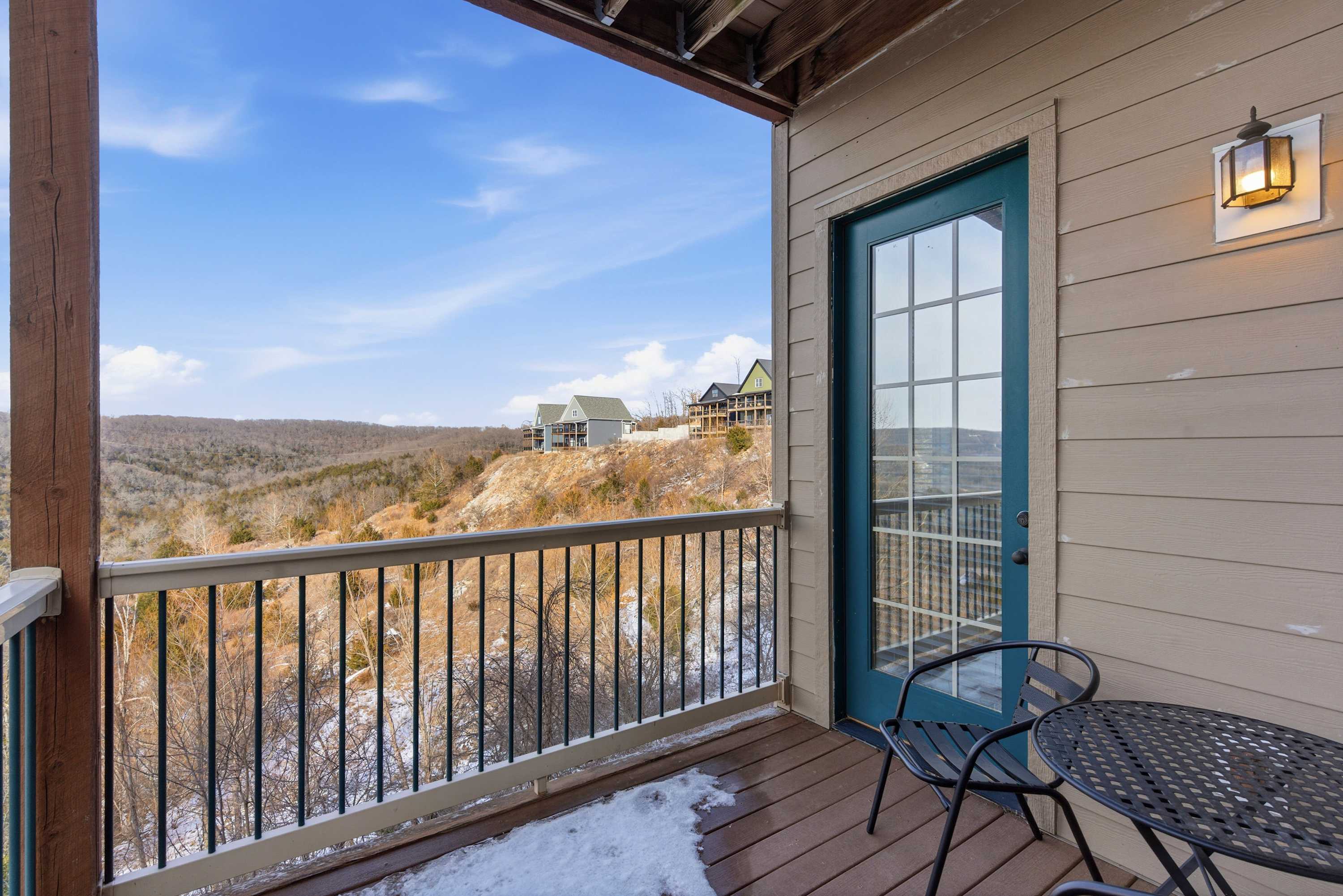 Step inside and feel instantly at home in the inviting living room, where a cozy sofa and armchairs gather around a decorative fireplace—ideal for relaxing evenings with board games or your favorite shows on the smart TV. The compact yet well-equipped kitchen makes meal prep easy, featuring both a drip coffee maker and a Keurig, plus counter seating for two for casual mornings. Just beyond, a dining table for five sits perfectly between the kitchen and living space, creating a natural hub for meals and conversation. Outside, the private deck invites you to linger over al fresco dinners, soaking in peaceful mountain views that make every moment feel like a true Branson escape.