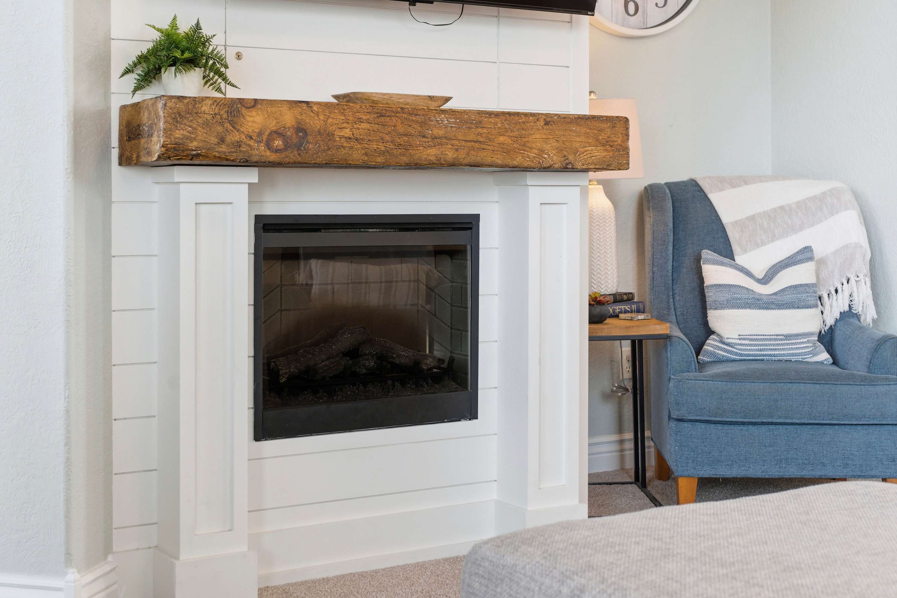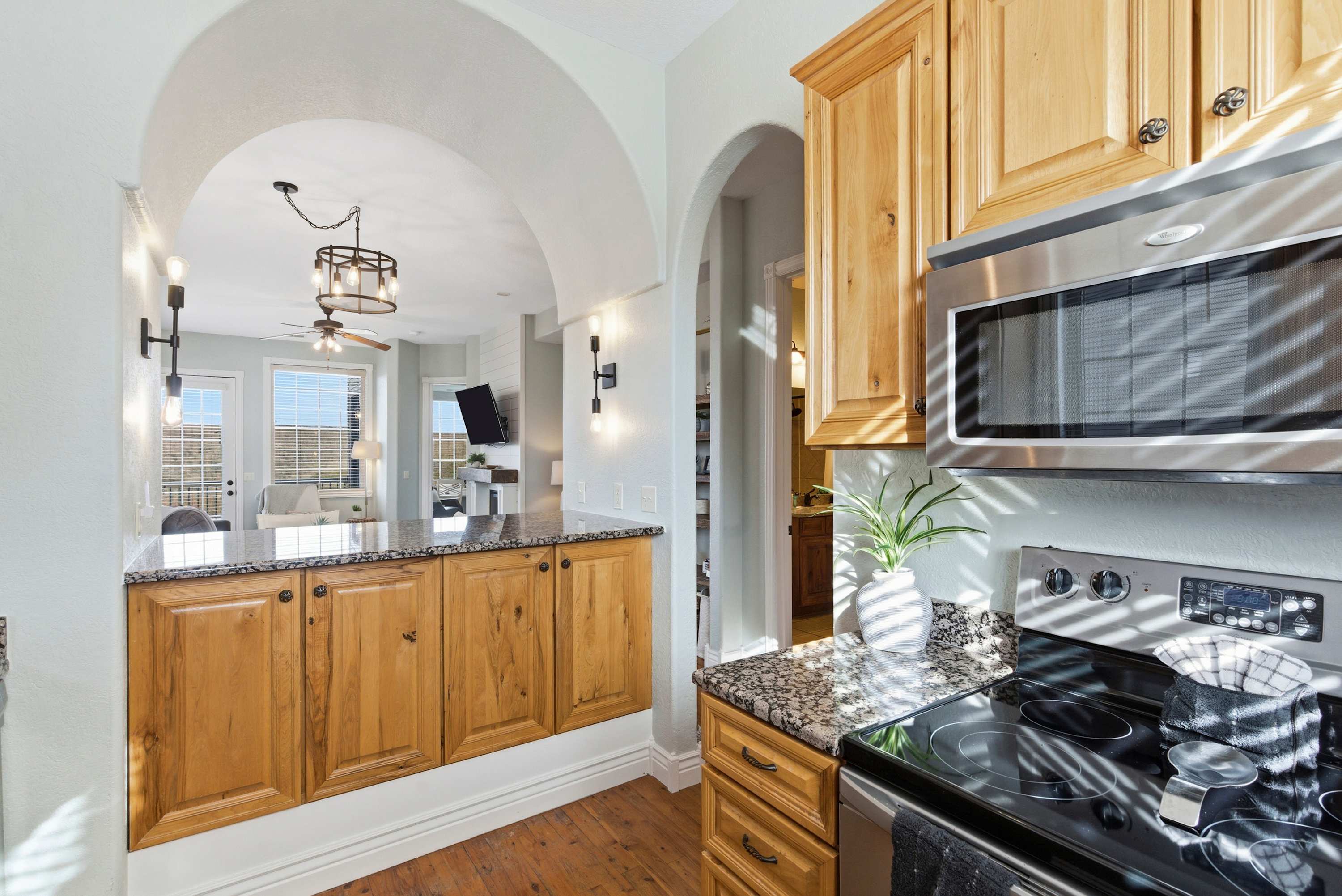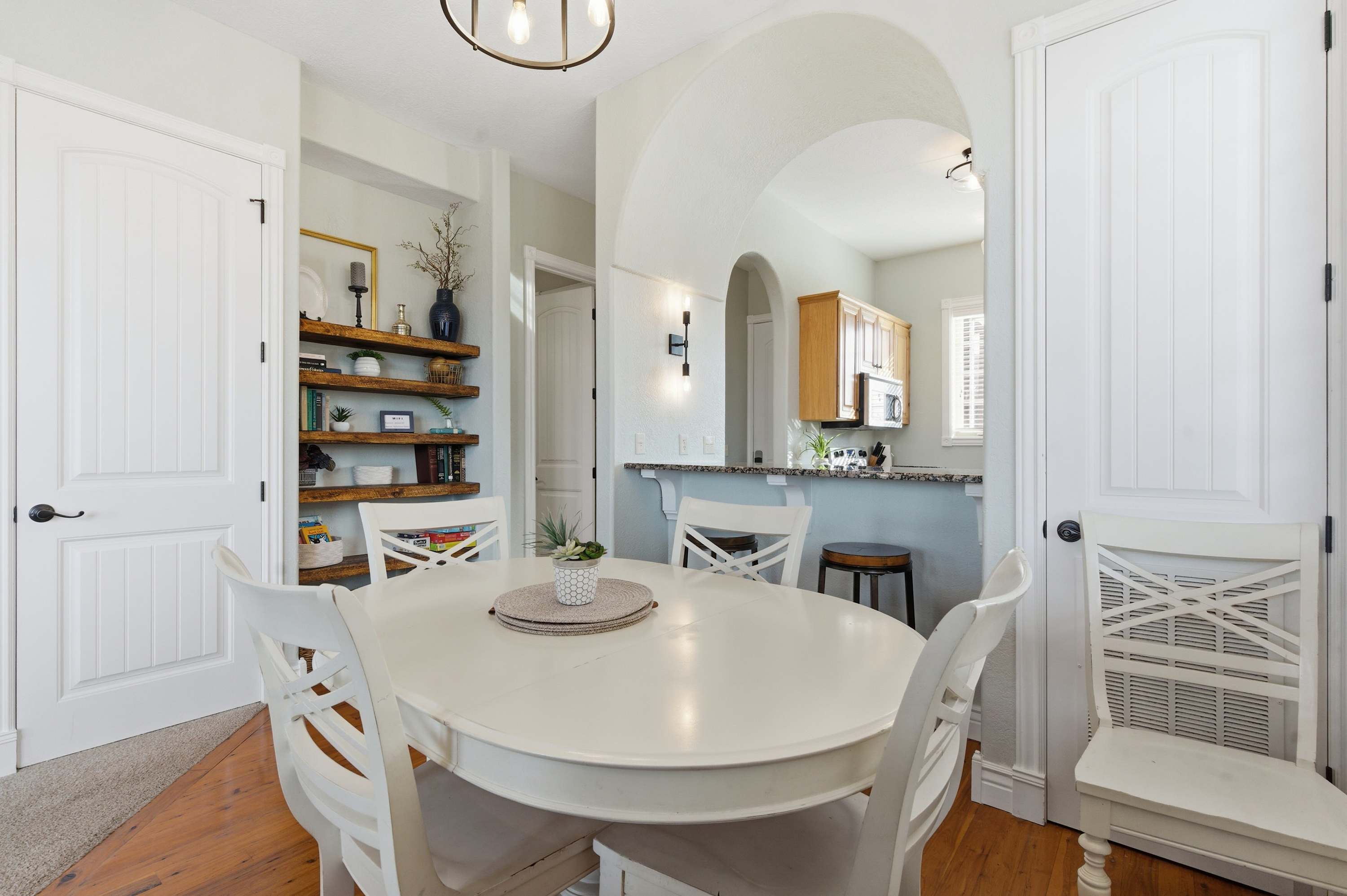 Step inside and feel instantly at home in the inviting living room, where a cozy sofa and armchairs gather around a decorative fireplace—ideal for relaxing evenings with board games or your favorite shows on the smart TV. The compact yet well-equipped kitchen makes meal prep easy, featuring both a drip coffee maker and a Keurig, plus counter seating for two for casual mornings. Just beyond, a dining table for five sits perfectly between the kitchen and living space, creating a natural hub for meals and conversation. Outside, the private deck invites you to linger over al fresco dinners, soaking in peaceful mountain views that make every moment feel like a true Branson escape.